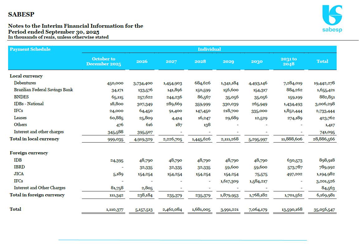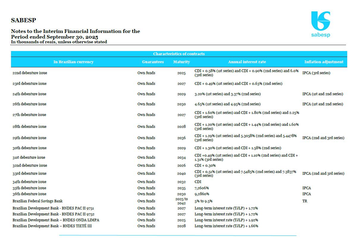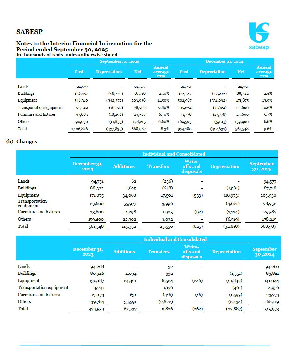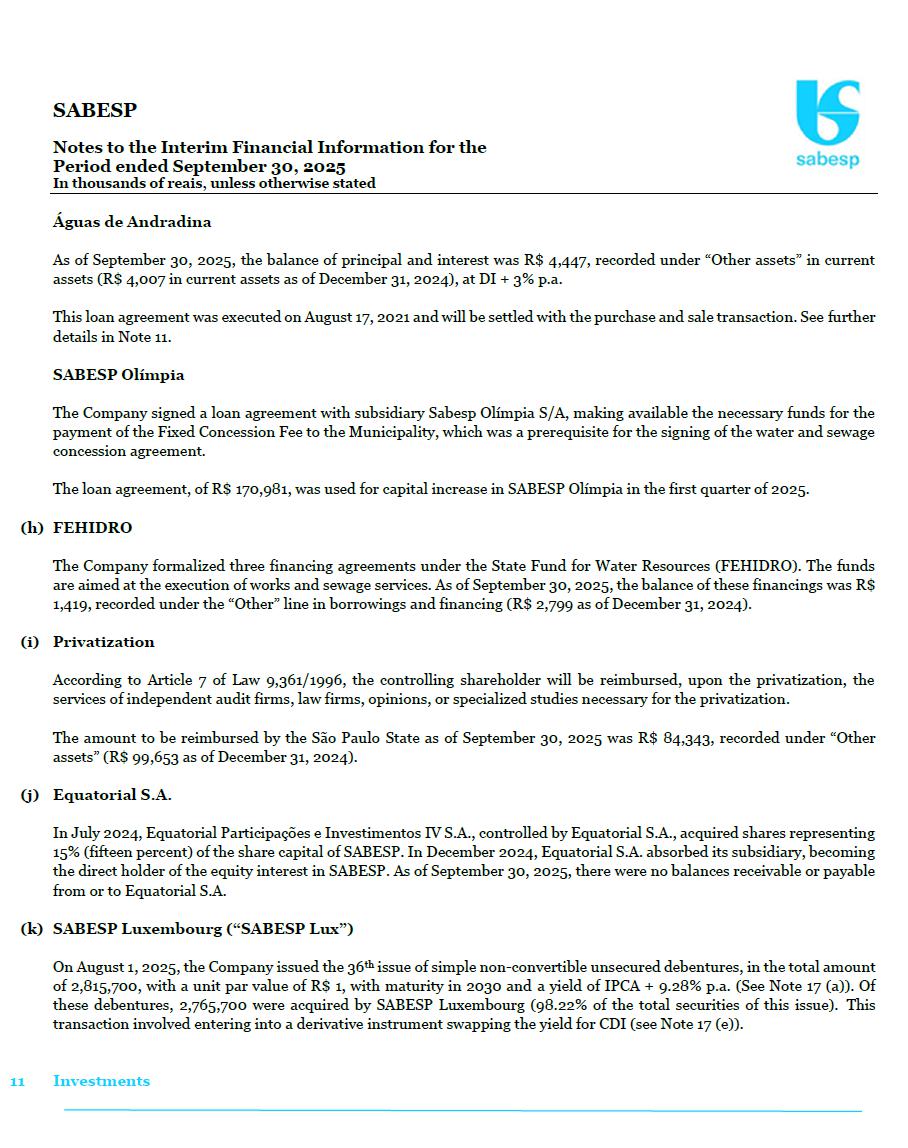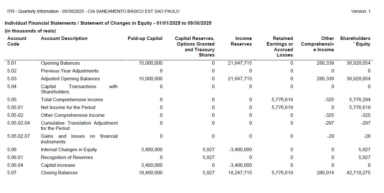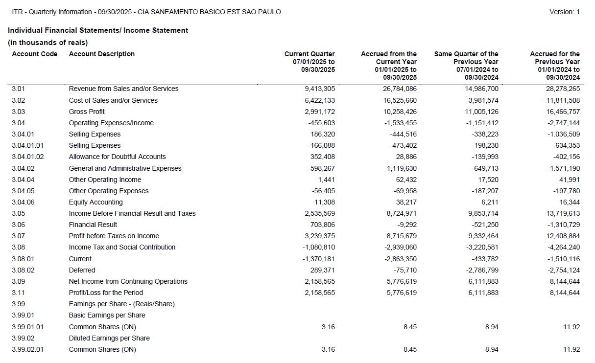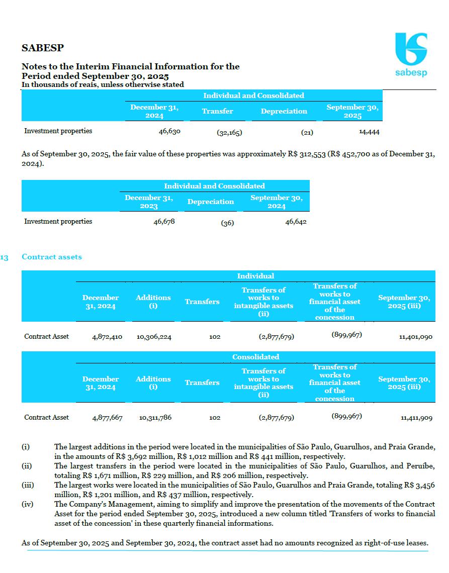ITR - Quarterly Information - 09/30/2025 - CIA SANEAMENTO BASICO EST SAO PAULO Version: 1 Table of Contents Company Information Capital Breakdown 1 Individual Financial Statements Statement of Financial Position - Assets 2 Statement of Financial Position - Liabilities 3 Statement of Profit or Loss 4 Statement of Comprehensive Income 5 Statement of Cash Flows (Indirect Method) 6 Statement of Changes in Equity Statement of Changes in Equity - 01/01/2025 to 09/30/2025 8 Statement of Changes in Equity - 01/01/2024 to 09/30/2024 9 Statement of Value Added 10 Consolidated Financial Statements Statement of Financial Position - Assets 11 Statement of Financial Position - Liabilities 12 Statement of Profit or Loss 13 Statement of Comprehensive Income 14 Statement of Cash Flows (Indirect Method) 15 Statement of Changes in Equity Statement of Changes in Equity - 01/01/2025 to 09/30/2025 17 Statement of Changes in Equity - 01/01/2024 to 09/30/2024 18 Statement of Value Added 19 Comments on the Company’s Performance 20 Notes to the Quarterly Information 28 Reports and Statements Unqualified Report on the Special Review 94 Executive Officer’s Statement on the Financial Statements 95 Executive Officer’s Statement on the Report of Independent Registered Public Accounting Firm 96 ITR - Quarterly Information - 09/30/2025 - CIA SANEAMENTO BASICO EST SAO PAULO Version: 1 Company Information / Capital Breakdown Number of Shares Current Quarter (Units) 09/30/2025 Paid-up Capital Common 683,509,868 Preferred 1 Total 683,509,869 Treasury Shares Common 0 Preferred 0 Total 0 ITR - Quarterly Information - 09/30/2025 - CIA SANEAMENTO BASICO EST SAO PAULO Version: 1 Individual Financial Statements/ Statement of Financial Position – Assets (in thousands of reais) Account Code Account Description Current Quarter 09/30/2025 Previous Year 12/31/2024 1 Total Assets 95,982,957 80,978,272 1.01 Current Assets 17,019,835 10,598,757 1.01.01 Cash and Cash Equivalents 4,966,999 1,681,204 1.01.02 Financial Investments 6,668,814 3,694,029 1.01.03 Accounts Receivable 4,760,763 4,207,466 1.01.03.01 Trade Receivables 4,476,223 3,887,952 1.01.03.02 Other Receivables 284,540 319,514 1.01.03.02.01 Related-Party Balances 284,540 319,514 1.01.04 Inventories 28,536 10,524 1.01.06 Taxes Recoverable 425,741 800,797 1.01.08 Other Current Assets 168,982 204,737 1.01.08.03 Others 168,982 204,737 1.01.08.03.01 Restricted Cash 55,481 37,715 1.01.08.03.02 Derivative financial instruments 0 67,440 1.01.08.03.20 Other Assets 113,501 99,582 1.02 Non-Current Assets 78,963,122 70,379,515 1.02.01 Long-Term Assets 32,054,871 24,927,066 1.02.01.03 Financial Investments Valued at the Amortized Cost 0 769,057 1.02.01.04 Accounts Receivable 256,057 327,798 1.02.01.04.01 Trade Receivables 256,057 327,798 1.02.01.09 Receivables from Related Parties 882,029 908,875 1.02.01.10 Other Non-Current Assets 30,916,785 22,921,336 1.02.01.10.04 Escrow Deposits 130,781 139,222 1.02.01.10.05 Water and Basic Sanitation National Agency - ANA 2,157 1,993 1.02.01.10.06 Contract Assets 11,401,090 4,872,410 1.02.01.10.07 Financial Assets 19,348,193 17,601,626 1.02.01.10.20 Other Assets 34,564 306,085 1.02.02 Investments 413,974 262,433 1.02.02.01 Equity Interests 399,530 215,803 1.02.02.02 Investment properties 14,444 46,630 1.02.03 Property, plant, and equipment 668,987 561,548 1.02.04 Intangible assets 45,825,290 44,628,468 ITR - Quarterly Information - 09/30/2025 - CIA SANEAMENTO BASICO EST SAO PAULO Version: 1 Individual Financial Statements/ Statement of Financial Position - Liabilities (in thousands of reais) Account Code Account Description Current Quarter 09/30/2025 Previous Year 12/31/2024 2 Total Liabilities 95,982,957 80,978,272 2.01 Current Liabilities 14,434,328 11,968,321 2.01.01 Social and Labor obligations 1,120,534 1,286,193 2.01.02 Trade Payables 1,523,474 768,371 2.01.03 Tax Obligations 733,704 589,110 2.01.04 Borrowings and Financings 5,797,790 3,133,850 2.01.05 Other Obligations 3,927,261 4,644,613 2.01.05.02 Others 3,927,261 4,644,613 2.01.05.02.01 Dividends and Interest on Equity Payable 1,532 2,275,890 2.01.05.02.04 Services Payable 2,250,981 1,434,998 2.01.05.02.07 Public-Private Partnership - PPP 465,028 452,323 2.01.05.02.10 Performance Agreements 222,642 287,109 2.01.05.02.11 Deferred PIS/Cofins 74,117 0 2.01.05.02.12 Derivative financial instruments 714,842 0 2.01.05.02.20 Other Obligations 198,119 194,293 2.01.06 Provisions 1,331,565 1,546,184 2.02 Non-current Liabilities 38,838,354 32,081,897 2.02.01 Borrowings and Financings 29,258,757 22,124,447 2.02.02 Other Obligations 6,362,539 6,400,064 2.02.02.02 Others 6,362,539 6,400,064 2.02.02.02.04 Social Security Obligations 1,949,210 1,931,145 2.02.02.02.06 Public-Private Partnership - PPP 2,857,070 2,853,896 2.02.02.02.09 Deferred PIS/Cofins 1,117,146 1,117,804 2.02.02.02.10 Performance Agreements 100,608 137,441 2.02.02.02.20 Other Obligations 338,505 359,778 2.02.03 Deferred taxes 2,737,586 2,661,891 2.02.03.01 Deferred Income Tax and Social Contribution 2,737,586 2,661,891 2.02.04 Provisions 479,472 895,495 2.03 Equity 42,710,275 36,928,054 2.03.01 Paid-Up Capital 18,400,000 15,000,000 2.03.02 Capital Reserves 5,927 0 2.03.04 Profit Reserves 18,247,715 21,647,715 2.03.04.01 Legal Reserve 2,343,583 2,343,583 2.03.04.10 Investment Reserve 15,904,132 19,304,132 2.03.05 Retained Earnings/ Accumulated Losses 5,776,619 0 2.03.06 Equity Valuation Adjustments 280,014 280,339 ITR - Quarterly Information - 09/30/2025 - CIA SANEAMENTO BASICO EST SAO PAULO Version: 1 Individual Financial Statements/ Income Statement (in thousands of reais) Account Code Account Description Current Quarter 07/01/2025 to 09/30/2025 Accrued from the Current Year 01/01/2025 to 09/30/2025 Same Quarter of the Previous Year 07/01/2024 to 09/30/2024 Accrued for the Previous Year 01/01/2024 to 09/30/2024 3.01 Revenue from Sales and/or Services 9,413,305 26,784,086 14,986,700 28,278,265 3.02 Cost of Sales and/or Services -6,42