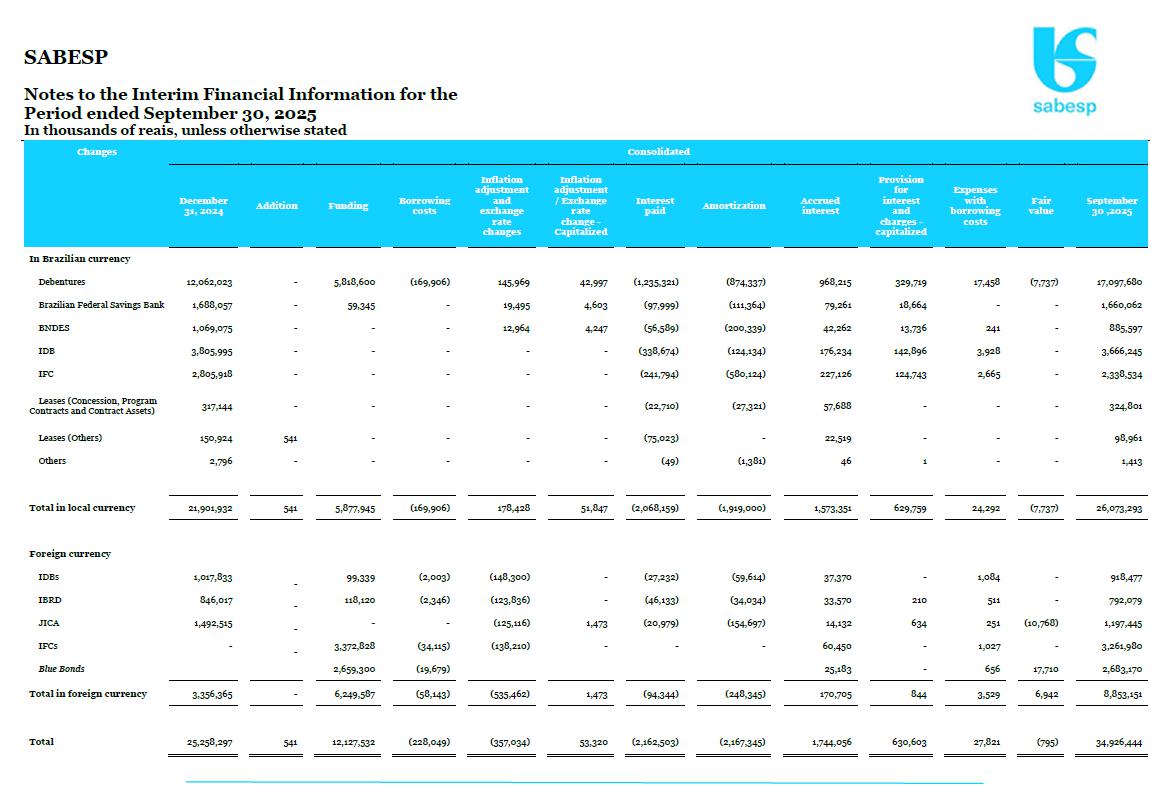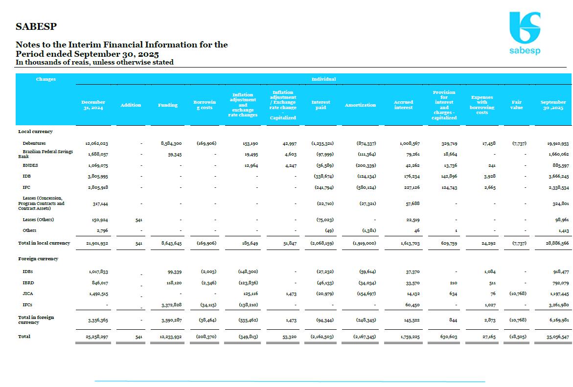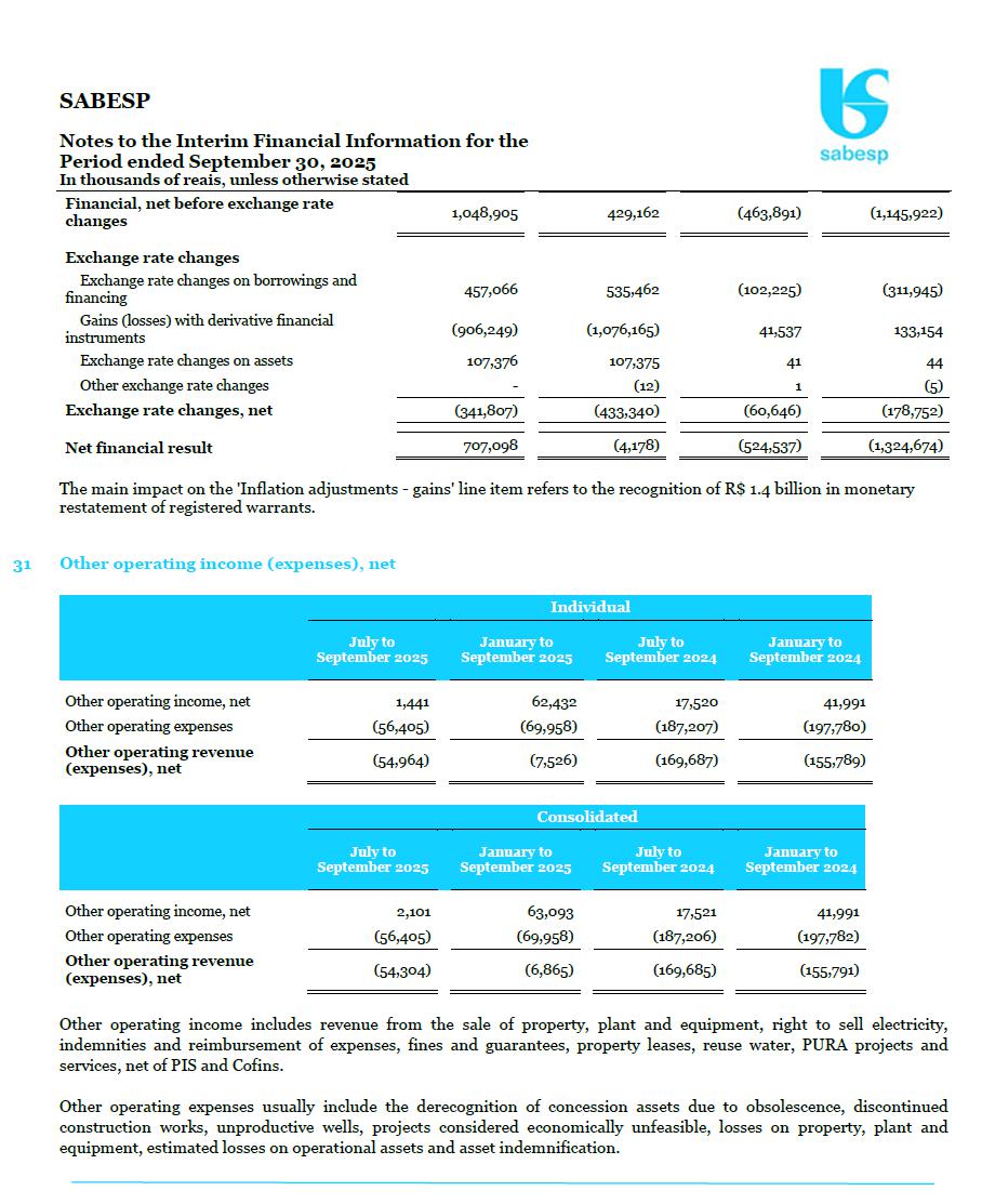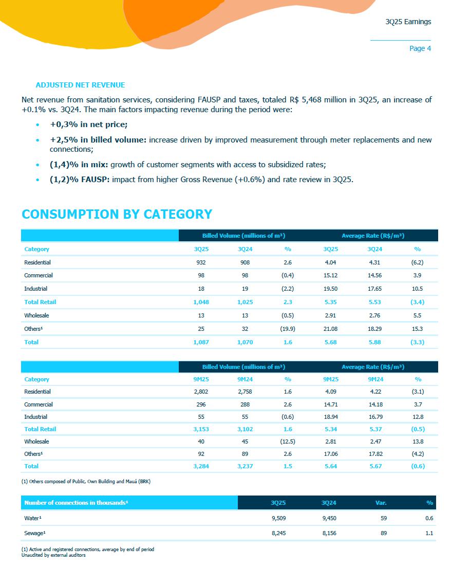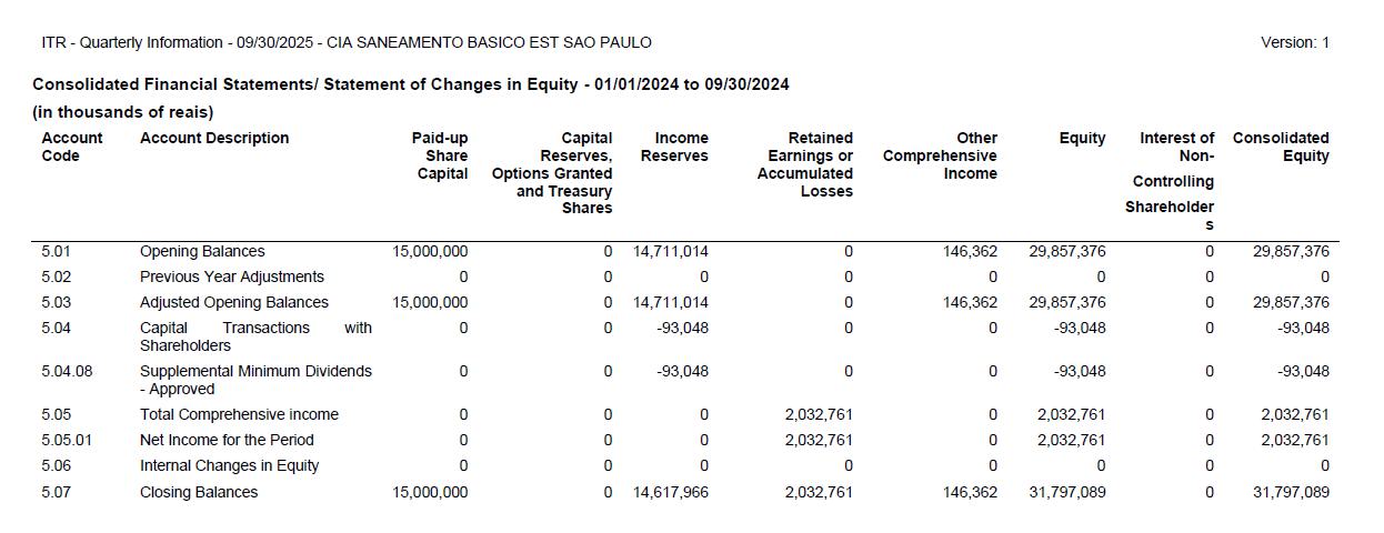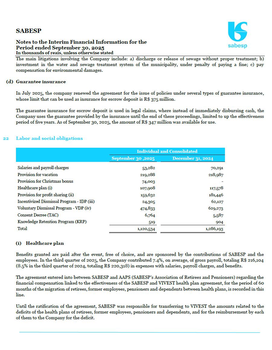 ITR - Quarterly Information - 09/30/2025 - CIA SANEAMENTO BASICO EST SAO PAULO Version: 1 Table of Contents Company Information Capital Breakdown 1 Individual Financial Statements Statement of Financial Position - Assets 2 Statement of Financial Position - Liabilities 3 Statement of Profit or Loss 4 Statement of Comprehensive Income 5 Statement of Cash Flows (Indirect Method) 6 Statement of Changes in Equity Statement of Changes in Equity - 01/01/2025 to 09/30/2025 8 Statement of Changes in Equity - 01/01/2024 to 09/30/2024 9 Statement of Value Added 10 Consolidated Financial Statements Statement of Financial Position - Assets 11 Statement of Financial Position - Liabilities 12 Statement of Profit or Loss 13 Statement of Comprehensive Income 14 Statement of Cash Flows (Indirect Method) 15 Statement of Changes in Equity Statement of Changes in Equity - 01/01/2025 to 09/30/2025 17 Statement of Changes in Equity - 01/01/2024 to 09/30/2024 18 Statement of Value Added 19 Comments on the Company’s Performance 20 Notes to the Quarterly Information 28 Reports and Statements Unqualified Report on the Special Review 94 Executive Officer’s Statement on the Financial Statements 95 Executive Officer’s Statement on the Report of Independent Registered Public Accounting Firm 96 ITR - Quarterly Information - 09/30/2025 - CIA SANEAMENTO BASICO EST SAO PAULO Version: 1 Company Information / Capital Breakdown Number of Shares Current Quarter (Units) 09/30/2025 Paid-up Capital Common 683,509,868 Preferred 1 Total 683,509,869 Treasury Shares Common 0 Preferred 0 Total 0 ITR - Quarterly Information - 09/30/2025 - CIA SANEAMENTO BASICO EST SAO PAULO Version: 1 Individual Financial Statements/ Statement of Financial Position – Assets (in thousands of reais) Account Code Account Description Current Quarter 09/30/2025 Previous Year 12/31/2024 1 Total Assets 95,982,957 80,978,272 1.01 Current Assets 17,019,835 10,598,757 1.01.01 Cash and Cash Equivalents 4,966,999 1,681,204 1.01.02 Financial Investments 6,668,814 3,694,029 1.01.03 Accounts Receivable 4,760,763 4,207,466 1.01.03.01 Trade Receivables 4,476,223 3,887,952 1.01.03.02 Other Receivables 284,540 319,514 1.01.03.02.01 Related-Party Balances 284,540 319,514 1.01.04 Inventories 28,536 10,524 1.01.06 Taxes Recoverable 425,741 800,797 1.01.08 Other Current Assets 168,982 204,737 1.01.08.03 Others 168,982 204,737 1.01.08.03.01 Restricted Cash 55,481 37,715 1.01.08.03.02 Derivative financial instruments 0 67,440 1.01.08.03.20 Other Assets 113,501 99,582 1.02 Non-Current Assets 78,963,122 70,379,515 1.02.01 Long-Term Assets 32,054,871 24,927,066 1.02.01.03 Financial Investments Valued at the Amortized Cost 0 769,057 1.02.01.04 Accounts Receivable 256,057 327,798 1.02.01.04.01 Trade Receivables 256,057 327,798 1.02.01.09 Receivables from Related Parties 882,029 908,875 1.02.01.10 Other Non-Current Assets 30,916,785 22,921,336 1.02.01.10.04 Escrow Deposits 130,781 139,222 1.02.01.10.05 Water and Basic Sanitation National Agency - ANA 2,157 1,993 1.02.01.10.06 Contract Assets 11,401,090 4,872,410 1.02.01.10.07 Financial Assets 19,348,193 17,601,626 1.02.01.10.20 Other Assets 34,564 306,085 1.02.02 Investments 413,974 262,433 1.02.02.01 Equity Interests 399,530 215,803 1.02.02.02 Investment properties 14,444 46,630 1.02.03 Property, plant, and equipment 668,987 561,548 1.02.04 Intangible assets 45,825,290 44,628,468 ITR - Quarterly Information - 09/30/2025 - CIA SANEAMENTO BASICO EST SAO PAULO Version: 1 Individual Financial Statements/ Statement of Financial Position - Liabilities (in thousands of reais) Account Code Account Description Current Quarter 09/30/2025 Previous Year 12/31/2024 2 Total Liabilities 95,982,957 80,978,272 2.01 Current Liabilities 14,434,328 11,968,321 2.01.01 Social and Labor obligations 1,120,534 1,286,193 2.01.02 Trade Payables 1,523,474 768,371 2.01.03 Tax Obligations 733,704 589,110 2.01.04 Borrowings and Financings 5,797,790 3,133,850 2.01.05 Other Obligations 3,927,261 4,644,613 2.01.05.02 Others 3,927,261 4,644,613 2.01.05.02.01 Dividends and Interest on Equity Payable 1,532 2,275,890 2.01.05.02.04 Services Payable 2,250,981 1,434,998 2.01.05.02.07 Public-Private Partnership - PPP 465,028 452,323 2.01.05.02.10 Performance Agreements 222,642 287,109 2.01.05.02.11 Deferred PIS/Cofins 74,117 0 2.01.05.02.12 Derivative financial instruments 714,842 0 2.01.05.02.20 Other Obligations 198,119 194,293 2.01.06 Provisions 1,331,565 1,546,184 2.02 Non-current Liabilities 38,838,354 32,081,897 2.02.01 Borrowings and Financings 29,258,757 22,124,447 2.02.02 Other Obligations 6,362,539 6,400,064 2.02.02.02 Others 6,362,539 6,400,064 2.02.02.02.04 Social Security Obligations 1,949,210 1,931,145 2.02.02.02.06 Public-Private Partnership - PPP 2,857,070 2,853,896 2.02.02.02.09 Deferred PIS/Cofins 1,117,146 1,117,804 2.02.02.02.10 Performance Agreements 100,608 137,441 2.02.02.02.20 Other Obligations 338,505 359,778 2.02.03 Deferred taxes 2,737,586 2,661,891 2.02.03.01 Deferred Income Tax and Social Contribution 2,737,586 2,661,891 2.02.04 Provisions 479,472 895,495 2.03 Equity 42,710,275 36,928,054 2.03.01 Paid-Up Capital 18,400,000 15,000,000 2.03.02 Capital Reserves 5,927 0 2.03.04 Profit Reserves 18,247,715 21,647,715 2.03.04.01 Legal Reserve 2,343,583 2,343,583 2.03.04.10 Investment Reserve 15,904,132 19,304,132 2.03.05 Retained Earnings/ Accumulated Losses 5,776,619 0 2.03.06 Equity Valuation Adjustments 280,014 280,339 ITR - Quarterly Information - 09/30/2025 - CIA SANEAMENTO BASICO EST SAO PAULO Version: 1 Individual Financial Statements/ Income Statement (in thousands of reais) Account Code Account Description Current Quarter 07/01/2025 to 09/30/2025 Accrued from the Current Year 01/01/2025 to 09/30/2025 Same Quarter of the Previous Year 07/01/2024 to 09/30/2024 Accrued for the Previous Year 01/01/2024 to 09/30/2024 3.01 Revenue from Sales and/or Services 9,413,305 26,784,086 14,986,700 28,278,265 3.02 Cost of Sales and/or Services -6,42