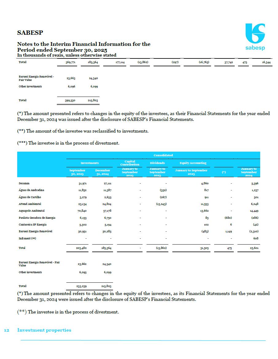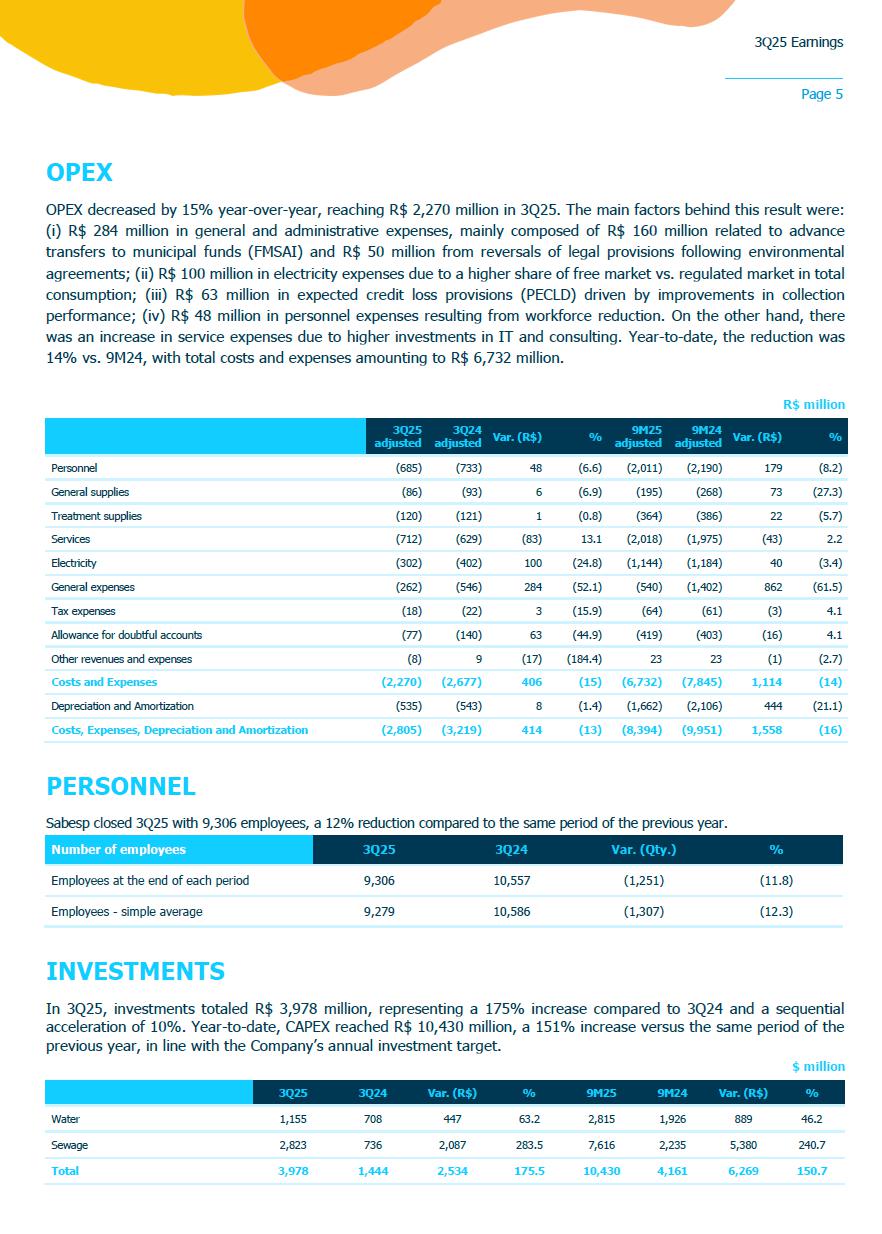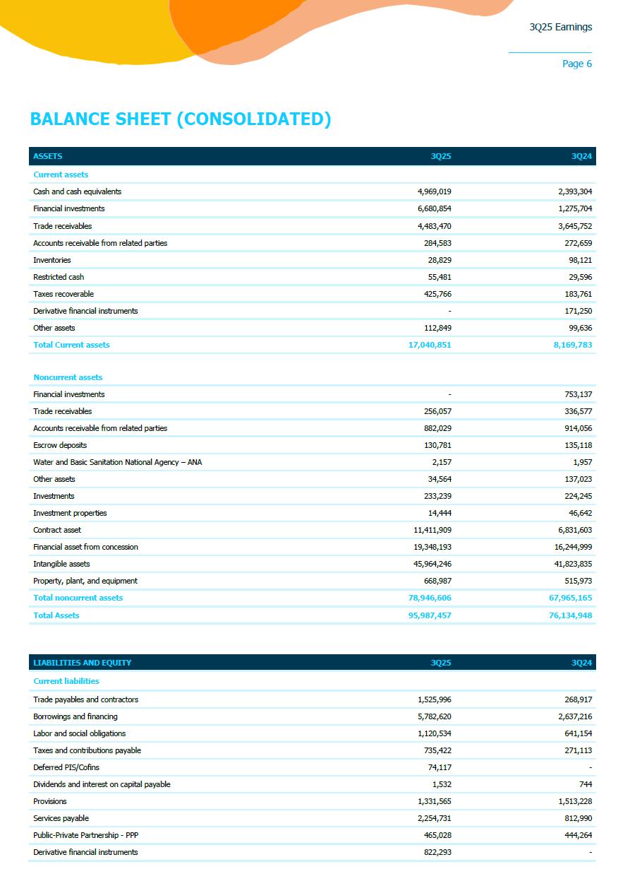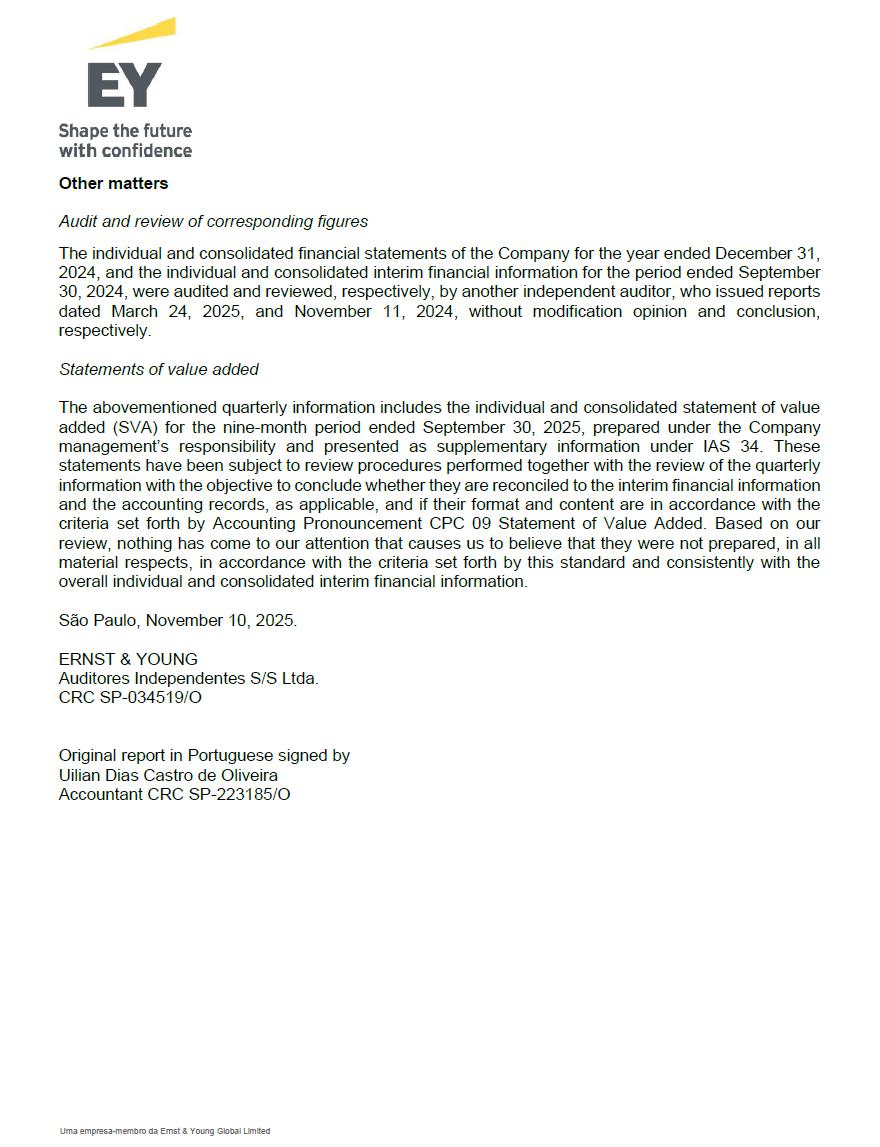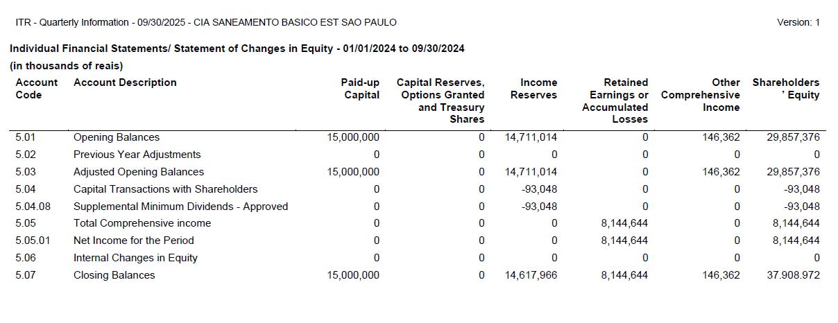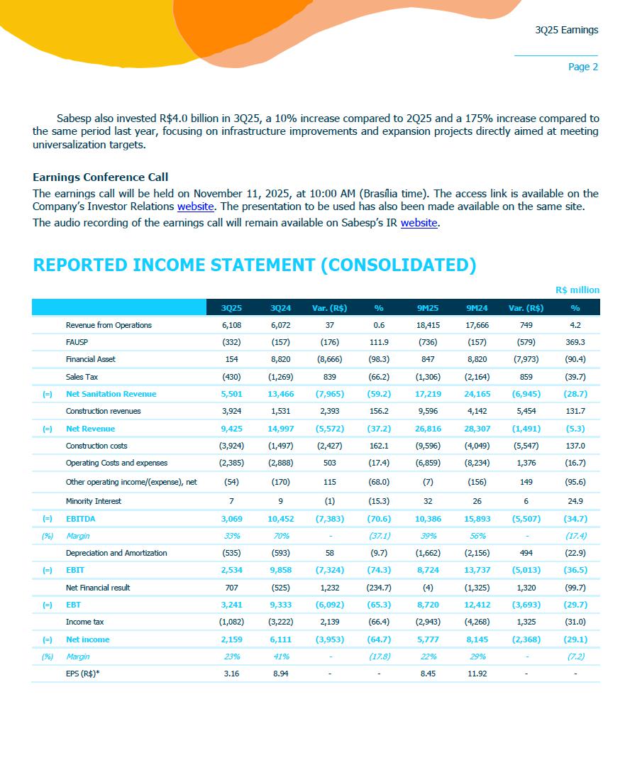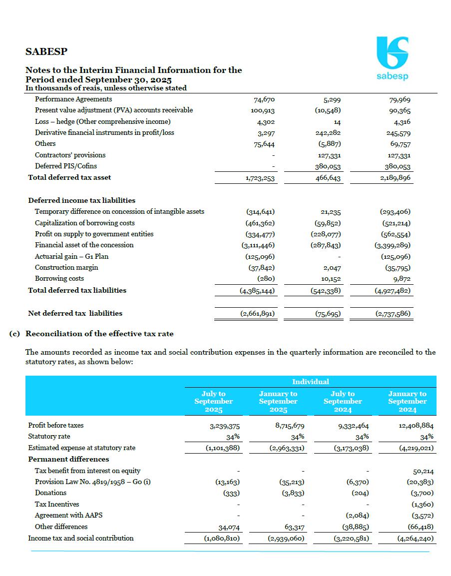 ITR - Quarterly Information - 09/30/2025 - CIA SANEAMENTO BASICO EST SAO PAULO Version: 1 Table of Contents Company Information Capital Breakdown 1 Individual Financial Statements Statement of Financial Position - Assets 2 Statement of Financial Position - Liabilities 3 Statement of Profit or Loss 4 Statement of Comprehensive Income 5 Statement of Cash Flows (Indirect Method) 6 Statement of Changes in Equity Statement of Changes in Equity - 01/01/2025 to 09/30/2025 8 Statement of Changes in Equity - 01/01/2024 to 09/30/2024 9 Statement of Value Added 10 Consolidated Financial Statements Statement of Financial Position - Assets 11 Statement of Financial Position - Liabilities 12 Statement of Profit or Loss 13 Statement of Comprehensive Income 14 Statement of Cash Flows (Indirect Method) 15 Statement of Changes in Equity Statement of Changes in Equity - 01/01/2025 to 09/30/2025 17 Statement of Changes in Equity - 01/01/2024 to 09/30/2024 18 Statement of Value Added 19 Comments on the Company’s Performance 20 Notes to the Quarterly Information 28 Reports and Statements Unqualified Report on the Special Review 94 Executive Officer’s Statement on the Financial Statements 95 Executive Officer’s Statement on the Report of Independent Registered Public Accounting Firm 96 ITR - Quarterly Information - 09/30/2025 - CIA SANEAMENTO BASICO EST SAO PAULO Version: 1 Company Information / Capital Breakdown Number of Shares Current Quarter (Units) 09/30/2025 Paid-up Capital Common 683,509,868 Preferred 1 Total 683,509,869 Treasury Shares Common 0 Preferred 0 Total 0 ITR - Quarterly Information - 09/30/2025 - CIA SANEAMENTO BASICO EST SAO PAULO Version: 1 Individual Financial Statements/ Statement of Financial Position – Assets (in thousands of reais) Account Code Account Description Current Quarter 09/30/2025 Previous Year 12/31/2024 1 Total Assets 95,982,957 80,978,272 1.01 Current Assets 17,019,835 10,598,757 1.01.01 Cash and Cash Equivalents 4,966,999 1,681,204 1.01.02 Financial Investments 6,668,814 3,694,029 1.01.03 Accounts Receivable 4,760,763 4,207,466 1.01.03.01 Trade Receivables 4,476,223 3,887,952 1.01.03.02 Other Receivables 284,540 319,514 1.01.03.02.01 Related-Party Balances 284,540 319,514 1.01.04 Inventories 28,536 10,524 1.01.06 Taxes Recoverable 425,741 800,797 1.01.08 Other Current Assets 168,982 204,737 1.01.08.03 Others 168,982 204,737 1.01.08.03.01 Restricted Cash 55,481 37,715 1.01.08.03.02 Derivative financial instruments 0 67,440 1.01.08.03.20 Other Assets 113,501 99,582 1.02 Non-Current Assets 78,963,122 70,379,515 1.02.01 Long-Term Assets 32,054,871 24,927,066 1.02.01.03 Financial Investments Valued at the Amortized Cost 0 769,057 1.02.01.04 Accounts Receivable 256,057 327,798 1.02.01.04.01 Trade Receivables 256,057 327,798 1.02.01.09 Receivables from Related Parties 882,029 908,875 1.02.01.10 Other Non-Current Assets 30,916,785 22,921,336 1.02.01.10.04 Escrow Deposits 130,781 139,222 1.02.01.10.05 Water and Basic Sanitation National Agency - ANA 2,157 1,993 1.02.01.10.06 Contract Assets 11,401,090 4,872,410 1.02.01.10.07 Financial Assets 19,348,193 17,601,626 1.02.01.10.20 Other Assets 34,564 306,085 1.02.02 Investments 413,974 262,433 1.02.02.01 Equity Interests 399,530 215,803 1.02.02.02 Investment properties 14,444 46,630 1.02.03 Property, plant, and equipment 668,987 561,548 1.02.04 Intangible assets 45,825,290 44,628,468 ITR - Quarterly Information - 09/30/2025 - CIA SANEAMENTO BASICO EST SAO PAULO Version: 1 Individual Financial Statements/ Statement of Financial Position - Liabilities (in thousands of reais) Account Code Account Description Current Quarter 09/30/2025 Previous Year 12/31/2024 2 Total Liabilities 95,982,957 80,978,272 2.01 Current Liabilities 14,434,328 11,968,321 2.01.01 Social and Labor obligations 1,120,534 1,286,193 2.01.02 Trade Payables 1,523,474 768,371 2.01.03 Tax Obligations 733,704 589,110 2.01.04 Borrowings and Financings 5,797,790 3,133,850 2.01.05 Other Obligations 3,927,261 4,644,613 2.01.05.02 Others 3,927,261 4,644,613 2.01.05.02.01 Dividends and Interest on Equity Payable 1,532 2,275,890 2.01.05.02.04 Services Payable 2,250,981 1,434,998 2.01.05.02.07 Public-Private Partnership - PPP 465,028 452,323 2.01.05.02.10 Performance Agreements 222,642 287,109 2.01.05.02.11 Deferred PIS/Cofins 74,117 0 2.01.05.02.12 Derivative financial instruments 714,842 0 2.01.05.02.20 Other Obligations 198,119 194,293 2.01.06 Provisions 1,331,565 1,546,184 2.02 Non-current Liabilities 38,838,354 32,081,897 2.02.01 Borrowings and Financings 29,258,757 22,124,447 2.02.02 Other Obligations 6,362,539 6,400,064 2.02.02.02 Others 6,362,539 6,400,064 2.02.02.02.04 Social Security Obligations 1,949,210 1,931,145 2.02.02.02.06 Public-Private Partnership - PPP 2,857,070 2,853,896 2.02.02.02.09 Deferred PIS/Cofins 1,117,146 1,117,804 2.02.02.02.10 Performance Agreements 100,608 137,441 2.02.02.02.20 Other Obligations 338,505 359,778 2.02.03 Deferred taxes 2,737,586 2,661,891 2.02.03.01 Deferred Income Tax and Social Contribution 2,737,586 2,661,891 2.02.04 Provisions 479,472 895,495 2.03 Equity 42,710,275 36,928,054 2.03.01 Paid-Up Capital 18,400,000 15,000,000 2.03.02 Capital Reserves 5,927 0 2.03.04 Profit Reserves 18,247,715 21,647,715 2.03.04.01 Legal Reserve 2,343,583 2,343,583 2.03.04.10 Investment Reserve 15,904,132 19,304,132 2.03.05 Retained Earnings/ Accumulated Losses 5,776,619 0 2.03.06 Equity Valuation Adjustments 280,014 280,339 ITR - Quarterly Information - 09/30/2025 - CIA SANEAMENTO BASICO EST SAO PAULO Version: 1 Individual Financial Statements/ Income Statement (in thousands of reais) Account Code Account Description Current Quarter 07/01/2025 to 09/30/2025 Accrued from the Current Year 01/01/2025 to 09/30/2025 Same Quarter of the Previous Year 07/01/2024 to 09/30/2024 Accrued for the Previous Year 01/01/2024 to 09/30/2024 3.01 Revenue from Sales and/or Services 9,413,305 26,784,086 14,986,700 28,278,265 3.02 Cost of Sales and/or Services -6,42