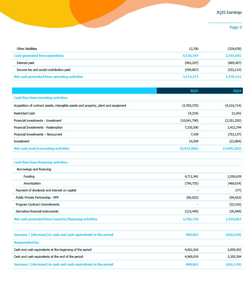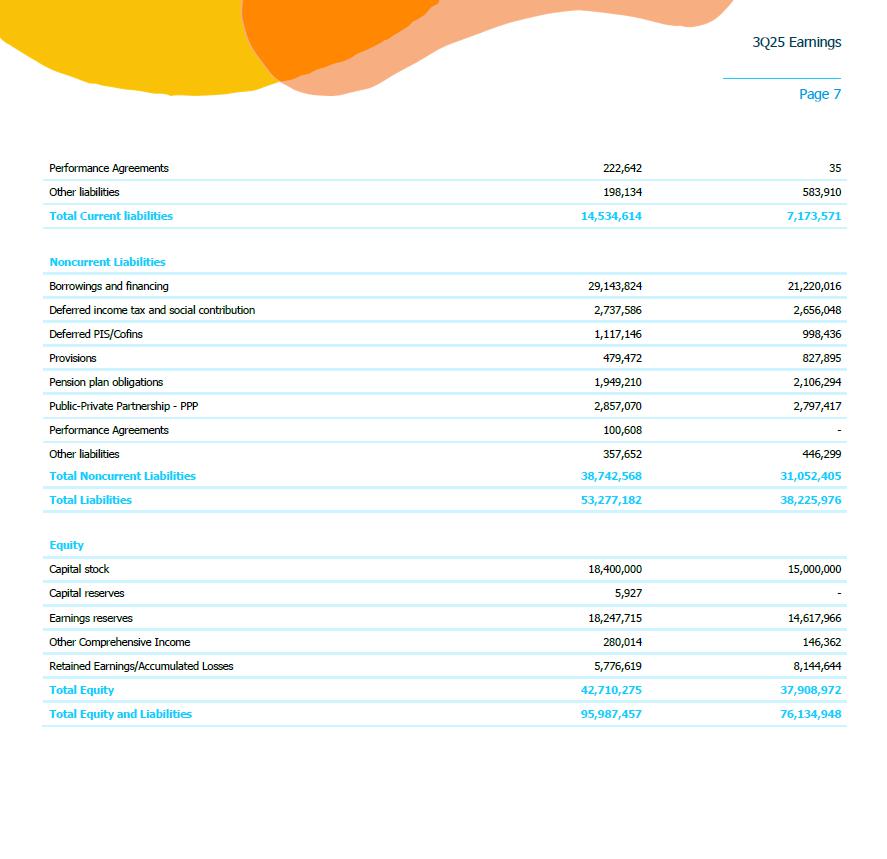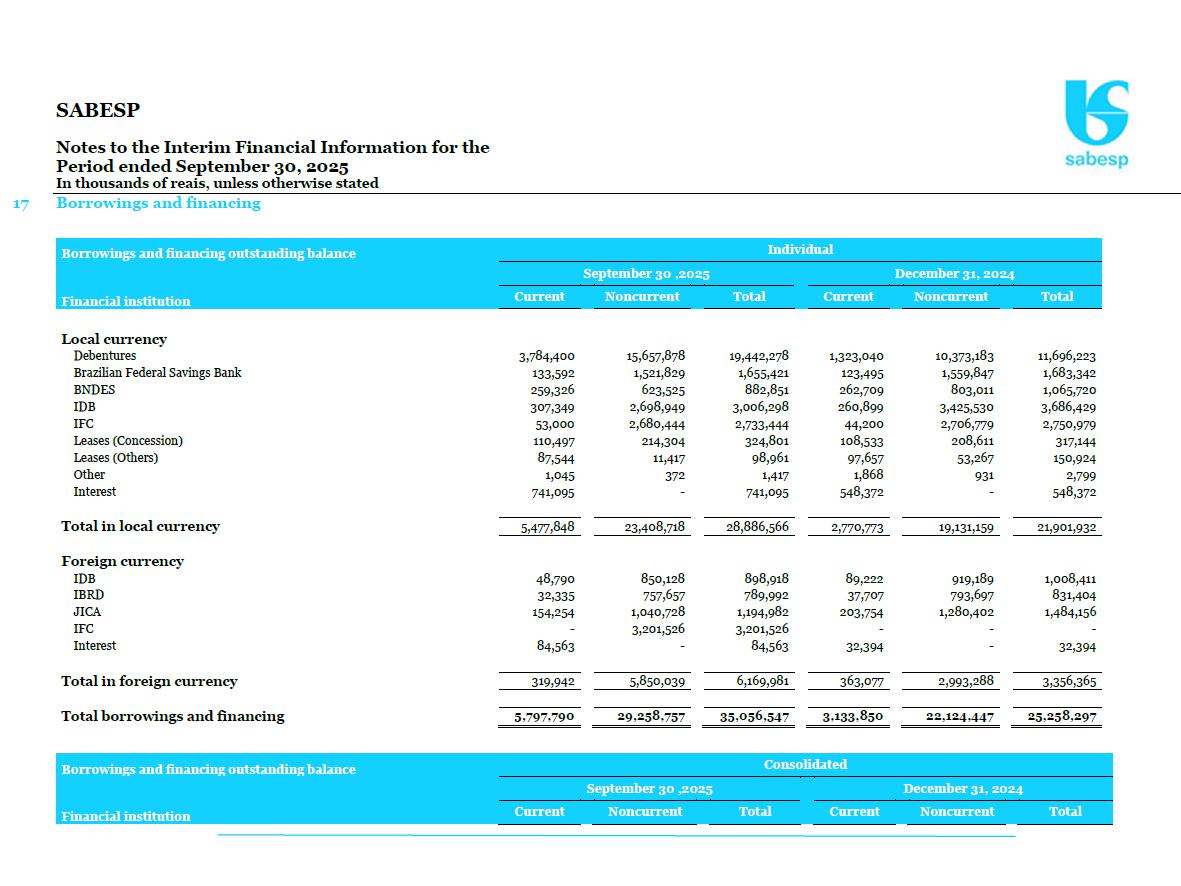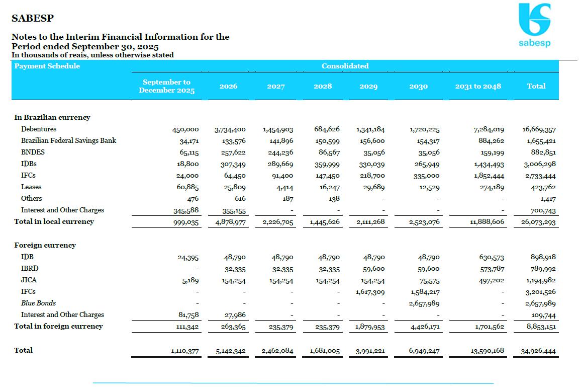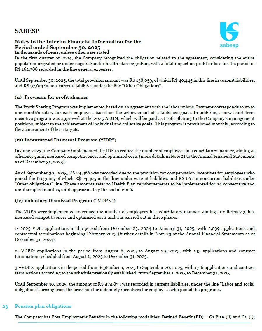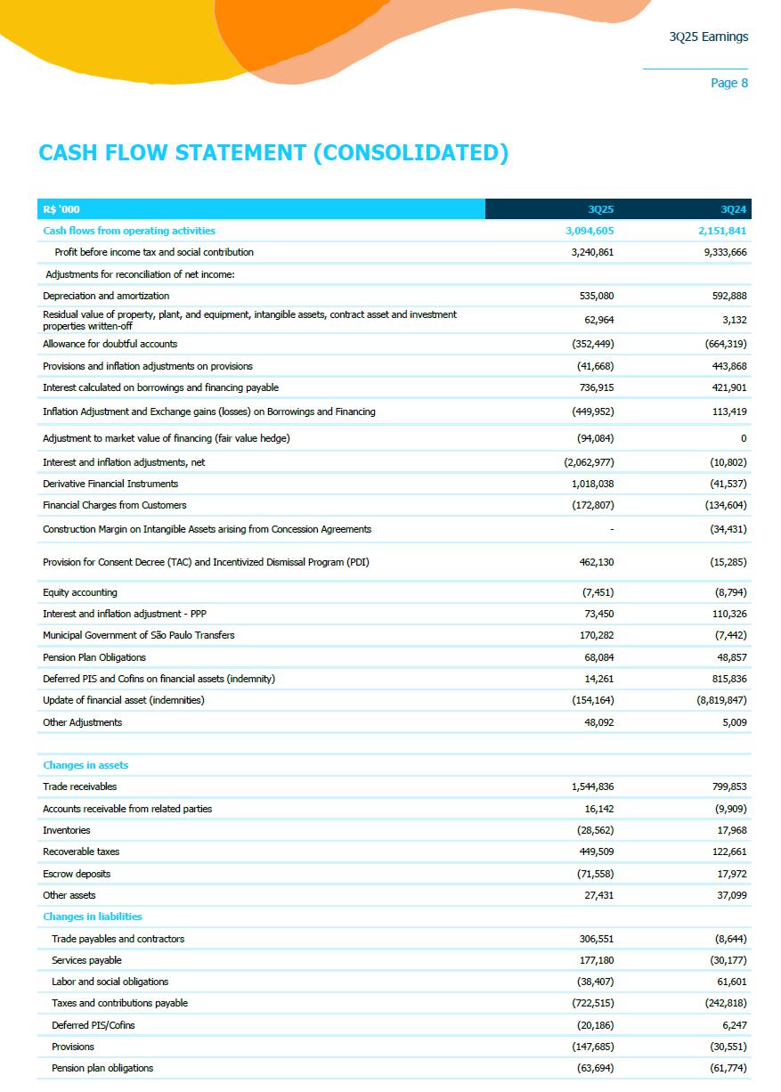 ITR - Quarterly Information - 09/30/2025 - CIA SANEAMENTO BASICO EST SAO PAULO Version: 1 Table of Contents Company Information Capital Breakdown 1 Individual Financial Statements Statement of Financial Position - Assets 2 Statement of Financial Position - Liabilities 3 Statement of Profit or Loss 4 Statement of Comprehensive Income 5 Statement of Cash Flows (Indirect Method) 6 Statement of Changes in Equity Statement of Changes in Equity - 01/01/2025 to 09/30/2025 8 Statement of Changes in Equity - 01/01/2024 to 09/30/2024 9 Statement of Value Added 10 Consolidated Financial Statements Statement of Financial Position - Assets 11 Statement of Financial Position - Liabilities 12 Statement of Profit or Loss 13 Statement of Comprehensive Income 14 Statement of Cash Flows (Indirect Method) 15 Statement of Changes in Equity Statement of Changes in Equity - 01/01/2025 to 09/30/2025 17 Statement of Changes in Equity - 01/01/2024 to 09/30/2024 18 Statement of Value Added 19 Comments on the Company’s Performance 20 Notes to the Quarterly Information 28 Reports and Statements Unqualified Report on the Special Review 94 Executive Officer’s Statement on the Financial Statements 95 Executive Officer’s Statement on the Report of Independent Registered Public Accounting Firm 96 ITR - Quarterly Information - 09/30/2025 - CIA SANEAMENTO BASICO EST SAO PAULO Version: 1 Company Information / Capital Breakdown Number of Shares Current Quarter (Units) 09/30/2025 Paid-up Capital Common 683,509,868 Preferred 1 Total 683,509,869 Treasury Shares Common 0 Preferred 0 Total 0 ITR - Quarterly Information - 09/30/2025 - CIA SANEAMENTO BASICO EST SAO PAULO Version: 1 Individual Financial Statements/ Statement of Financial Position – Assets (in thousands of reais) Account Code Account Description Current Quarter 09/30/2025 Previous Year 12/31/2024 1 Total Assets 95,982,957 80,978,272 1.01 Current Assets 17,019,835 10,598,757 1.01.01 Cash and Cash Equivalents 4,966,999 1,681,204 1.01.02 Financial Investments 6,668,814 3,694,029 1.01.03 Accounts Receivable 4,760,763 4,207,466 1.01.03.01 Trade Receivables 4,476,223 3,887,952 1.01.03.02 Other Receivables 284,540 319,514 1.01.03.02.01 Related-Party Balances 284,540 319,514 1.01.04 Inventories 28,536 10,524 1.01.06 Taxes Recoverable 425,741 800,797 1.01.08 Other Current Assets 168,982 204,737 1.01.08.03 Others 168,982 204,737 1.01.08.03.01 Restricted Cash 55,481 37,715 1.01.08.03.02 Derivative financial instruments 0 67,440 1.01.08.03.20 Other Assets 113,501 99,582 1.02 Non-Current Assets 78,963,122 70,379,515 1.02.01 Long-Term Assets 32,054,871 24,927,066 1.02.01.03 Financial Investments Valued at the Amortized Cost 0 769,057 1.02.01.04 Accounts Receivable 256,057 327,798 1.02.01.04.01 Trade Receivables 256,057 327,798 1.02.01.09 Receivables from Related Parties 882,029 908,875 1.02.01.10 Other Non-Current Assets 30,916,785 22,921,336 1.02.01.10.04 Escrow Deposits 130,781 139,222 1.02.01.10.05 Water and Basic Sanitation National Agency - ANA 2,157 1,993 1.02.01.10.06 Contract Assets 11,401,090 4,872,410 1.02.01.10.07 Financial Assets 19,348,193 17,601,626 1.02.01.10.20 Other Assets 34,564 306,085 1.02.02 Investments 413,974 262,433 1.02.02.01 Equity Interests 399,530 215,803 1.02.02.02 Investment properties 14,444 46,630 1.02.03 Property, plant, and equipment 668,987 561,548 1.02.04 Intangible assets 45,825,290 44,628,468 ITR - Quarterly Information - 09/30/2025 - CIA SANEAMENTO BASICO EST SAO PAULO Version: 1 Individual Financial Statements/ Statement of Financial Position - Liabilities (in thousands of reais) Account Code Account Description Current Quarter 09/30/2025 Previous Year 12/31/2024 2 Total Liabilities 95,982,957 80,978,272 2.01 Current Liabilities 14,434,328 11,968,321 2.01.01 Social and Labor obligations 1,120,534 1,286,193 2.01.02 Trade Payables 1,523,474 768,371 2.01.03 Tax Obligations 733,704 589,110 2.01.04 Borrowings and Financings 5,797,790 3,133,850 2.01.05 Other Obligations 3,927,261 4,644,613 2.01.05.02 Others 3,927,261 4,644,613 2.01.05.02.01 Dividends and Interest on Equity Payable 1,532 2,275,890 2.01.05.02.04 Services Payable 2,250,981 1,434,998 2.01.05.02.07 Public-Private Partnership - PPP 465,028 452,323 2.01.05.02.10 Performance Agreements 222,642 287,109 2.01.05.02.11 Deferred PIS/Cofins 74,117 0 2.01.05.02.12 Derivative financial instruments 714,842 0 2.01.05.02.20 Other Obligations 198,119 194,293 2.01.06 Provisions 1,331,565 1,546,184 2.02 Non-current Liabilities 38,838,354 32,081,897 2.02.01 Borrowings and Financings 29,258,757 22,124,447 2.02.02 Other Obligations 6,362,539 6,400,064 2.02.02.02 Others 6,362,539 6,400,064 2.02.02.02.04 Social Security Obligations 1,949,210 1,931,145 2.02.02.02.06 Public-Private Partnership - PPP 2,857,070 2,853,896 2.02.02.02.09 Deferred PIS/Cofins 1,117,146 1,117,804 2.02.02.02.10 Performance Agreements 100,608 137,441 2.02.02.02.20 Other Obligations 338,505 359,778 2.02.03 Deferred taxes 2,737,586 2,661,891 2.02.03.01 Deferred Income Tax and Social Contribution 2,737,586 2,661,891 2.02.04 Provisions 479,472 895,495 2.03 Equity 42,710,275 36,928,054 2.03.01 Paid-Up Capital 18,400,000 15,000,000 2.03.02 Capital Reserves 5,927 0 2.03.04 Profit Reserves 18,247,715 21,647,715 2.03.04.01 Legal Reserve 2,343,583 2,343,583 2.03.04.10 Investment Reserve 15,904,132 19,304,132 2.03.05 Retained Earnings/ Accumulated Losses 5,776,619 0 2.03.06 Equity Valuation Adjustments 280,014 280,339 ITR - Quarterly Information - 09/30/2025 - CIA SANEAMENTO BASICO EST SAO PAULO Version: 1 Individual Financial Statements/ Income Statement (in thousands of reais) Account Code Account Description Current Quarter 07/01/2025 to 09/30/2025 Accrued from the Current Year 01/01/2025 to 09/30/2025 Same Quarter of the Previous Year 07/01/2024 to 09/30/2024 Accrued for the Previous Year 01/01/2024 to 09/30/2024 3.01 Revenue from Sales and/or Services 9,413,305 26,784,086 14,986,700 28,278,265 3.02 Cost of Sales and/or Services -6,42