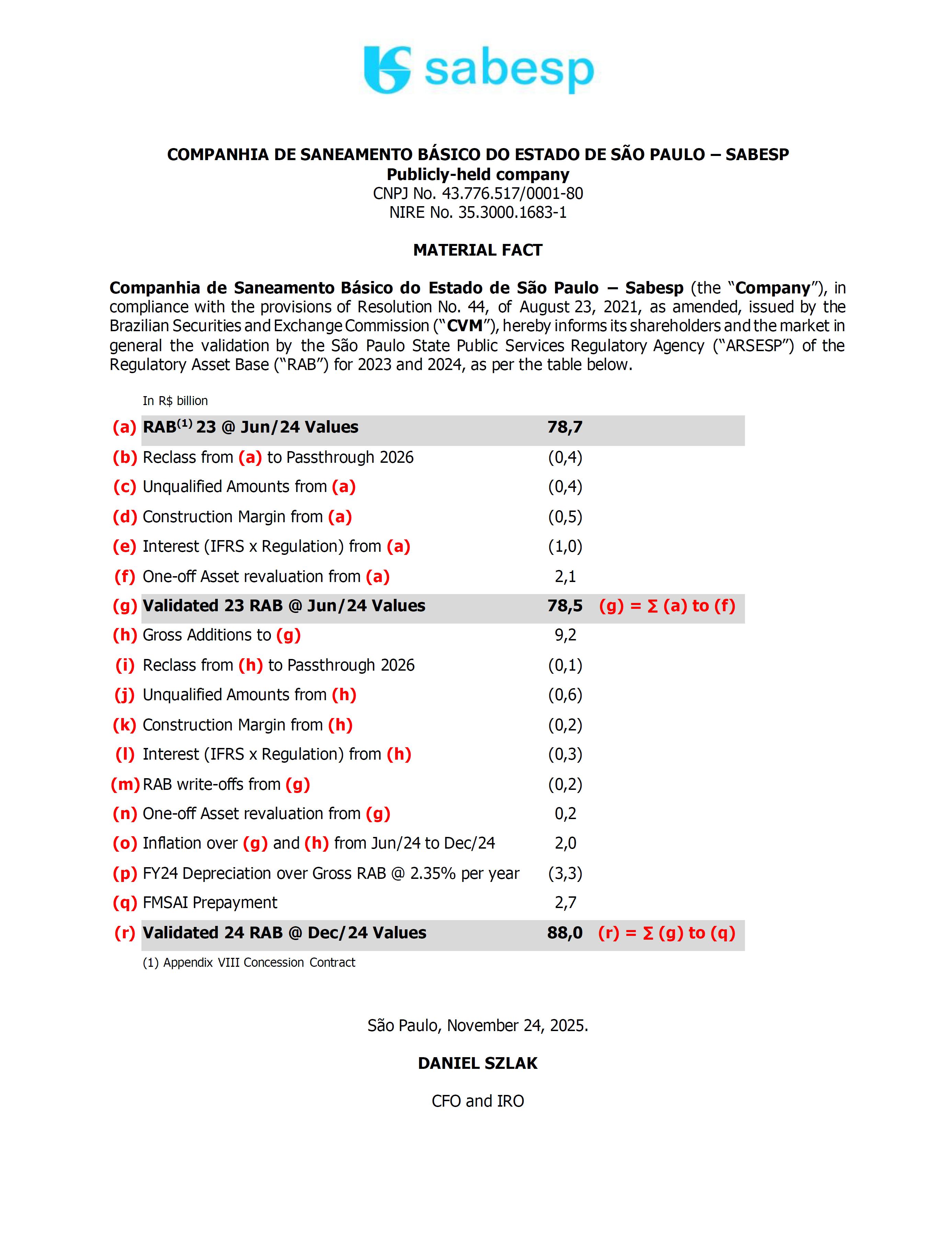 COMPANHIA DE SANEAMENTO BÁSICO DO ESTADO DE SÃO PAULO – SABESP Publicly-held company CNPJ No. 43.776.517/0001-80 NIRE No. 35.3000.1683-1 MATERIAL FACT Companhia de Saneamento Básico do Estado de São Paulo – Sabesp (the “Company”), in compliance with the provisions of Resolution No. 44, of August 23, 2021, as amended, issued by the Brazilian Securities and Exchange Commission (“CVM”), hereby informs its shareholders and the market in general the validation by the São Paulo State Public Services Regulatory Agency (“ARSESP”) of the Regulatory Asset Base (“RAB”) for 2023 and 2024, as per the table below. In R$ billion (a) RAB(1) 23 @ Jun/24 Values 78,7 (b) Reclass from (a) to Passthrough 2026 (0,4) (c) Unqualified Amounts from (a) (0,4) (d) Construction Margin from (a) (0,5) (e) Interest (IFRS x Regulation) from (a) (1,0) (f) One-off Asset revaluation from (a) 2,1 (g) Validated 23 RAB @ Jun/24 Values 78,5 (g) = Σ (a) to (f) (h) Gross Additions to (g) 9,2 (i) Reclass from (h) to Passthrough 2026 (0,1) (j) Unqualified Amounts from (h) (0,6) (k) Construction Margin from (h) (0,2) (l) Interest (IFRS x Regulation) from (h) (0,3) (m) RAB write-offs from (g) (0,2) (n) One-off Asset revaluation from (g) 0,2 (o) Inflation over (g) and (h) from Jun/24 to Dec/24 2,0 (p) FY24 Depreciation over Gross RAB @ 2.35% per year (3,3) (q) FMSAI Prepayment 2,7 (r) Validated 24 RAB @ Dec/24 Values 88,0 (r) = Σ (g) to (q) (1) Appendix VIII Concession Contract São Paulo, November 24, 2025. DANIEL SZLAK CFO and IRO