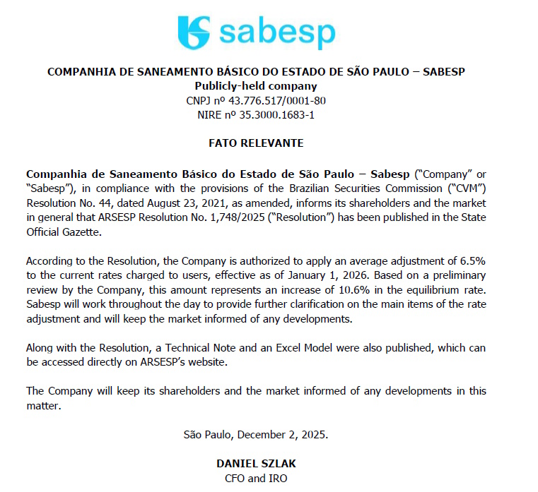 COMPANHIA DE SANEAMENTO BÁSICO DO ESTADO DE SÃO PAULO – SABESP Publicly-held company CNPJ nº 43.776.517/0001-80 NIRE nº 35.3000.1683-1 FATO RELEVANTE Companhia de Saneamento Básico do Estado de São Paulo – Sabesp (“Company” or “Sabesp”), in compliance with the provisions of the Brazilian Securities Commission (“CVM”) Resolution No. 44, dated August 23, 2021, as amended, informs its shareholders and the market in general that ARSESP Resolution No. 1,748/2025 (“Resolution”) has been published in the State Official Gazette. According to the Resolution, the Company is authorized to apply an average adjustment of 6.5% to the current rates charged to users, effective as of January 1, 2026. Based on a preliminary review by the Company, this amount represents an increase of 10.6% in the equilibrium rate. Sabesp will work throughout the day to provide further clarification on the main items of the rate adjustment and will keep the market informed of any developments. Along with the Resolution, a Technical Note and an Excel Model were also published, which can be accessed directly on ARSESP’s website. The Company will keep its shareholders and the market informed of any developments in this matter. São Paulo, December 2, 2025. DANIEL SZLAK CFO and IRO