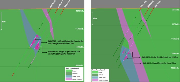 Significant intercept from Hole BMDD319 confirms downdip extension intercepted previously by BMDD310 and is 15 m further downdip (see Figure 2). Similarly, significant intercept from BMDD320 confirms up-dip extension of previously intercepted zone by BMDD315;