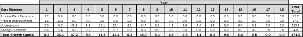 • Growth capital of US$89 million will be deployed over the next four-year period comprised of: (i) US$55 million in capital for the underground expansion; (ii) US$30 million for process improvements, process plant throughput expansion, and camp upgrades; and (iii) US$3 million for tailings facility upgrades. LOM growth capital is estimated to be US$175 million and is primarily for underground development. LOM sustaining capital cost of US$87 million is estimated for site and process plant, and US$97 million for underground mining;