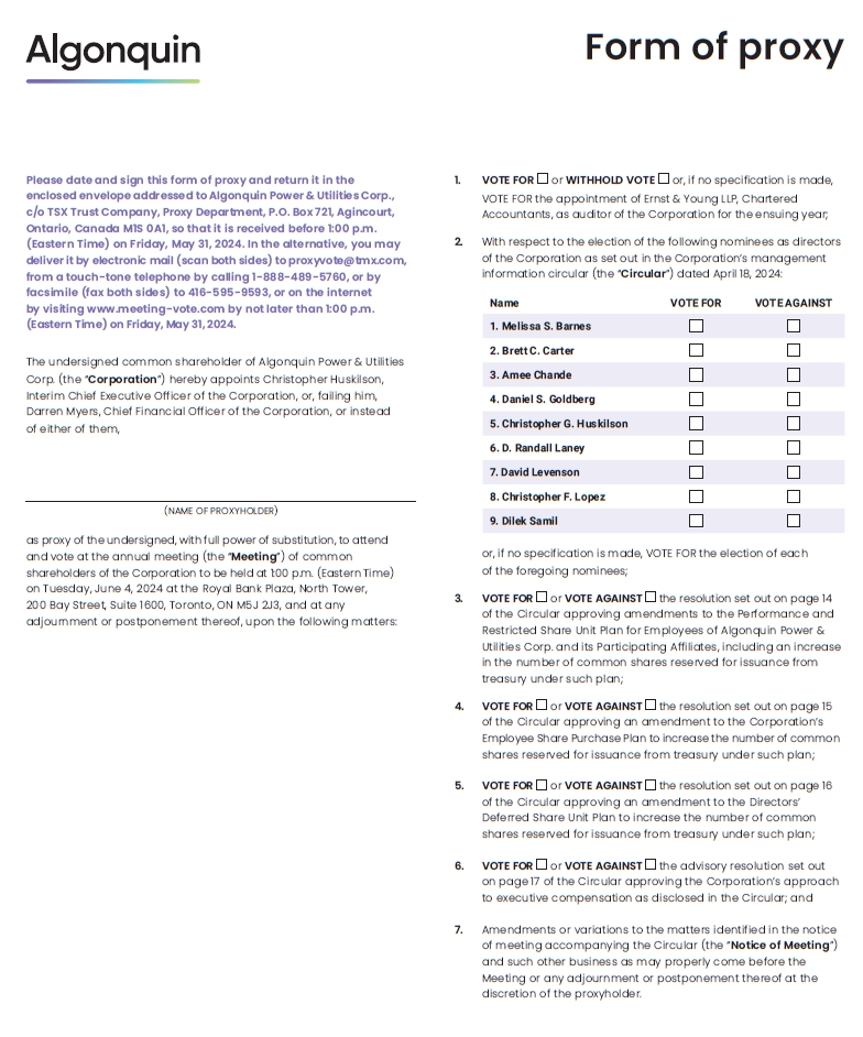Form of proxy  Please date and sign this form of proxy and return it in the enclosed envelope addressed to Algonquin Power & Utilities Corp., c/o TSX Trust Company, Proxy Department, P.O. Box 721, Agincourt, Ontario, Canada M1S 0A1, so that it is received before 1:00 p.m. (Eastern Time) on Friday, May 31, 2024. In the alternative, you may deliver it by electronic mail (scan both sides) to proxyvote@tmx.com, from a touch-tone telephone by calling 1-888-489-5760, or by facsimile (fax both sides) to 416-595-9593, or on the internet  by visiting www.meeting-vote.com by not later than 1:00 p.m. (Eastern Time) on Friday, May 31, 2024.  The undersigned common shareholder of Algonquin Power & Utilities Corp. (the “Corporation”) hereby appoints Christopher Huskilson, Interim Chief Executive Officer of the Corporation, or, failing him, Darren Myers, Chief Financial Officer of the Corporation, or instead of either of them,  (NAME OF PROXYHOLDER)  as proxy of the undersigned, with full power of substitution, to attend and vote at the annual meeting (the “Meeting”) of common shareholders of the Corporation to be held at 1:00 p.m. (Eastern Time) on Tuesday, June 4, 2024 at the Royal Bank Plaza, North Tower,  200 Bay Street, Suite 1600, Toronto, ON M5J 2J3, and at any adjournment or postponement thereof, upon the following matters:  1. Melissa S. Barnes  2. Brett C. Carter  3. Amee Chande  4. Daniel S. Goldberg  5. Christopher G. Huskilson  6. D. Randall Laney  7. David Levenson  8. Christopher F. Lopez  9. Dilek Samil  VOTE FOR or WITHHOLD VOTE or, if no specification is made,  VOTE FOR the appointment of Ernst & Young LLP, Chartered Accountants, as auditor of the Corporation for the ensuing year;  With respect to the election of the following nominees as directors of the Corporation as set out in the Corporation’s management information circular (the “Circular”) dated April 18, 2024:  Name VOTE FOR VOTE AGAINST  or, if no specification is made, VOTE FOR the election of each of the foregoing nominees;  VOTE FOR or VOTE AGAINST the resolution set out on page 14 of the Circular approving amendments to the Performance and Restricted Share Unit Plan for Employees of Algonquin Power & Utilities Corp. and its Participating Affiliates, including an increase in the number of common shares reserved for issuance from treasury under such plan;  VOTE FOR or VOTE AGAINST the resolution set out on page 15 of the Circular approving an amendment to the Corporation’s Employee Share Purchase Plan to increase the number of common shares reserved for issuance from treasury under such plan;  VOTE FOR or VOTE AGAINST the resolution set out on page 16 of the Circular approving an amendment to the Directors’ Deferred Share Unit Plan to increase the number of common shares reserved for issuance from treasury under such plan;  VOTE FOR or VOTE AGAINST the advisory resolution set out on page 17 of the Circular approving the Corporation’s approach to executive compensation as disclosed in the Circular; and  Amendments or variations to the matters identified in the notice of meeting accompanying the Circular (the “Notice of Meeting”) and such other business as may properly come before the Meeting or any adjournment or postponement thereof at the discretion of the proxyholder.