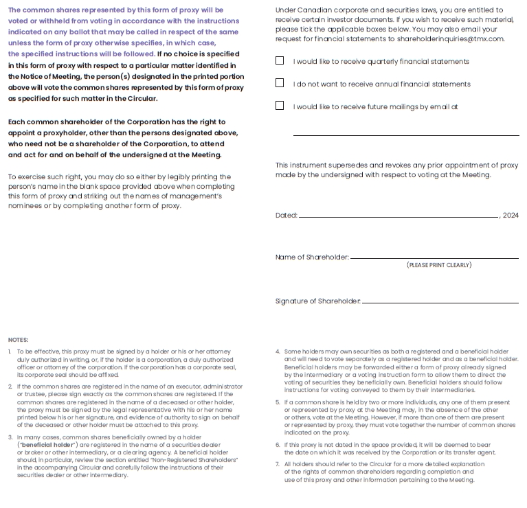 The common shares represented by this form of proxy will be voted or withheld from voting in accordance with the instructions indicated on any ballot that may be called in respect of the same unless the form of proxy otherwise specifies, in which case,  the specified instructions will be followed. If no choice is specified in this form of proxy with respect to a particular matter identified in the Notice of Meeting, the person(s) designated in the printed portion above will vote the common shares represented by this form of proxy as specified for such matter in the Circular.  Each common shareholder of the Corporation has the right to appoint a proxyholder, other than the persons designated above, who need not be a shareholder of the Corporation, to attend and act for and on behalf of the undersigned at the Meeting.     To exercise such right, you may do so either by legibly printing the person’s name in the blank space provided above when completing this form of proxy and striking out the names of management’s nominees or by completing another form of proxy.  Under Canadian corporate and securities laws, you are entitled to receive certain investor documents. If you wish to receive such material, please tick the applicable boxes below. You may also email your request for financial statements to shareholderinquiries@tmx.com.  I would like to receive quarterly financial statements  I do not want to receive annual financial statements  I would like to receive future mailings by email at  This instrument supersedes and revokes any prior appointment of proxy made by the undersigned with respect to voting at the Meeting.  Dated: , 2024  Name of Shareholder:   (PLEASE PRINT CLEARLY)  Signature of Shareholder:   NOTES:  To be effective, this proxy must be signed by a holder or his or her attorney duly authorized in writing, or, if the holder is a corporation, a duly authorized officer or attorney of the corporation. If the corporation has a corporate seal, its corporate seal should be affixed.  If the common shares are registered in the name of an executor, administrator or trustee, please sign exactly as the common shares are registered. If the common shares are registered in the name of a deceased or other holder, the proxy must be signed by the legal representative with his or her name printed below his or her signature, and evidence of authority to sign on behalf of the deceased or other holder must be attached to this proxy.  In many cases, common shares beneficially owned by a holder (“beneficial holder”) are registered in the name of a securities dealer  or broker or other intermediary, or a clearing agency. A beneficial holder should, in particular, review the section entitled “Non-Registered Shareholders” in the accompanying Circular and carefully follow the instructions of their securities dealer or other intermediary.  Some holders may own securities as both a registered and a beneficial holder and will need to vote separately as a registered holder and as a beneficial holder.  Beneficial holders may be forwarded either a form of proxy already signed by the intermediary or a voting instruction form to allow them to direct the voting of securities they beneficially own. Beneficial holders should follow instructions for voting conveyed to them by their intermediaries.  If a common share is held by two or more individuals, any one of them present or represented by proxy at the Meeting may, in the absence of the other  or others, vote at the Meeting. However, if more than one of them are present  or represented by proxy, they must vote together the number of common shares indicated on the proxy.  If this proxy is not dated in the space provided, it will be deemed to bear the date on which it was received by the Corporation or its transfer agent.  All holders should refer to the Circular for a more detailed explanation of the rights of common shareholders regarding completion and use of this proxy and other information pertaining to the Meeting.