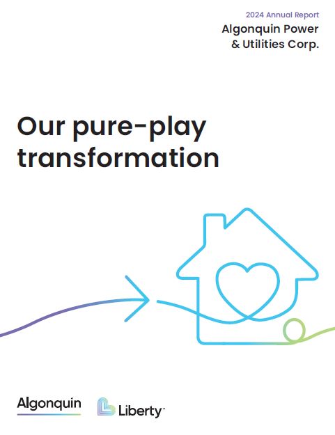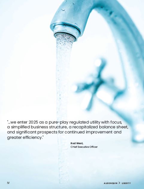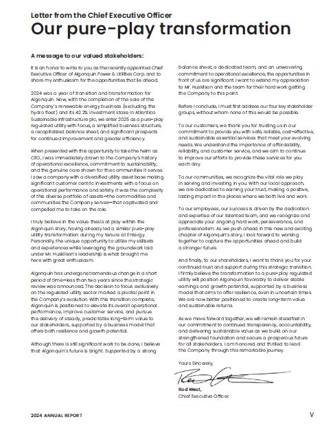 A message to our valued stakeholders:  It is an honor to write to you as the recently appointed Chief Executive Officer of Algonquin Power & Utilities Corp. and to share my enthusiasm for the opportunities that lie ahead.  2024 was a year of transition and transformation for Algonquin. Now, with the completion of the sale of the Company’s renewable energy business (excluding the hydro fleet) and its 42.2% investment stake in Atlantica Sustainable Infrastructure plc, we enter 2025 as a pure-play regulated utility with focus, a simplified business structure, a recapitalized balance sheet, and significant prospects for continued improvement and greater efficiency.  When presented with this opportunity to take the helm as CEO, I was immediately drawn to the Company’s history of operational excellence, commitment to sustainability,  and the genuine care shown for the communities it serves. I saw a company with a diversified utility asset base making significant customer centric investments with a focus on operational performance and safety. It was the complexity of this diverse portfolio of assets—the commodities and communities the Company serves—that captivated and compelled me to take on the role.  I truly believe in the value thesis at play within the Algonquin story, having already led a similar pure-play utility transformation during my tenure at Entergy.  Personally, the unique opportunity to utilize my skillsets and experiences while leveraging the groundwork laid under Mr. Huskilson’s leadership is what brought me here with great enthusiasm.  Algonquin has undergone tremendous change in a short period of time—less than two years since the strategic review was announced. The decision to focus exclusively on the regulated utility sector marked a pivotal point in the Company’s evolution. With this transition complete, Algonquin is positioned to elevate its overall operational performance, improve customer service, and pursue the delivery of steady, predictable long-term value to our stakeholders, supported by a business model that offers both resilience and growth potential.  Although there is still significant work to be done, I believe that Algonquin’s future is bright. Supported by a strong  balance sheet, a dedicated team, and an unwavering commitment to operational excellence, the opportunities in front of us are significant. I want to extend my appreciation to Mr. Huskilson and the team for their hard work getting the Company to this point.  Before I conclude, I must first address our four key stakeholder groups, without whom none of this would be possible.  To our customers, we thank you for trusting us in our commitment to provide you with safe, reliable, cost-effective, and sustainable essential services that meet your evolving needs. We understand the importance of affordability, reliability, and customer service, and we aim to continue  to improve our efforts to provide these services for you each day.  To our communities, we recognize the vital role we play in serving and investing in you. With our local approach,  we are dedicated to earning your trust, making a positive, lasting impact in the places where we both live and work.  To our employees, our success is driven by the dedication and expertise of our talented team, and we recognize and appreciate your ongoing hard work, perseverance, and professionalism. As we push ahead in this new and exciting chapter of Algonquin’s story, I look forward to working together to capture the opportunities ahead and build  a stronger future.  And finally, to our shareholders, I want to thank you for your continued trust and support during this strategic transition. I firmly believe the transformation to a pure-play regulated utility will position Algonquin favorably to deliver stable earnings and growth potential, supported by a business model that aims to offer resilience, even in uncertain times. We are now better positioned to create long-term value and sustainable returns.  As we move forward together, we will remain steadfast in our commitment to continued transparency, accountability, and delivering sustainable value as we build on our strengthened foundation and secure a prosperous future for all stakeholders. I am honored and thrilled to lead  the Company through this remarkable journey.  Yours Sincerely,  Rod West,  Chief Executive Officer  Letter from the Chief Executive Officer  Our pure-play transformation  2024 ANNUAL REPORT  V