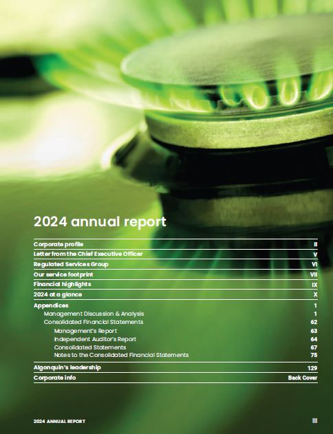 2024 annual report  Corporate profile  II  Letter from the Chief Executive Officer  V  Regulated Services Group  VI  Our service footprint  VII  Financial highlights  IX  2024 at a glance  X  Appendices  Management Discussion & Analysis Consolidated Financial Statements  Management’s Report Independent Auditor’s Report Consolidated Statements  Notes to the Consolidated Financial Statements  1  1  62  63  64  67  75  Algonquin’s leadership  129  Corporate info  Back Cover  2024 ANNUAL REPORT  III
