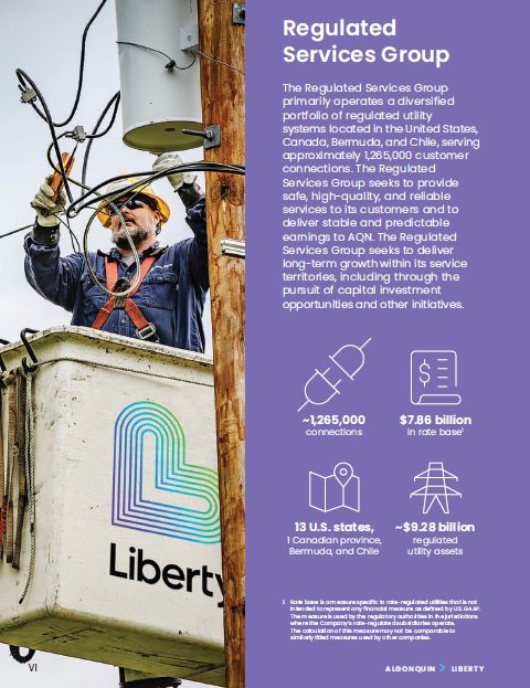~1,265,000  connections  $7.86 billion  in rate base1  13 U.S. states,  1 Canadian province,  Bermuda, and Chile  ~$9.28 billion  regulated  utility assets  1. Rate base is a measure specific to rate-regulated utilities that is not intended to represent any financial measure as defined by U.S. GAAP. The measure is used by the regulatory authorities in the jurisdictions where the Company’s rate-regulated subsidiaries operate.  The calculation of this measure may not be comparable to similarly titled measures used by other companies.  Regulated  Services Group  The Regulated Services Group primarily operates a diversified portfolio of regulated utility systems located in the United States,  Canada, Bermuda, and Chile, serving approximately 1,265,000 customer connections. The Regulated Services Group seeks to provide safe, high-quality, and reliable services to its customers and to deliver stable and predictable earnings to AQN. The Regulated Services Group seeks to deliver long-term growth within its service territories, including through the pursuit of capital investment opportunities and other initiatives.  VI  ALGONQUIN > LIBERTY