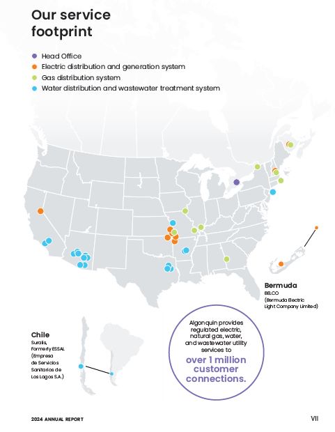 Head Office  Electric distribution and generation system Gas distribution system  Water distribution and wastewater treatment system  Our service footprint  Chile  Suralis, Formerly ESSAL (Empresa  de Servicios Sanitarios de Los Lagos S.A.)  Bermuda  BELCO  (Bermuda Electric  Light Company Limited)  Algonquin provides regulated electric, natural gas, water, and wastewater utility services to  over 1 million customer connections.  2024 ANNUAL REPORT  VII
