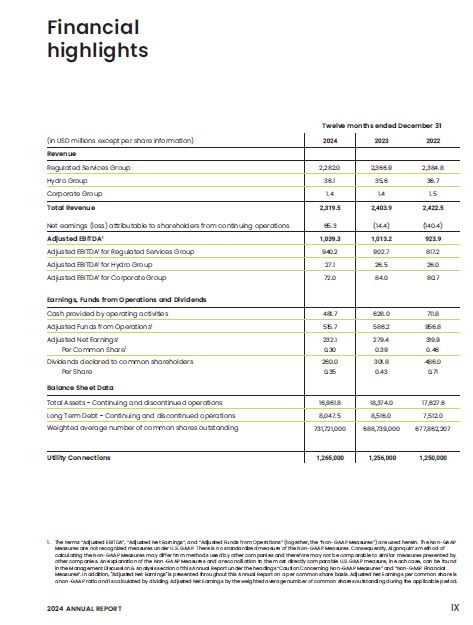 1. The terms “Adjusted EBITDA”, “Adjusted Net Earnings”, and “Adjusted Funds from Operations” (together, the “Non-GAAP Measures”) are used herein. The Non-GAAP Measures are not recognized measures under U.S. GAAP. There is no standardized measure of the Non-GAAP Measures. Consequently, Algonquin’s method of calculating the Non-GAAP Measures may differ from methods used by other companies and therefore may not be comparable to similar measures presented by other companies. An explanation of the Non-GAAP Measures and a reconciliation to the most directly comparable U.S. GAAP measure, in each case, can be found in the Management Discussion & Analysis section of this Annual Report under the headings “Caution Concerning Non-GAAP Measures” and “Non-GAAP Financial Measures”. In addition, "Adjusted Net Earnings" is presented throughout this Annual Report on a per common share basis. Adjusted Net Earnings per common share is a non-GAAP ratio and is calculated by dividing Adjusted Net Earnings by the weighted average number of common shares outstanding during the applicable period.  Financial highlights  (in USD millions except per share information)  2024  2023  2022  Revenue  Regulated Services Group  2,282.0  2,366.9  2,384.8  Hydro Group  36.1  35.6  36.7  Corporate Group  1.4  1.4  1.5  Total Revenue  2,319.5  2,403.9  2,422.5  Net earnings (loss) attributable to shareholders from continuing operations  65.3  (14.4)  (140.4)  Adjusted EBITDA1  1,039.3  1,013.2  923.9  Adjusted EBITDA1 for Regulated Services Group  940.2  902.7  817.2  Adjusted EBITDA1 for Hydro Group  27.1  26.5  26.0  Adjusted EBITDA1 for Corporate Group  Earnings, Funds from Operations and Dividends  72.0  84.0  80.7  Cash provided by operating activities  481.7  628.0  711.8  Adjusted Funds from Operations1  515.7  586.2  956.8  Adjusted Net Earnings1  232.1  279.4  319.9  Per Common Share1  0.30  0.39  0.46  Dividends declared to common shareholders  260.0  301.8  486.0  Per Share  0.35  0.43  0.71  Balance Sheet Data  Total Assets - Continuing and discontinued operations  16,961.8  18,374.0  17,627.6  Long Term Debt - Continuing and discontinued operations  8,047.5  8,516.0  7,512.0  Weighted average number of common shares outstanding  731,721,000  688,739,000  677,862,207  Utility Connections  1,265,000  1,256,000  1,250,000  Twelve months ended December 31  2024 ANNUAL REPORT  IX
