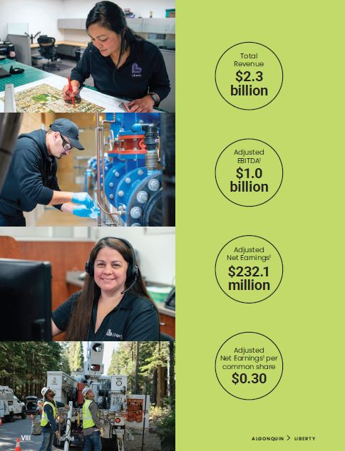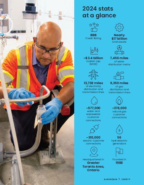Forward-looking information  This document contains statements that constitute “forward-looking statements” or “forward-looking information” within the meaning of applicable securities legislation (collectively, “forward-looking information”). The words “aims”, “anticipates”, “believes”, “expects”, “could”, “intends”, “may”, “plans”, “potential”, “will”, “would”, “seeks”,  “target”, and similar words and expressions are often intended to identify forward-looking information, although not all forward-looking information contains these identifying words. Specific forward-looking information in this document includes, but is not limited to: the anticipated impact of the sale of the Company’s renewable energy business and its ownership stake in Atlantica Sustainable Infrastructure plc; expected  future operational performance, customer service, and long-term value; expected future earnings, growth, and returns; statements regarding future appointments to the board of directors of the Company; statements regarding strategies; statements regarding services provided to customers; and statements regarding sustainability.  Readers are advised that all forward-looking information in this document is provided subject to the ”Caution Concerning Forward-  Looking Statements and Forward-Looking Information” section of  the Management Discussion & Analysis section of this Annual Report.  1. Data in this report is provided as of December 31, 2024, unless otherwise stated. Dollar figures herein are presented in U.S. dollars unless otherwise stated.  Corporate profile1  Algonquin Power & Utilities Corp. (“Algonquin”, the “Company”, “AQN”, “we”, or “our”), parent company of Liberty, is a diversified international generation, transmission, and distribution utility. Algonquin  is committed to providing safe, secure, reliable, cost-effective, and sustainable energy and water solutions through its portfolio of generation, transmission, and distribution utility investments to over one million customer connections, largely in the United States and Canada.  AlgonquinPower.com TSX/NYSE: AQN  II  ALGONQUIN > LIBERTY