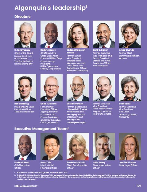D. Randy Laney  Chair of the Board  Former Chairman of the Board,  The Empire District Electric Company  Roderick West  Chief Executive Officer, Algonquin Power & Utilities Corp.  Former Group President,  Utility Operations, Entergy Corporation  Melissa Stapleton Barnes  Former Senior Vice President, Enterprise Risk Management and Chief Ethics and  Compliance Officer, Eli Lilly and Company  Brett C. Carter  Former Executive Vice President and Group President, Utilities and Chief Customer Officer, Xcel Energy Inc.  Amee Chande  Former Chief Commercial Officer, Waymo  Dan Goldberg  President and Chief Executive Officer, Telesat Corporation  Chris Huskilson  Former Chief Executive Officer, Algonquin Power & Utilities Corp.  Former President and Chief Executive Officer, Emera Inc.  David Levenson  Former global head of Brookfield Special Investments and Managing Partner, Brookfield Asset Management  Christopher Lopez  Former Executive Vice President, Chief Financial and Regulatory Officer, Hydro One Limited  Dilek Samil  Former Executive Vice President and Chief Operating Officer, NV Energy  Roderick West  Chief Executive Officer  Brian Chin  Interim Chief Financial Officer  Sarah MacDonald  Chief Transformation Officer  Colin Penny  Chief Information Officer  Jennifer Tindale  Chief Legal Officer  Executive Management Team2  Directors  Algonquin's leadership1  AQN Directors and Executive Management Team as at April 1, 2025 .  On March 13, 2025, the Board of Directors of AQN announced it intends to appoint Gavin Molinelli, Senior Partner and Portfolio Manager at Starboard Value LP, to the Board, subject to approval by the Federal Energy Regulatory Commission. Mr. Molinelli’s appointment will become effective immediately following the receipt of such approval.  2024 ANNUAL REPORT  129