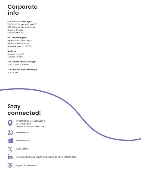Canadian Transfer Agent: TSX Trust Company (Canada) 300-100 Adelaide Street West Toronto, Ontario,  Canada M5H 1S3  U.S. Transfer Agent: Equiniti Trust Company, LLC 48 Wall Street, Floor 23  New York, New York 10005  Auditors:  Ernst & Young LLP Toronto, Ontario  The Toronto Stock Exchange:  AQN, AQN.PR.A, AQN.PR.D  The New York Stock Exchange:  AQN, AQNB  905-465-4514  Stay  connected!  Greater Toronto Headquarters: 354 Davis Road,  Oakville, Ontario, Canada L6J 2X1  905-465-4500  AQN_Utilities  www.linkedin.com/company/algonquin-power-&-utilities-corp  algonquinpower.com  Corporate info