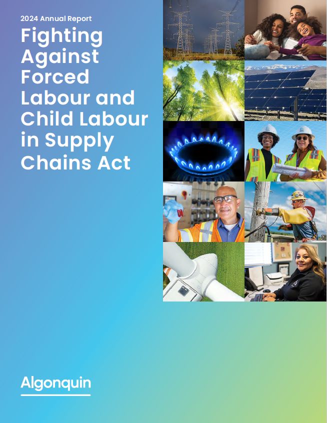 2 Algonquin | 2024 Annual Report – Fighting Against Forced Labour and Child Labour in Supply Chains Act  Introduction  Algonquin Power & Utilities Corp. (“AQN”) is reporting in accordance with Canada’s forced labour and child labour legislation, the Fighting Against Forced Labour and Child Labour in Supply Chains Act (the “Act”), for the reporting period from January 1, 2024, to December 31, 2024 (the “Reporting Period”). This report (the “Report”) is a joint report submitted by AQN, Algonquin Power Co., and Liberty Utilities (Gas New Brunswick) LP (collectively, the “AQN Reporting Entities”). In this Report, unless the context indicates otherwise, references to the “Company”, “its”, and similar expressions refer to the AQN Reporting Entities.  Structure, activities and supply chains  AQN (TSX/NYSE: AQN) is incorporated under the Canada Business Corporations Act. AQN is a diversified international generation, transmission, and distribution utility with approximately U.S.$18 billion of total assets, as of the Reporting Period. AQN is committed to providing safe, secure, reliable, cost-effective, and sustainable energy and water solutions through its portfolio of generation, transmission, and distribution utility investments to over one million customer connections, largely in the United States and Canada. AQN owns and operates a portfolio of regulated electric, water distribution and wastewater collection,  and natural gas utility systems and transmission operations in the United States, Canada, Bermuda, and Chile through its Regulated Services Group.  On January 9, 2025, AQN announced that it completed the sale (the “Sale”) of its non-regulated renewable energy business (excluding its hydro fleet) (the “Renewable Energy Group”), through which it primarily owned and operated, or had investments in, a diversified portfolio of non-regulated renewable and thermal energy generation assets.  Current policies  The Company aspires to uphold its ethical principles internally and with its external stakeholders. The Company’s Human Rights Policy establishes its commitment to respecting human rights and related principles, including prohibiting the use  of forced labour and child labour, across business activities and relationships.  The Company’s commitment to respecting human rights is also embedded in several company-wide policies including its Supplier Code of Conduct, Supplier Diversity Policy,  and Policy on Procurement. These policies govern corporate behaviour regarding procurement strategies and supply chain management.  Code of Business Conduct and Ethics  The Company’s Code of Business Conduct and Ethics assists all directors, trustees, officers, employees, agents and contractors of AQN (collectively, “Representatives”) and each of its subsidiary entities to maintain high standards of ethical conduct in the Company’s affairs. The Code of Business Conduct and Ethics requires compliance with applicable laws, including employment, discrimination, health, safety, antitrust, securities, banking, privacy, anti-bribery, anti-corruption, trade, labour, and environmental laws. Representatives must not violate any laws or direct another Representative to do so on AQN’s behalf. All employees must complete annual training on compliance with the Code of Business Conduct and Ethics, which includes training on the  risk of forced labour and child labour in supply chains.