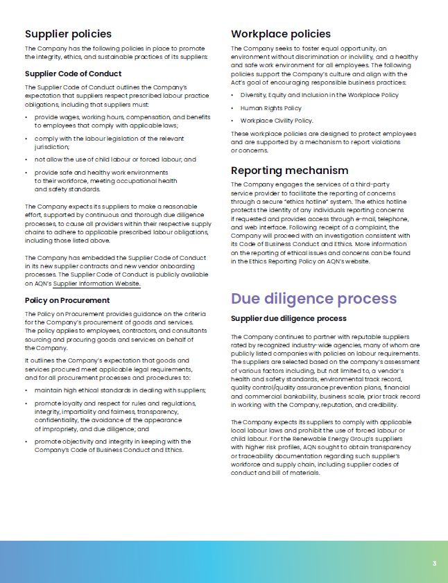 3  Supplier policies  The Company has the following policies in place to promote the integrity, ethics, and sustainable practices of its suppliers:  Supplier Code of Conduct  The Supplier Code of Conduct outlines the Company’s expectation that suppliers respect prescribed labour practice obligations, including that suppliers must:  provide wages, working hours, compensation, and benefits to employees that comply with applicable laws;  comply with the labour legislation of the relevant jurisdiction;  not allow the use of child labour or forced labour; and  provide safe and healthy work environments  to their workforce, meeting occupational health and safety standards.  The Company expects its suppliers to make a reasonable effort, supported by continuous and thorough due diligence processes, to cause all providers within their respective supply chains to adhere to applicable prescribed labour obligations, including those listed above.  The Company has embedded the Supplier Code of Conduct in its new supplier contracts and new vendor onboarding processes. The Supplier Code of Conduct is publicly available on AQN’s Supplier Information Website.  Policy on Procurement  The Policy on Procurement provides guidance on the criteria for the Company’s procurement of goods and services.  The policy applies to employees, contractors, and consultants sourcing and procuring goods and services on behalf of  the Company.  It outlines the Company’s expectation that goods and services procured meet applicable legal requirements, and for all procurement processes and procedures to:  maintain high ethical standards in dealing with suppliers;  promote loyalty and respect for rules and regulations, integrity, impartiality and fairness, transparency, confidentiality, the avoidance of the appearance  of impropriety, and due diligence; and  promote objectivity and integrity in keeping with the Company’s Code of Business Conduct and Ethics.  Workplace policies  The Company seeks to foster equal opportunity, an environment without discrimination or incivility, and a healthy and safe work environment for all employees. The following policies support the Company’s culture and align with the Act’s goal of encouraging responsible business practices:  Diversity, Equity and Inclusion in the Workplace Policy  Human Rights Policy  Workplace Civility Policy.  These workplace policies are designed to protect employees and are supported by a mechanism to report violations  or concerns.  Reporting mechanism  The Company engages the services of a third-party service provider to facilitate the reporting of concerns through a secure “ethics hotline” system. The ethics hotline protects the identity of any individuals reporting concerns if requested and provides access through e-mail, telephone, and web interface. Following receipt of a complaint, the  Company will proceed with an investigation consistent with its Code of Business Conduct and Ethics. More information on the reporting of ethical issues and concerns can be found in the Ethics Reporting Policy on AQN’s website.  Due diligence process  Supplier due diligence process  The Company continues to partner with reputable suppliers rated by recognized industry-wide agencies, many of whom are publicly listed companies with policies on labour requirements. The suppliers are selected based on the company’s assessment of various factors including, but not limited to, a vendor’s health and safety standards, environmental track record, quality control/quality assurance prevention plans, financial and commercial bankability, business scale, prior track record in working with the Company, reputation, and credibility.  The Company expects its suppliers to comply with applicable local labour laws and prohibit the use of forced labour or child labour. For the Renewable Energy Group’s suppliers with higher risk profiles, AQN sought to obtain transparency or traceability documentation regarding such supplier’s workforce and supply chain, including supplier codes of conduct and bill of materials.