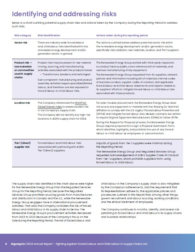 4 Algonquin | 2024 Annual Report – Fighting Against Forced Labour and Child Labour in Supply Chains Act  Identifying and addressing risks  Below is a chart outlining potential supply chain risks and actions taken by the Company during the Reporting Period to address such risks.  Risk category  Risk identification  Actions taken during the reporting period  Sector risk  There are industry-wide forced labour and child labour risks identified within the renewable energy development and/or generation sector in general.  The actions outlined below address potential sector risk within the renewable energy development and/or generation sector,  specifically risks related to raw materials, location, and Tier 1 suppliers.  Product risk — raw materials or commodities used in supply chains  Product risks may be present in raw material mining, sourcing, and manufacturing activities associated with the products below:  Transformers, breakers, and switchgear  Sub-component manufacturing and product assembly activities require specialized/skilled labour, and therefore are less exposed to forced labour or child labour risks.  The Renewable Energy Group worked with third-party inspectors to conduct factory audits, cross-reference bill of materials, and oversee manufacturing of key equipment.  The Renewable Energy Group requested from its suppliers, relevant policies and information including bill of materials, internal codes of business conduct, supplier codes of conduct, and applicable forced labour and child labour statements and reports related to its suppliers’ efforts to mitigate forced labour or child labour risks associated with these products.  Location risk  The Company referenced the WalkFree  Global Slavery Index to assess location risk  in the Company’s supply chain.  The Company did not identify any high-risk locations in AQN’s supply chain for 2024.  For solar module procurement, the Renewable Energy Group does not source any equipment or material with the Xinjiang (or Hoshine) affiliation to comply with the U.S. Uyghur Forced Labour Prevention Act (UFLPA) and mitigate forced labour risks. Module contracts are written to require Original Equipment Manufacturers (OEMs) to follow UFLPA.  During the Request for Proposal process, the Renewable Energy Group requires proponents to sign a Proposal Submission Form, which identifies, highlights, and prohibits the use of any forced labour or child labour as employees or subcontractors.  Tier 1 (direct) supplier risk  Forced labour and child labour risks associated with partnering with AQN’s Tier 1 (direct) suppliers.  Imports of goods from Tier 1 suppliers were minimal during the Reporting Period.  The Renewable Energy Group and Regulated Services Group requested acknowledgement of AQN’s Supplier Code of Conduct from Tier 1 suppliers, which prohibits suppliers from using forced labour or child labour.  The supply chain risks identified in the chart above were higher for the Renewable Energy Group than the Regulated Services Group for the Reporting Period, because the Regulated Services Group prioritizes sourcing goods from manufacturers and distributors in Canada and the U.S., while the Renewable Energy Group engages more in international procurement activities. That said, the Company considers the risk of forced labour and child labour in its supply chain to be low. The Renewable Energy Group’s procurement activities decreased from 2023 to 2024 because of the Company’s focus on the Sale during the Reporting Period. The risk of forced labour and  child labour in the Company’s supply chain is also mitigated by the Company’s adherence to, and the requirement that its Representatives adhere to, the applicable policies and procedures outlined in this Report that, among other things, govern recruitment and labour sourcing, working conditions and the ethical treatment of employees.  The Company continues to monitor, identify, and assess risk pertaining to forced labour and child labour in its supply chains and business relationships.