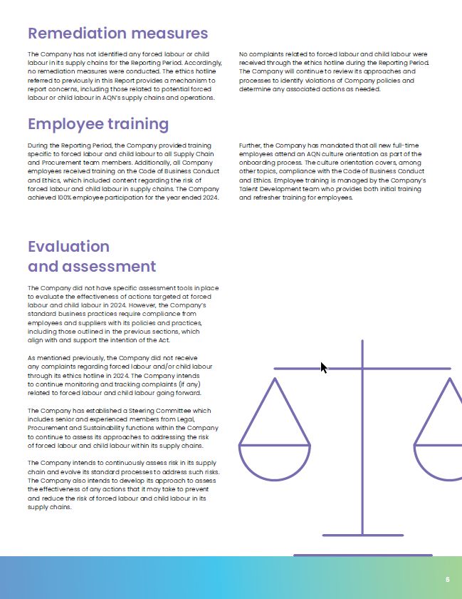 5  Remediation measures  The Company has not identified any forced labour or child labour in its supply chains for the Reporting Period. Accordingly, no remediation measures were conducted. The ethics hotline referred to previously in this Report provides a mechanism to report concerns, including those related to potential forced labour or child labour in AQN’s supply chains and operations.  No complaints related to forced labour and child labour were received through the ethics hotline during the Reporting Period. The Company will continue to review its approaches and processes to identify violations of Company policies and determine any associated actions as needed.  Employee training  During the Reporting Period, the Company provided training specific to forced labour and child labour to all Supply Chain and Procurement team members. Additionally, all Company employees received training on the Code of Business Conduct and Ethics, which included content regarding the risk of forced labour and child labour in supply chains. The Company achieved 100% employee participation for the year ended 2024.  Further, the Company has mandated that all new full-time employees attend an AQN culture orientation as part of the onboarding process. The culture orientation covers, among other topics, compliance with the Code of Business Conduct and Ethics. Employee training is managed by the Company’s Talent Development team who provides both initial training and refresher training for employees.  Evaluation  and assessment  The Company did not have specific assessment tools in place to evaluate the effectiveness of actions targeted at forced labour and child labour in 2024. However, the Company’s standard business practices require compliance from employees and suppliers with its policies and practices, including those outlined in the previous sections, which  align with and support the intention of the Act.  As mentioned previously, the Company did not receive  any complaints regarding forced labour and/or child labour through its ethics hotline in 2024. The Company intends  to continue monitoring and tracking complaints (if any) related to forced labour and child labour going forward.  The Company has established a Steering Committee which includes senior and experienced members from Legal, Procurement and Sustainability functions within the Company to continue to assess its approaches to addressing the risk  of forced labour and child labour within its supply chains.  The Company intends to continuously assess risk in its supply chain and evolve its standard processes to address such risks. The Company also intends to develop its approach to assess the effectiveness of any actions that it may take to prevent and reduce the risk of forced labour and child labour in its supply chains.