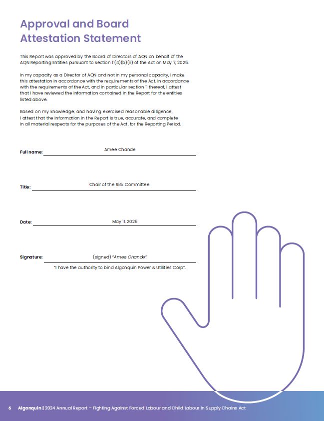 6 Algonquin | 2024 Annual Report – Fighting Against Forced Labour and Child Labour in Supply Chains Act  Approval and Board Attestation Statement  This Report was approved by the Board of Directors of AQN on behalf of the AQN Reporting Entities pursuant to section 11(4)(b)(ii) of the Act on May 7, 2025.  In my capacity as a Director of AQN and not in my personal capacity, I make this attestation in accordance with the requirements of the Act. In accordance with the requirements of the Act, and in particular section 11 thereof, I attest that I have reviewed the information contained in the Report for the entities listed above.  Based on my knowledge, and having exercised reasonable diligence,  I attest that the information in the Report is true, accurate, and complete in all material respects for the purposes of the Act, for the Reporting Period.  Full name:  Amee Chande  Title:  Chair of the Risk Committee  Date:  May 11, 2025  Signature:  (signed) “Amee Chande”  “I have the authority to bind Algonquin Power & Utilities Corp”.