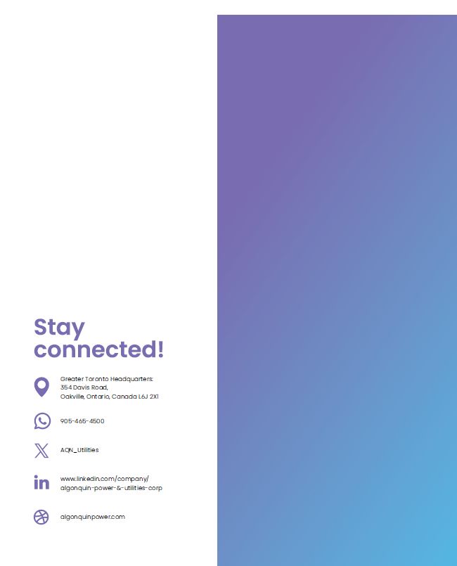 Back cover  Greater Toronto Headquarters: 354 Davis Road,  Oakville, Ontario, Canada L6J 2X1  905-465-4500  AQN_Utilities  www.linkedin.com/company/ algonquin-power-&-utilities-corp  algonquinpower.com