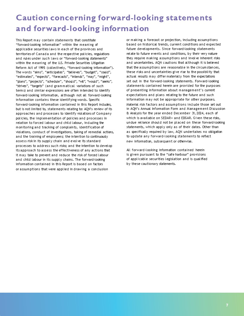 7  Caution concerning forward-looking statements and forward-looking information  This Report may contain statements that constitute “forward-looking information” within the meaning of applicable securities laws in each of the provinces and territories of Canada and the respective policies, regulations and rules under such laws or “forward-looking statements” within the meaning of the U.S. Private Securities Litigation  Reform Act of 1995 (collectively, “forward-looking information”). The words “aims”, “anticipates”, “believes”, “budget”, “could”, “estimates”, “expects”, “forecasts”, “intends”, “may”, “might”,  “plans”, “projects”, “schedule”, “should”, “will”, “would”, “seeks”, “strives”, “targets” (and grammatical variations of such terms) and similar expressions are often intended to identify forward-looking information, although not all forward-looking information contains these identifying words. Specific forward-looking information contained in this Report includes, but is not limited to, statements relating to: AQN’s review of its approaches and processes to identify violations of Company policies, the implementation of policies and processes in relation to forced labour and child labour, including the monitoring and tracking of complaints, identification of  violations, conduct of investigations, taking of remedial actions, and the training of employees; the intention to continuously assess risk in its supply chain and evolve its standard processes to address such risks; and the intention to develop its approach to assess the effectiveness of any actions that  it may take to prevent and reduce the risk of forced labour and child labour in its supply chains. The forward-looking information contained in this Report is based on factors  or assumptions that were applied in drawing a conclusion  or making a forecast or projection, including assumptions based on historical trends, current conditions and expected future developments. Since forward-looking statements relate to future events and conditions, by their very nature they require making assumptions and involve inherent risks and uncertainties. AQN cautions that although it is believed that the assumptions are reasonable in the circumstances, these risks and uncertainties give rise to the possibility that actual results may differ materially from the expectations set out in the forward-looking statements. Forward-looking statements contained herein are provided for the purposes of presenting information about management’s current expectations and plans relating to the future and such information may not be appropriate for other purposes.  Material risk factors and assumptions include those set out  in AQN’s Annual Information Form and Management Discussion & Analysis for the year ended December 31, 2024, each of which is available on SEDAR+ and EDGAR. Given these risks, undue reliance should not be placed on these forward-looking statements, which apply only as of their dates. Other than  as specifically required by law, AQN undertakes no obligation to update any forward-looking statements to reflect  new information, subsequent or otherwise.  All forward-looking information contained herein is given pursuant to the “safe harbour” provisions of applicable securities legislation and is qualified by these cautionary statements.