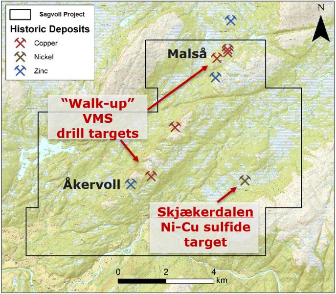 Sagvoll Project, Caledonian VMS Belt, Southern Norway: The Sagvoll project in southern Norway consists of both VMS and magmatic nickel-copper sulfide mineralization developed along the Caledonian mountain belt. At Sagvoll, mineralization and historic mining areas are positioned along a 13-kilometer trend (see Figure 2). Although multiple historic mines were developed in the area, only limited historical drilling has taken place, most of which were drilled over 100 years ago. Many prospects and mining areas remain untested. The most recent work conducted in the district took place in 2006, when Falconbridge Ltd (later Xstrata PLC) flew airborne geophysical surveys and identified five prioritized nickel-copper targets and 11 VMS targets for further exploration and drill testing. However, the follow-up exploration work was never completed.