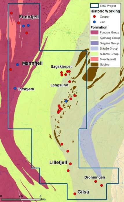 The Company and its former partner Norra Metals together with the NGU (Geological Survey of Norway) jointly carried out an airborne EM survey over the Meråker project in 2021. In 2023 EMX carried out reconnaissance mapping and sampling covering various prospects in the Meråker license block with positive base metal results. An extensive soil sampling program, including 4750 samples covered the prospective Fonnfjell, Mannfjell and Lillefjell targets, which warrant follow-up work.