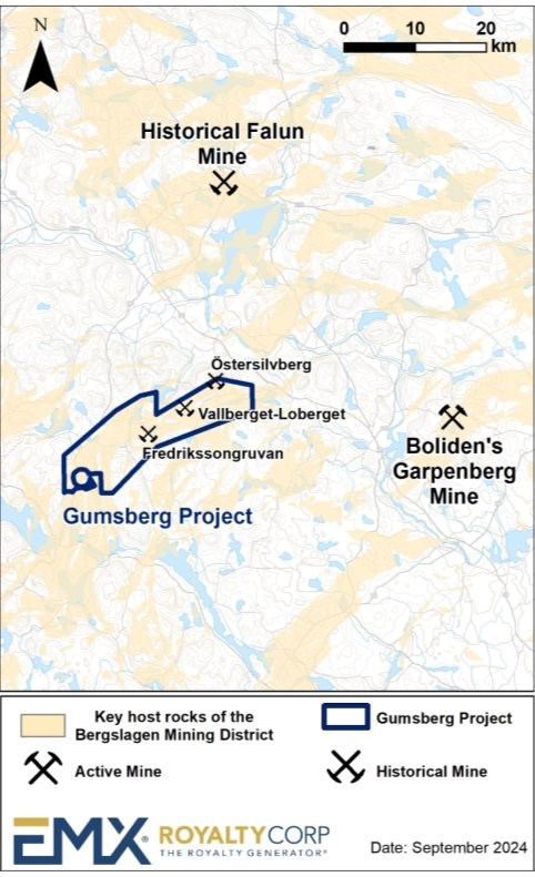 Vancouver, British Columbia, October 22, 2024 (NYSE American: EMX; TSX Venture: EMX; Frankfurt: 6E9) - EMX Royalty Corporation (the "Company" or "EMX") is pleased to announce the execution of an exploration and option agreement dated October 16, 2024 for its Gumsberg Project in Sweden to Alpha Future Funds S.C.S, a private Luxembourg based company ("Alpha"). The agreement provides EMX with a cash payment and work commitments during a one-year option period, and upon exercise of the option, EMX will receive additional deferred option payments, advance royalty payments, milestone payments and a 2% NSR royalty.