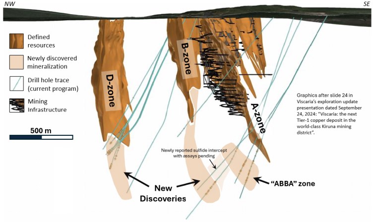 In parallel with its ongoing development work, Viscaria has been conducting its first "near mine" exploration drilling campaign, which commenced in spring of this year. According to Viscaria's most recent exploration presentation and news release1, over 9,000 meters of drilling have been completed as part of this program. This has led to the recognition and definition of additional zones of mineralization that project downward from the currently defined "D" and "B" resource areas, as well as a new zone of drill-defined mineralization that lies beneath the "A" and "B" resource areas and has been named the "ABBA" zone (see Figures 1 and 2). Viscaria has described these new discoveries as "exceptional exploration results" which highlight the considerable upside potential and optionality that exists on the project.