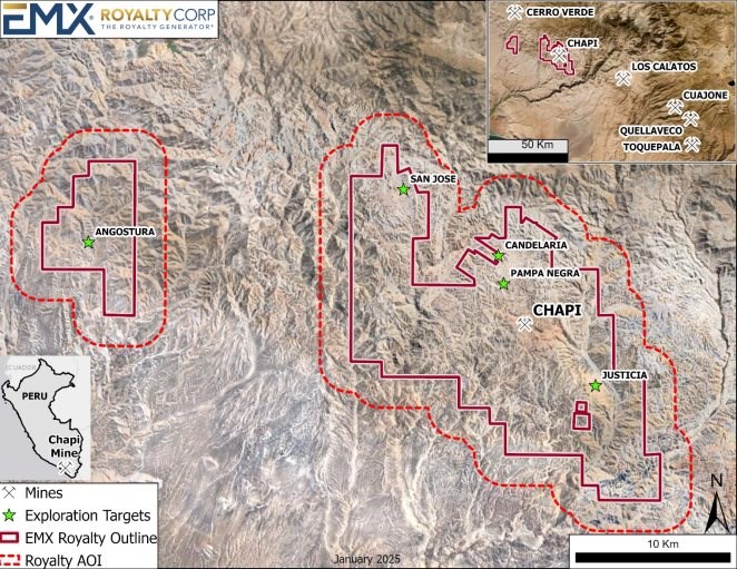 Vancouver, British Columbia, January 6, 2025 (NYSE American: EMX; TSX Venture: EMX) - EMX Royalty Corporation (the "Company" or "EMX") is pleased to announce that the Company has entered into a Royalty Agreement (the "Agreement") with Minera Pampa de Cobre S.A.C. ("MPC"), a Peruvian company focused on restarting production at the Chapi copper mine located south of the city of Arequipa in Peru (the "Chapi Mine"). MPC is owned indirectly by a privately held Canadian company, Quilla Resources Inc. ("Quilla").