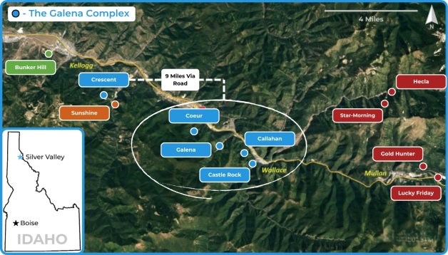 Figure 5: Location of the Crescent Silver Mine in relation to the Galena Complex and other selected properties in Idaho's Silver Valley