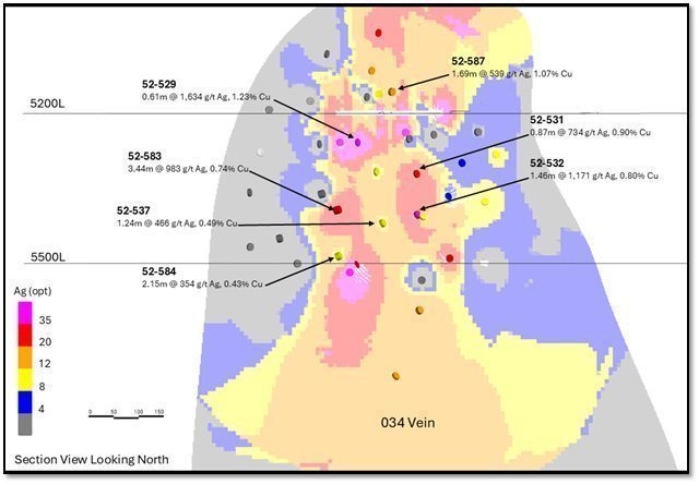 DDH C034-095 (Vein 425): 534 g/t Ag and 0.7% Cu over 1.47 m