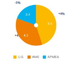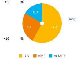 Revenue down 2.2% (due to currency headwinds), up 1.8% at constant FX, driven by a return to growth in the U.S. (led by combustibles and Velo Plus), continued growth in AME, partly offset by APMEA