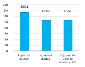 Reported diluted EPS up 1.6% to 203.6p, with adjusted diluted EPS (as adjusted for Canada) up 1.7% at constant FX