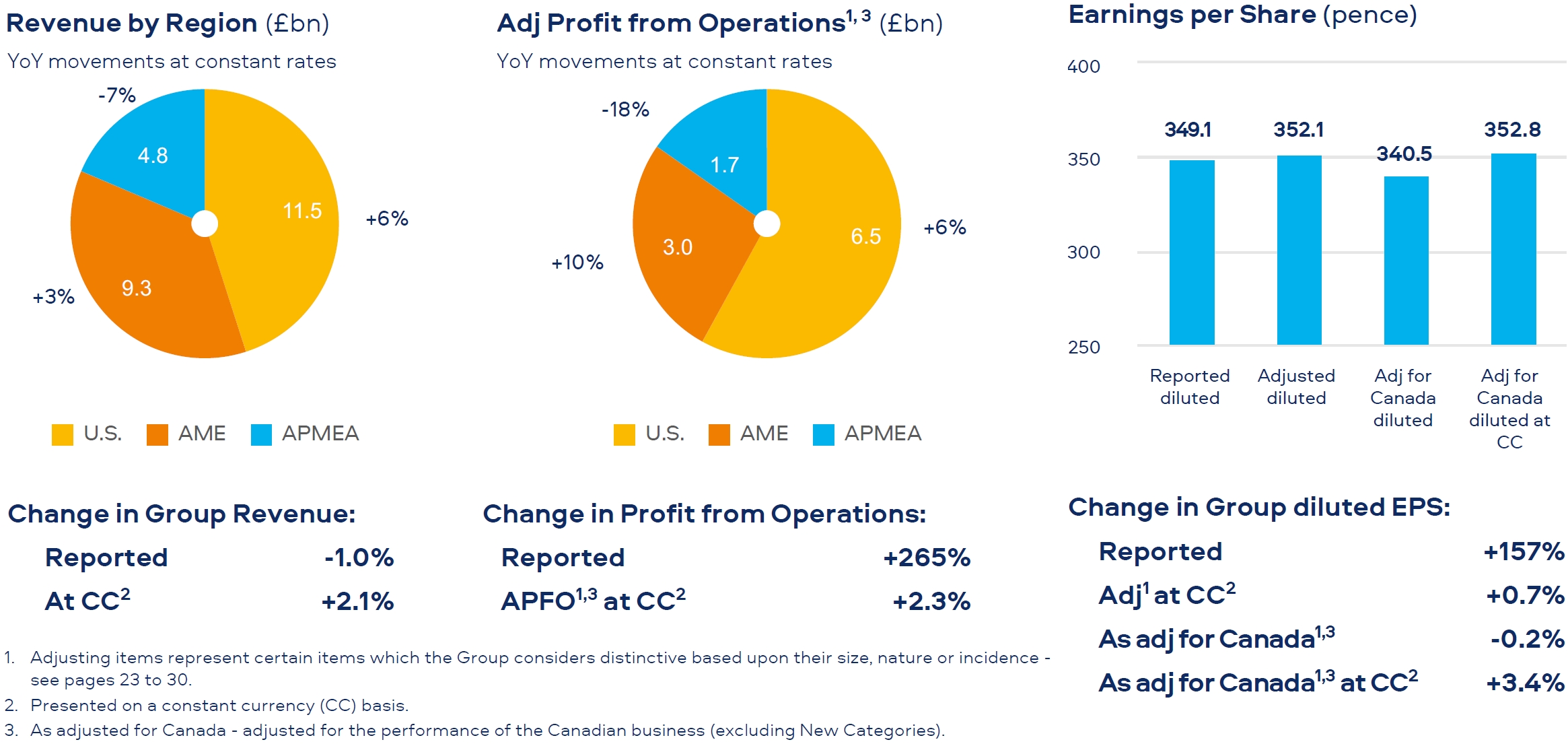 Reported diluted EPS up 157% to 349.1p, with adjusted diluted EPS1, 2,3 up 3.4%