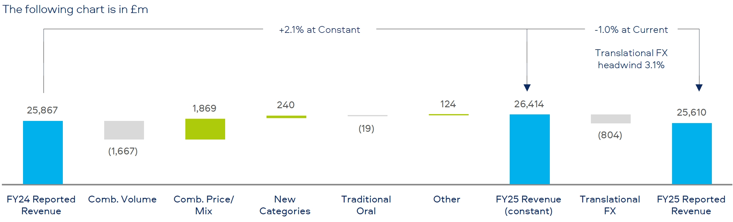 Reported revenue down 1.0% (due to currency headwinds), up 2.1% at constant FX, driven by combustibles and Velo Plus in the U.S. and continued multi-category growth in AME, partly offset by APMEA