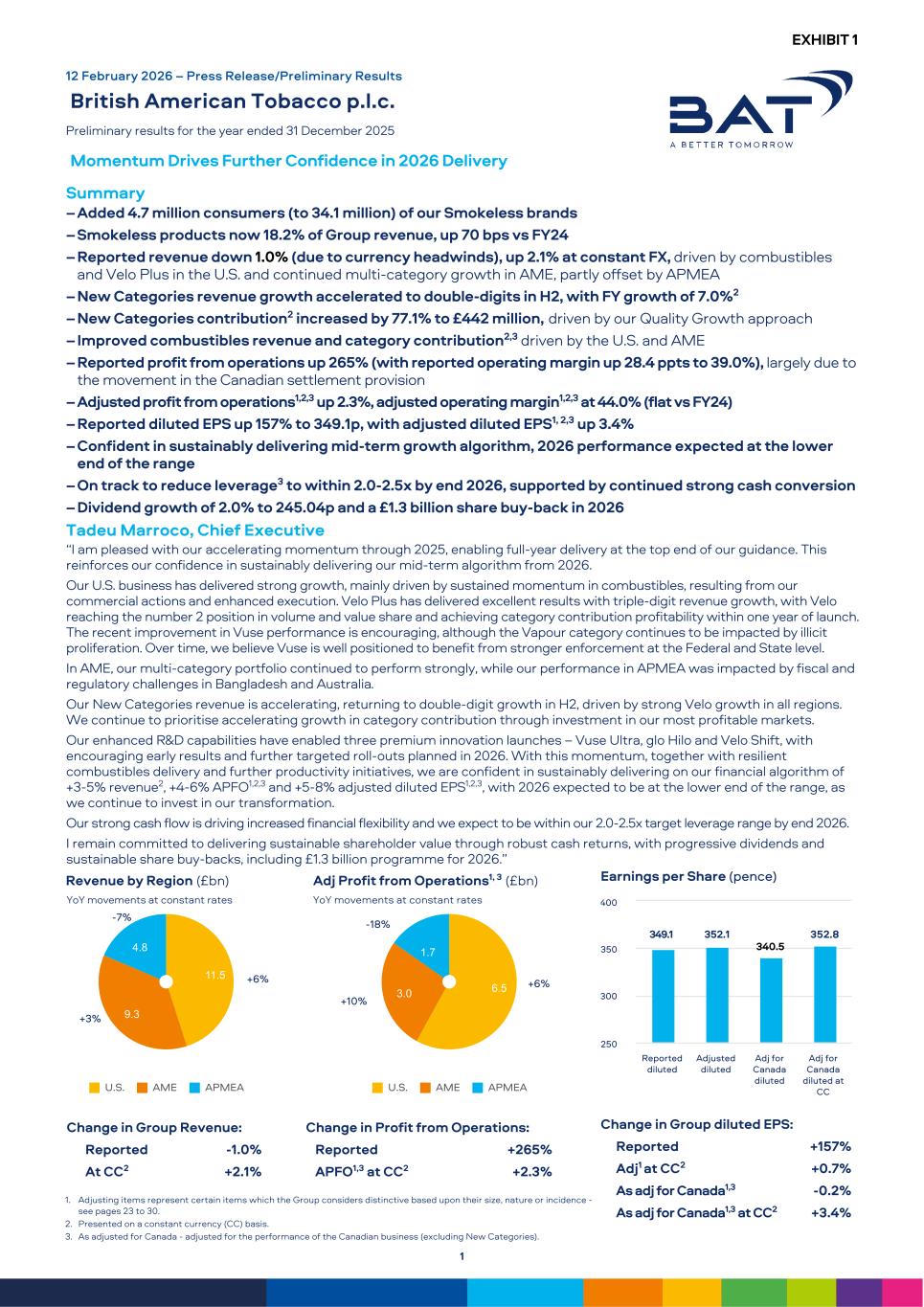 11.5 9.3 4.8 U.S. AME APMEA 6.53.0 1.7 U.S. AME APMEA Adj Profit from Operations1, 3 (£bn) YoY movements at constant rates -18 % +6 % +10% Reported diluted Adjusted diluted Adj for Canada diluted Adj for Canada diluted at CC 250 300 350 400 Earnings per Share (pence) 349.1 352.1 340.5 5 1 352.8 Change in Group diluted EPS: Reported +157 % Adj1 at CC2 +0.7 % As adj for Canada1,3 -0.2 % As adj for Canada1,3 at CC2 +3.4 % 12 February 2026 – Press Release/Preliminary Results British American Tobacco p.l.c. Preliminary results for the year ended 31 December 2025 Momentum Drives Further Confidence in 2026 Delivery Summary –Added 4.7 million consumers (to 34.1 million) of our Smokeless brands –Smokeless products now 18.2% of Group revenue, up 70 bps vs FY24 –Reported revenue down 1.0% (due to currency headwinds), up 2.1% at constant FX, driven by combustibles and Velo Plus in the U.S. and continued multi-category growth in AME, partly offset by APMEA –New Categories revenue growth accelerated to double-digits in H2, with FY growth of 7.0%2 –New Categories contribution2 increased by 77.1% to £442 million, driven by our Quality Growth approach –Improved combustibles revenue and category contribution2,3 driven by the U.S. and AME –Reported profit from operations up 265% (with reported operating margin up 28.4 ppts to 39.0%), largely due to the movement in the Canadian settlement provision –Adjusted profit from operations1,2,3 up 2.3%, adjusted operating margin1,2,3 at 44.0% (flat vs FY24) –Reported diluted EPS up 157% to 349.1p, with adjusted diluted EPS1, 2,3 up 3.4% –Confident in sustainably delivering mid-term growth algorithm, 2026 performance expected at the lower end of the range –On track to reduce leverage3 to within 2.0-2.5x by end 2026, supported by continued strong cash conversion –Dividend growth of 2.0% to 245.04p and a £1.3 billion share buy-back in 2026 Tadeu Marroco, Chief Executive “I am pleased with our accelerating momentum through 2025, enabling full-year delivery at the top end of our guidance. This reinforces our confidence in sustainably delivering our mid-term algorithm from 2026. Our U.S. business has delivered strong growth, mainly driven by sustained momentum in combustibles, resulting from our commercial actions and enhanced execution. Velo Plus has delivered excellent results with triple-digit revenue growth, with Velo reaching the number 2 position in volume and value share and achieving category contribution profitability within one year of launch. The recent improvement in Vuse performance is encouraging, although the Vapour category continues to be impacted by illicit proliferation. Over time, we believe Vuse is well positioned to benefit from stronger enforcement at the Federal and State level. In AME, our multi-category portfolio continued to perform strongly, while our performance in APMEA was impacted by fiscal and regulatory challenges in Bangladesh and Australia. Our New Categories revenue is accelerating, returning to double-digit growth in H2, driven by strong Velo growth in all regions. We continue to prioritise accelerating growth in category contribution through investment in our most profitable markets. Our enhanced R&D capabilities have enabled three premium innovation launches – Vuse Ultra, glo Hilo and Velo Shift, with encouraging early results and further targeted roll-outs planned in 2026. With this momentum, together with resilient combustibles delivery and further productivity initiatives, we are confident in sustainably delivering on our financial algorithm of +3-5% revenue2, +4-6% APFO1,2,3 and +5-8% adjusted diluted EPS1,2,3, with 2026 expected to be at the lower end of the range, as we continue to invest in our transformation. Our strong cash flow is driving increased financial flexibility and we expect to be within our 2.0-2.5x target leverage range by end 2026. I remain committed to delivering sustainable shareholder value through robust cash returns, with progressive dividends and sustainable share buy-backs, including £1.3 billion programme for 2026.” EXHIBIT 1 1 Revenue by Region (£bn) YoY movements at constant rates -7% +6% +3% Change in Profit from Operations: Reported +265 % APFO1,3 at CC2 +2.3 % Change in Group Revenue: Reported -1.0 % At CC2 +2.1 % 1. Adjusting items represent certain items which the Group considers distinctive based upon their size, nature or incidence - see pages 23 to 30. 2. Presented on a constant currency (CC) basis. 3. As adjusted for Canada - adjusted for the performance of the Canadian business (excluding New Categories).