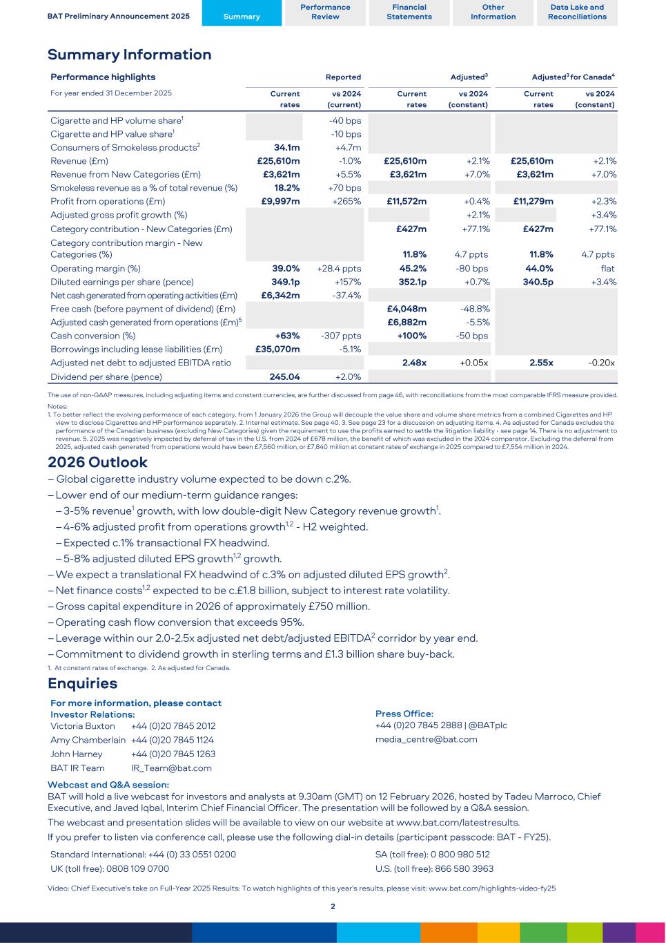 Summary Information Performance highlights Reported Adjusted3 Adjusted3 for Canada4 For year ended 31 December 2025 Current vs 2024 Current vs 2024 Current vs 2024 rates (current) rates (constant) rates (constant) Cigarette and HP volume share1 -40 bps Cigarette and HP value share1 -10 bps Consumers of Smokeless products2 34.1m +4.7m Revenue (£m) £25,610m -1.0% £25,610m +2.1 % £25,610m +2.1 % Revenue from New Categories (£m) £3,621m +5.5% £3,621m +7.0 % £3,621m +7.0 % Smokeless revenue as a % of total revenue (%) 18.2% +70 bps Profit from operations (£m) £9,997m +265% £11,572m +0.4 % £11,279m +2.3 % Adjusted gross profit growth (%) +2.1 % +3.4 % Category contribution - New Categories (£m) £427m +77.1 % £427m +77.1 % Category contribution margin - New Categories (%) 11.8% 4.7 ppts 11.8% 4.7 ppts Operating margin (%) 39.0% +28.4 ppts 45.2% -80 bps 44.0% flat Diluted earnings per share (pence) 349.1p +157% 352.1p +0.7 % 340.5p +3.4 % Net cash generated from operating activities (£m) £6,342m -37.4% Free cash (before payment of dividend) (£m) £4,048m -48.8 % Adjusted cash generated from operations (£m)5 £6,882m -5.5 % Cash conversion (%) +63% -307 ppts +100% -50 bps Borrowings including lease liabilities (£m) £35,070m -5.1% Adjusted net debt to adjusted EBITDA ratio 2.48x +0.05x 2.55x -0.20x Dividend per share (pence) 245.04 +2.0% The use of non-GAAP measures, including adjusting items and constant currencies, are further discussed from page 46, with reconciliations from the most comparable IFRS measure provided. Notes: 1. To better reflect the evolving performance of each category, from 1 January 2026 the Group will decouple the value share and volume share metrics from a combined Cigarettes and HP view to disclose Cigarettes and HP performance separately. 2. Internal estimate. See page 40. 3. See page 23 for a discussion on adjusting items. 4. As adjusted for Canada excludes the performance of the Canadian business (excluding New Categories) given the requirement to use the profits earned to settle the litigation liability - see page 14. There is no adjustment to revenue. 5. 2025 was negatively impacted by deferral of tax in the U.S. from 2024 of £678 million, the benefit of which was excluded in the 2024 comparator. Excluding the deferral from 2025, adjusted cash generated from operations would have been £7,560 million, or £7,840 million at constant rates of exchange in 2025 compared to £7,554 million in 2024. 2026 Outlook – Global cigarette industry volume expected to be down c.2%. – Lower end of our medium-term guidance ranges: – 3-5% revenue1 growth, with low double-digit New Category revenue growth1. – 4-6% adjusted profit from operations growth1,2 - H2 weighted. – Expected c.1% transactional FX headwind. – 5-8% adjusted diluted EPS growth1,2 growth. – We expect a translational FX headwind of c.3% on adjusted diluted EPS growth2. – Net finance costs1,2 expected to be c.£1.8 billion, subject to interest rate volatility. – Gross capital expenditure in 2026 of approximately £750 million. – Operating cash flow conversion that exceeds 95%. – Leverage within our 2.0-2.5x adjusted net debt/adjusted EBITDA2 corridor by year end. – Commitment to dividend growth in sterling terms and £1.3 billion share buy-back. 1. At constant rates of exchange. 2. As adjusted for Canada. Enquiries For more information, please contact Investor Relations: Victoria Buxton +44 (0)20 7845 2012 Amy Chamberlain +44 (0)20 7845 1124 John Harney +44 (0)20 7845 1263 BAT IR Team IR_Team@bat.com Press Office: +44 (0)20 7845 2888 | @BATplc media_centre@bat.com Webcast and Q&A session: BAT will hold a live webcast for investors and analysts at 9.30am (GMT) on 12 February 2026, hosted by Tadeu Marroco, Chief Executive, and Javed Iqbal, Interim Chief Financial Officer. The presentation will be followed by a Q&A session. The webcast and presentation slides will be available to view on our website at www.bat.com/latestresults. If you prefer to listen via conference call, please use the following dial-in details (participant passcode: BAT - FY25). Standard International: +44 (0) 33 0551 0200 SA (toll free): 0 800 980 512 UK (toll free): 0808 109 0700 U.S. (toll free): 866 580 3963 Video: Chief Executive's take on Full-Year 2025 Results: To watch highlights of this year's results, please visit: www.bat.com/highlights-video-fy25 BAT Preliminary Announcement 2025 Summary Performance Review Financial Statements Other Information Data Lake and Reconciliations 2