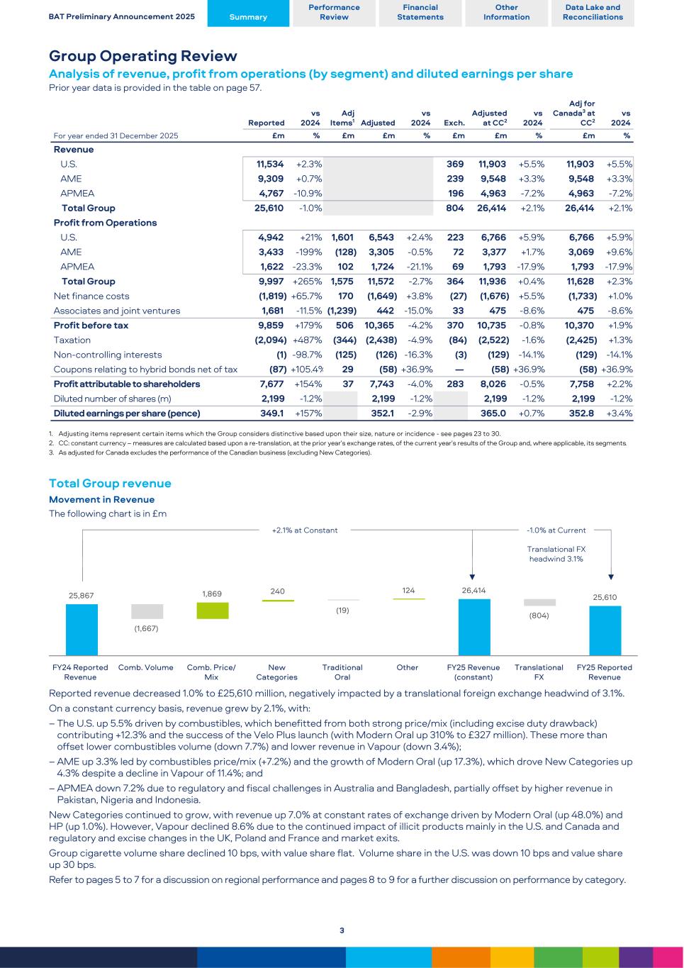 Group Operating Review Analysis of revenue, profit from operations (by segment) and diluted earnings per share Prior year data is provided in the table on page 57. For year ended 31 December 2025 Reported vs 2024 Adj Items1 Adjusted vs 2024 Exch. Adjusted at CC2 vs 2024 Adj for Canada3 at CC2 vs 2024 £m % £m £m % £m £m % £m % Revenue U.S. 11,534 +2.3 % 369 11,903 +5.5 % 11,903 +5.5 % AME 9,309 +0.7 % 239 9,548 +3.3 % 9,548 +3.3 % APMEA 4,767 -10.9 % 196 4,963 -7.2 % 4,963 -7.2 % Total Group 25,610 -1.0 % 804 26,414 +2.1 % 26,414 +2.1 % Profit from Operations U.S. 4,942 +21 % 1,601 6,543 +2.4 % 223 6,766 +5.9 % 6,766 +5.9 % AME 3,433 -199 % (128) 3,305 -0.5 % 72 3,377 +1.7 % 3,069 +9.6 % APMEA 1,622 -23.3 % 102 1,724 -21.1 % 69 1,793 -17.9 % 1,793 -17.9 % Total Group 9,997 +265 % 1,575 11,572 -2.7 % 364 11,936 +0.4 % 11,628 +2.3 % Net finance costs (1,819) +65.7 % 170 (1,649) +3.8 % (27) (1,676) +5.5 % (1,733) +1.0 % Associates and joint ventures 1,681 -11.5 % (1,239) 442 -15.0 % 33 475 -8.6 % 475 -8.6 % Profit before tax 9,859 +179 % 506 10,365 -4.2 % 370 10,735 -0.8 % 10,370 +1.9 % Taxation (2,094) +487 % (344) (2,438) -4.9 % (84) (2,522) -1.6 % (2,425) +1.3 % Non-controlling interests (1) -98.7 % (125) (126) -16.3 % (3) (129) -14.1 % (129) -14.1 % Coupons relating to hybrid bonds net of tax (87) +105.4 % 29 (58) +36.9 % — (58) +36.9 % (58) +36.9 % Profit attributable to shareholders 7,677 +154 % 37 7,743 -4.0 % 283 8,026 -0.5 % 7,758 +2.2 % Diluted number of shares (m) 2,199 -1.2 % 2,199 -1.2 % 2,199 -1.2 % 2,199 -1.2 % Diluted earnings per share (pence) 349.1 +157 % 352.1 -2.9 % 365.0 +0.7 % 352.8 +3.4 % 1. Adjusting items represent certain items which the Group considers distinctive based upon their size, nature or incidence - see pages 23 to 30. 2. CC: constant currency – measures are calculated based upon a re-translation, at the prior year’s exchange rates, of the current year’s results of the Group and, where applicable, its segments. 3. As adjusted for Canada excludes the performance of the Canadian business (excluding New Categories). Total Group revenue Movement in Revenue The following chart is in £m +2.1% at Constant -1.0% at Current Translational FX headwind 3.1% 25,867 (1,667) 1,869 240 (19) 124 26,414 (804) 25,610 FY24 Reported Revenue Comb. Volume Comb. Price/ Mix New Categories Traditional Oral Other FY25 Revenue (constant) Translational FX FY25 Reported Revenue Reported revenue decreased 1.0% to £25,610 million, negatively impacted by a translational foreign exchange headwind of 3.1%. On a constant currency basis, revenue grew by 2.1%, with: – The U.S. up 5.5% driven by combustibles, which benefitted from both strong price/mix (including excise duty drawback) contributing +12.3% and the success of the Velo Plus launch (with Modern Oral up 310% to £327 million). These more than offset lower combustibles volume (down 7.7%) and lower revenue in Vapour (down 3.4%); – AME up 3.3% led by combustibles price/mix (+7.2%) and the growth of Modern Oral (up 17.3%), which drove New Categories up 4.3% despite a decline in Vapour of 11.4%; and – APMEA down 7.2% due to regulatory and fiscal challenges in Australia and Bangladesh, partially offset by higher revenue in Pakistan, Nigeria and Indonesia. New Categories continued to grow, with revenue up 7.0% at constant rates of exchange driven by Modern Oral (up 48.0%) and HP (up 1.0%). However, Vapour declined 8.6% due to the continued impact of illicit products mainly in the U.S. and Canada and regulatory and excise changes in the UK, Poland and France and market exits. Group cigarette volume share declined 10 bps, with value share flat. Volume share in the U.S. was down 10 bps and value share up 30 bps. Refer to pages 5 to 7 for a discussion on regional performance and pages 8 to 9 for a further discussion on performance by category. BAT Preliminary Announcement 2025 Summary Performance Review Financial Statements Other Information Data Lake and Reconciliations 3