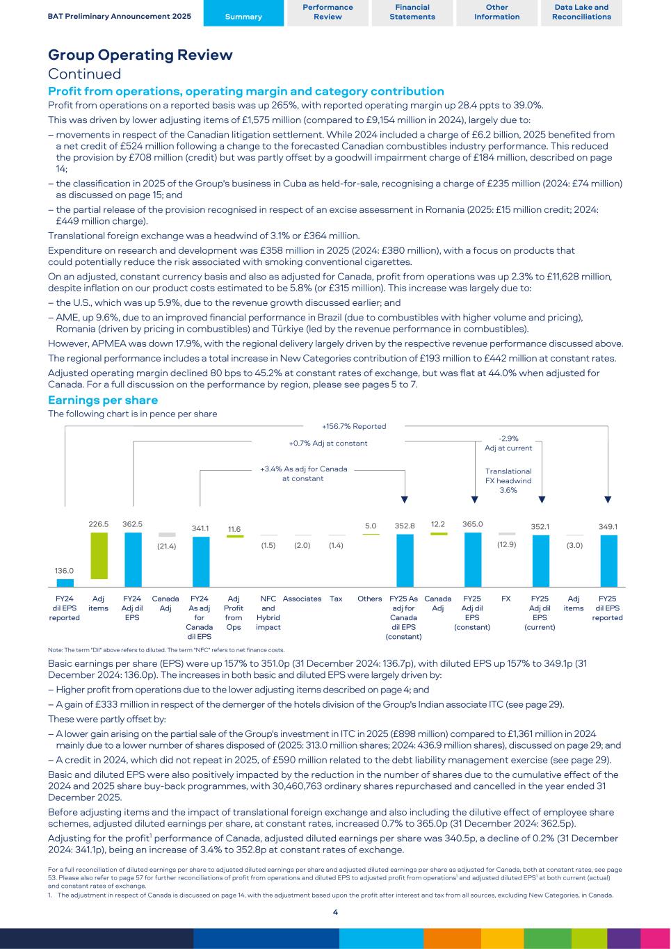 Group Operating Review Continued Profit from operations, operating margin and category contribution Profit from operations on a reported basis was up 265%, with reported operating margin up 28.4 ppts to 39.0%. This was driven by lower adjusting items of £1,575 million (compared to £9,154 million in 2024), largely due to: – movements in respect of the Canadian litigation settlement. While 2024 included a charge of £6.2 billion, 2025 benefited from a net credit of £524 million following a change to the forecasted Canadian combustibles industry performance. This reduced the provision by £708 million (credit) but was partly offset by a goodwill impairment charge of £184 million, described on page 14; – the classification in 2025 of the Group's business in Cuba as held-for-sale, recognising a charge of £235 million (2024: £74 million) as discussed on page 15; and – the partial release of the provision recognised in respect of an excise assessment in Romania (2025: £15 million credit; 2024: £449 million charge). Translational foreign exchange was a headwind of 3.1% or £364 million. Expenditure on research and development was £358 million in 2025 (2024: £380 million), with a focus on products that could potentially reduce the risk associated with smoking conventional cigarettes. On an adjusted, constant currency basis and also as adjusted for Canada, profit from operations was up 2.3% to £11,628 million, despite inflation on our product costs estimated to be 5.8% (or £315 million). This increase was largely due to: – the U.S., which was up 5.9%, due to the revenue growth discussed earlier; and – AME, up 9.6%, due to an improved financial performance in Brazil (due to combustibles with higher volume and pricing), Romania (driven by pricing in combustibles) and Türkiye (led by the revenue performance in combustibles). However, APMEA was down 17.9%, with the regional delivery largely driven by the respective revenue performance discussed above. The regional performance includes a total increase in New Categories contribution of £193 million to £442 million at constant rates. Adjusted operating margin declined 80 bps to 45.2% at constant rates of exchange, but was flat at 44.0% when adjusted for Canada. For a full discussion on the performance by region, please see pages 5 to 7. Earnings per share The following chart is in pence per share +156.7% Reported +0.7% Adj at constant -2.9% Adj at current +3.4% As adj for Canada at constant Translational FX headwind 3.6% 136.0 226.5 362.5 (21.4) 341.1 11.6 (1.5) (2.0) (1.4) 5.0 352.8 12.2 365.0 (12.9) 352.1 (3.0) 349.1 FY24 dil EPS reported Adj items FY24 Adj dil EPS Canada Adj FY24 As adj for Canada dil EPS Adj Profit from Ops NFC and Hybrid impact Associates Tax Others FY25 As adj for Canada dil EPS (constant) Canada Adj FY25 Adj dil EPS (constant) FX FY25 Adj dil EPS (current) Adj items FY25 dil EPS reported Note: The term "Dil" above refers to diluted. The term "NFC" refers to net finance costs. Basic earnings per share (EPS) were up 157% to 351.0p (31 December 2024: 136.7p), with diluted EPS up 157% to 349.1p (31 December 2024: 136.0p). The increases in both basic and diluted EPS were largely driven by: – Higher profit from operations due to the lower adjusting items described on page 4; and – A gain of £333 million in respect of the demerger of the hotels division of the Group's Indian associate ITC (see page 29). These were partly offset by: – A lower gain arising on the partial sale of the Group's investment in ITC in 2025 (£898 million) compared to £1,361 million in 2024 mainly due to a lower number of shares disposed of (2025: 313.0 million shares; 2024: 436.9 million shares), discussed on page 29; and – A credit in 2024, which did not repeat in 2025, of £590 million related to the debt liability management exercise (see page 29). Basic and diluted EPS were also positively impacted by the reduction in the number of shares due to the cumulative effect of the 2024 and 2025 share buy-back programmes, with 30,460,763 ordinary shares repurchased and cancelled in the year ended 31 December 2025. Before adjusting items and the impact of translational foreign exchange and also including the dilutive effect of employee share schemes, adjusted diluted earnings per share, at constant rates, increased 0.7% to 365.0p (31 December 2024: 362.5p). Adjusting for the profit1 performance of Canada, adjusted diluted earnings per share was 340.5p, a decline of 0.2% (31 December 2024: 341.1p), being an increase of 3.4% to 352.8p at constant rates of exchange. For a full reconciliation of diluted earnings per share to adjusted diluted earnings per share and adjusted diluted earnings per share as adjusted for Canada, both at constant rates, see page 53. Please also refer to page 57 for further reconciliations of profit from operations and diluted EPS to adjusted profit from operations1 and adjusted diluted EPS1 at both current (actual) and constant rates of exchange. 1. The adjustment in respect of Canada is discussed on page 14, with the adjustment based upon the profit after interest and tax from all sources, excluding New Categories, in Canada. BAT Preliminary Announcement 2025 Summary Performance Review Financial Statements Other Information Data Lake and Reconciliations 4