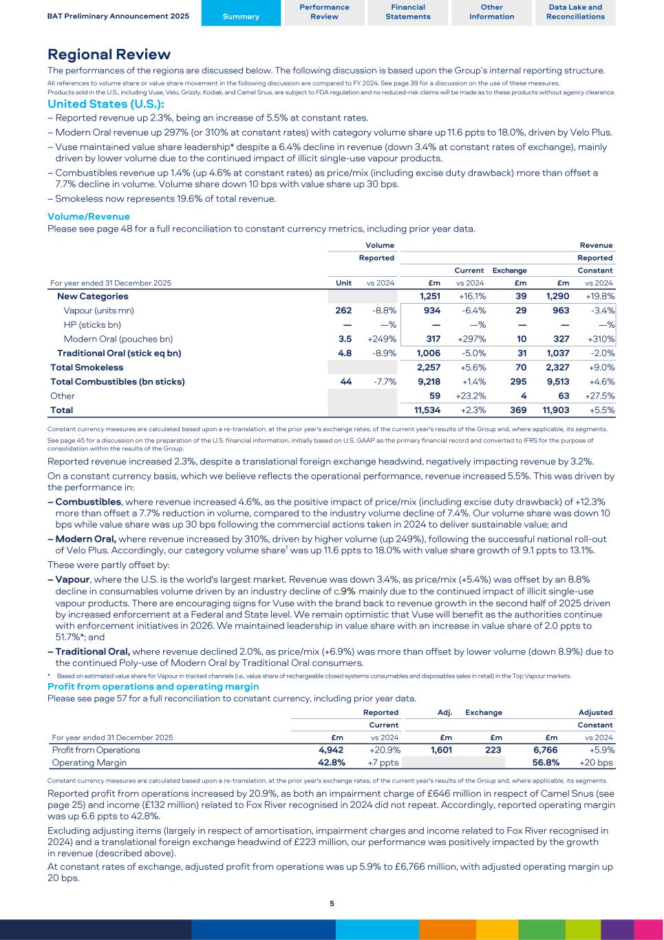 Regional Review The performances of the regions are discussed below. The following discussion is based upon the Group’s internal reporting structure. All references to volume share or value share movement in the following discussion are compared to FY 2024. See page 39 for a discussion on the use of these measures. Products sold in the U.S., including Vuse, Velo, Grizzly, Kodiak, and Camel Snus, are subject to FDA regulation and no reduced-risk claims will be made as to these products without agency clearance. United States (U.S.): – Reported revenue up 2.3%, being an increase of 5.5% at constant rates. – Modern Oral revenue up 297% (or 310% at constant rates) with category volume share up 11.6 ppts to 18.0%, driven by Velo Plus. – Vuse maintained value share leadership* despite a 6.4% decline in revenue (down 3.4% at constant rates of exchange), mainly driven by lower volume due to the continued impact of illicit single-use vapour products. – Combustibles revenue up 1.4% (up 4.6% at constant rates) as price/mix (including excise duty drawback) more than offset a 7.7% decline in volume. Volume share down 10 bps with value share up 30 bps. – Smokeless now represents 19.6% of total revenue. Volume/Revenue Please see page 48 for a full reconciliation to constant currency metrics, including prior year data. For year ended 31 December 2025 Volume Revenue Reported Reported Current Exchange Constant Unit vs 2024 £m vs 2024 £m £m vs 2024 New Categories 1,251 +16.1 % 39 1,290 +19.8 % Vapour (units mn) 262 -8.8 % 934 -6.4 % 29 963 -3.4 % HP (sticks bn) — — % — — % — — — % Modern Oral (pouches bn) 3.5 +249 % 317 +297 % 10 327 +310 % Traditional Oral (stick eq bn) 4.8 -8.9 % 1,006 -5.0 % 31 1,037 -2.0 % Total Smokeless 2,257 +5.6 % 70 2,327 +9.0 % Total Combustibles (bn sticks) 44 -7.7 % 9,218 +1.4 % 295 9,513 +4.6 % Other 59 +23.2 % 4 63 +27.5 % Total 11,534 +2.3 % 369 11,903 +5.5 % Constant currency measures are calculated based upon a re-translation, at the prior year's exchange rates, of the current year's results of the Group and, where applicable, its segments. See page 45 for a discussion on the preparation of the U.S. financial information, initially based on U.S. GAAP as the primary financial record and converted to IFRS for the purpose of consolidation within the results of the Group. Reported revenue increased 2.3%, despite a translational foreign exchange headwind, negatively impacting revenue by 3.2%. On a constant currency basis, which we believe reflects the operational performance, revenue increased 5.5%. This was driven by the performance in: – Combustibles, where revenue increased 4.6%, as the positive impact of price/mix (including excise duty drawback) of +12.3% more than offset a 7.7% reduction in volume, compared to the industry volume decline of 7.4%. Our volume share was down 10 bps while value share was up 30 bps following the commercial actions taken in 2024 to deliver sustainable value; and – Modern Oral, where revenue increased by 310%, driven by higher volume (up 249%), following the successful national roll-out of Velo Plus. Accordingly, our category volume share1 was up 11.6 ppts to 18.0% with value share growth of 9.1 ppts to 13.1%. These were partly offset by: – Vapour, where the U.S. is the world's largest market. Revenue was down 3.4%, as price/mix (+5.4%) was offset by an 8.8% decline in consumables volume driven by an industry decline of c.9% mainly due to the continued impact of illicit single-use vapour products. There are encouraging signs for Vuse with the brand back to revenue growth in the second half of 2025 driven by increased enforcement at a Federal and State level. We remain optimistic that Vuse will benefit as the authorities continue with enforcement initiatives in 2026. We maintained leadership in value share with an increase in value share of 2.0 ppts to 51.7%*; and – Traditional Oral, where revenue declined 2.0%, as price/mix (+6.9%) was more than offset by lower volume (down 8.9%) due to the continued Poly-use of Modern Oral by Traditional Oral consumers. * Based on estimated value share for Vapour in tracked channels (i.e., value share of rechargeable closed systems consumables and disposables sales in retail) in the Top Vapour markets. Profit from operations and operating margin Please see page 57 for a full reconciliation to constant currency, including prior year data. For year ended 31 December 2025 Reported Adj. Exchange Adjusted Current Constant £m vs 2024 £m £m £m vs 2024 Profit from Operations 4,942 +20.9 % 1,601 223 6,766 +5.9 % Operating Margin 42.8 % +7 ppts 56.8 % +20 bps Constant currency measures are calculated based upon a re-translation, at the prior year's exchange rates, of the current year's results of the Group and, where applicable, its segments. Reported profit from operations increased by 20.9%, as both an impairment charge of £646 million in respect of Camel Snus (see page 25) and income (£132 million) related to Fox River recognised in 2024 did not repeat. Accordingly, reported operating margin was up 6.6 ppts to 42.8%. Excluding adjusting items (largely in respect of amortisation, impairment charges and income related to Fox River recognised in 2024) and a translational foreign exchange headwind of £223 million, our performance was positively impacted by the growth in revenue (described above). At constant rates of exchange, adjusted profit from operations was up 5.9% to £6,766 million, with adjusted operating margin up 20 bps. BAT Preliminary Announcement 2025 Summary Performance Review Financial Statements Other Information Data Lake and Reconciliations 5