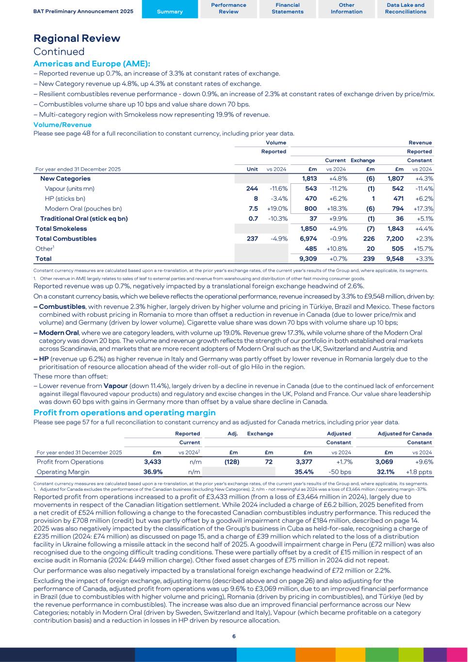 Regional Review Continued Americas and Europe (AME): – Reported revenue up 0.7%, an increase of 3.3% at constant rates of exchange. – New Category revenue up 4.8%, up 4.3% at constant rates of exchange. – Resilient combustibles revenue performance - down 0.9%, an increase of 2.3% at constant rates of exchange driven by price/mix. – Combustibles volume share up 10 bps and value share down 70 bps. – Multi-category region with Smokeless now representing 19.9% of revenue. Volume/Revenue Please see page 48 for a full reconciliation to constant currency, including prior year data. For year ended 31 December 2025 Volume Revenue Reported Reported Current Exchange Constant Unit vs 2024 £m vs 2024 £m £m vs 2024 New Categories 1,813 +4.8 % (6) 1,807 +4.3 % Vapour (units mn) 244 -11.6 % 543 -11.2 % (1) 542 -11.4 % HP (sticks bn) 8 -3.4 % 470 +6.2 % 1 471 +6.2 % Modern Oral (pouches bn) 7.5 +19.0 % 800 +18.3 % (6) 794 +17.3 % Traditional Oral (stick eq bn) 0.7 -10.3 % 37 +9.9 % (1) 36 +5.1 % Total Smokeless 1,850 +4.9 % (7) 1,843 +4.4 % Total Combustibles 237 -4.9 % 6,974 -0.9 % 226 7,200 +2.3 % Other1 485 +10.8 % 20 505 +15.7 % Total 9,309 +0.7 % 239 9,548 +3.3 % Constant currency measures are calculated based upon a re-translation, at the prior year's exchange rates, of the current year's results of the Group and, where applicable, its segments. 1. Other revenue in AME largely relates to sales of leaf to external parties and revenue from warehousing and distribution of other fast moving consumer goods. Reported revenue was up 0.7%, negatively impacted by a translational foreign exchange headwind of 2.6%. On a constant currency basis, which we believe reflects the operational performance, revenue increased by 3.3% to £9,548 million, driven by: – Combustibles, with revenue 2.3% higher, largely driven by higher volume and pricing in Türkiye, Brazil and Mexico. These factors combined with robust pricing in Romania to more than offset a reduction in revenue in Canada (due to lower price/mix and volume) and Germany (driven by lower volume). Cigarette value share was down 70 bps with volume share up 10 bps; – Modern Oral, where we are category leaders, with volume up 19.0%. Revenue grew 17.3%, while volume share of the Modern Oral category was down 20 bps. The volume and revenue growth reflects the strength of our portfolio in both established oral markets across Scandinavia, and markets that are more recent adopters of Modern Oral such as the UK, Switzerland and Austria; and – HP (revenue up 6.2%) as higher revenue in Italy and Germany was partly offset by lower revenue in Romania largely due to the prioritisation of resource allocation ahead of the wider roll-out of glo Hilo in the region. These more than offset: – Lower revenue from Vapour (down 11.4%), largely driven by a decline in revenue in Canada (due to the continued lack of enforcement against illegal flavoured vapour products) and regulatory and excise changes in the UK, Poland and France. Our value share leadership was down 60 bps with gains in Germany more than offset by a value share decline in Canada. Profit from operations and operating margin Please see page 57 for a full reconciliation to constant currency and as adjusted for Canada metrics, including prior year data. For year ended 31 December 2025 Reported Adj. Exchange Adjusted Adjusted for Canada Current Constant Constant £m vs 20242 £m £m £m vs 2024 £m vs 2024 Profit from Operations 3,433 n/m (128) 72 3,377 +1.7 % 3,069 +9.6 % Operating Margin 36.9 % n/m 35.4 % -50 bps 32.1 % +1.8 ppts Constant currency measures are calculated based upon a re-translation, at the prior year's exchange rates, of the current year's results of the Group and, where applicable, its segments. 1. Adjusted for Canada excludes the performance of the Canadian business (excluding New Categories). 2. n/m - not meaningful as 2024 was a loss of £3,464 million / operating margin -37%. Reported profit from operations increased to a profit of £3,433 million (from a loss of £3,464 million in 2024), largely due to movements in respect of the Canadian litigation settlement. While 2024 included a charge of £6.2 billion, 2025 benefited from a net credit of £524 million following a change to the forecasted Canadian combustibles industry performance. This reduced the provision by £708 million (credit) but was partly offset by a goodwill impairment charge of £184 million, described on page 14. 2025 was also negatively impacted by the classification of the Group's business in Cuba as held-for-sale, recognising a charge of £235 million (2024: £74 million) as discussed on page 15, and a charge of £39 million which related to the loss of a distribution facility in Ukraine following a missile attack in the second half of 2025. A goodwill impairment charge in Peru (£72 million) was also recognised due to the ongoing difficult trading conditions. These were partially offset by a credit of £15 million in respect of an excise audit in Romania (2024: £449 million charge). Other fixed asset charges of £75 million in 2024 did not repeat. Our performance was also negatively impacted by a translational foreign exchange headwind of £72 million or 2.2%. Excluding the impact of foreign exchange, adjusting items (described above and on page 26) and also adjusting for the performance of Canada, adjusted profit from operations was up 9.6% to £3,069 million, due to an improved financial performance in Brazil (due to combustibles with higher volume and pricing), Romania (driven by pricing in combustibles), and Türkiye (led by the revenue performance in combustibles). The increase was also due an improved financial performance across our New Categories; notably in Modern Oral (driven by Sweden, Switzerland and Italy), Vapour (which became profitable on a category contribution basis) and a reduction in losses in HP driven by resource allocation. BAT Preliminary Announcement 2025 Summary Perfor
