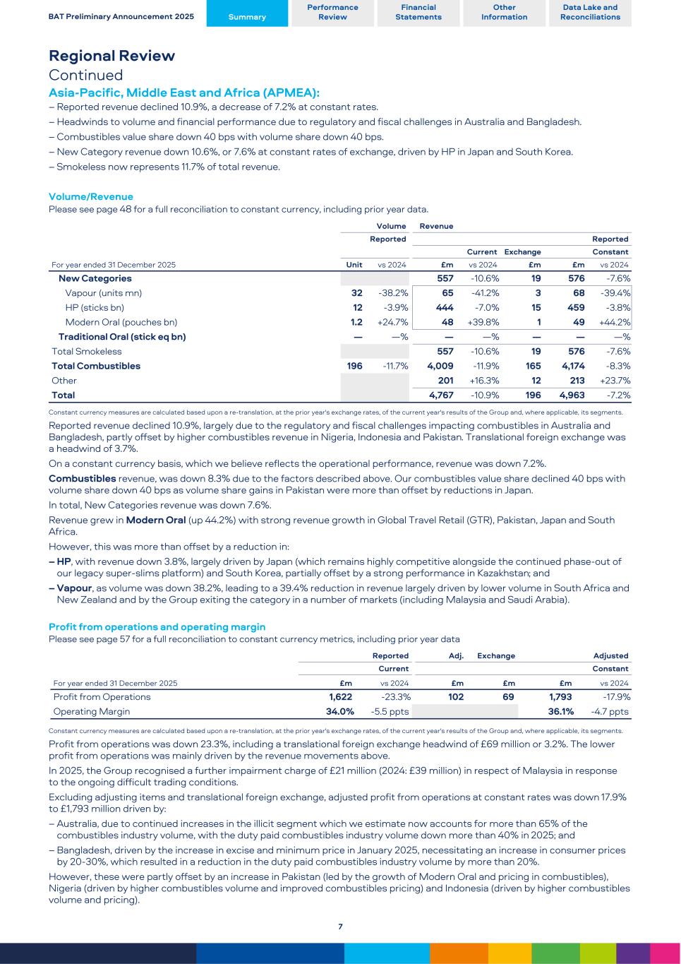 Regional Review Continued Asia-Pacific, Middle East and Africa (APMEA): – Reported revenue declined 10.9%, a decrease of 7.2% at constant rates. – Headwinds to volume and financial performance due to regulatory and fiscal challenges in Australia and Bangladesh. – Combustibles value share down 40 bps with volume share down 40 bps. – New Category revenue down 10.6%, or 7.6% at constant rates of exchange, driven by HP in Japan and South Korea. – Smokeless now represents 11.7% of total revenue. Volume/Revenue Please see page 48 for a full reconciliation to constant currency, including prior year data. For year ended 31 December 2025 Volume Revenue Reported Reported Current Exchange Constant Unit vs 2024 £m vs 2024 £m £m vs 2024 New Categories 557 -10.6 % 19 576 -7.6 % Vapour (units mn) 32 -38.2 % 65 -41.2 % 3 68 -39.4 % HP (sticks bn) 12 -3.9 % 444 -7.0 % 15 459 -3.8 % Modern Oral (pouches bn) 1.2 +24.7 % 48 +39.8 % 1 49 +44.2 % Traditional Oral (stick eq bn) — — % — — % — — — % Total Smokeless 557 -10.6 % 19 576 -7.6 % Total Combustibles 196 -11.7 % 4,009 -11.9 % 165 4,174 -8.3 % Other 201 +16.3 % 12 213 +23.7 % Total 4,767 -10.9 % 196 4,963 -7.2 % Constant currency measures are calculated based upon a re-translation, at the prior year's exchange rates, of the current year's results of the Group and, where applicable, its segments. Reported revenue declined 10.9%, largely due to the regulatory and fiscal challenges impacting combustibles in Australia and Bangladesh, partly offset by higher combustibles revenue in Nigeria, Indonesia and Pakistan. Translational foreign exchange was a headwind of 3.7%. On a constant currency basis, which we believe reflects the operational performance, revenue was down 7.2%. Combustibles revenue, was down 8.3% due to the factors described above. Our combustibles value share declined 40 bps with volume share down 40 bps as volume share gains in Pakistan were more than offset by reductions in Japan. In total, New Categories revenue was down 7.6%. Revenue grew in Modern Oral (up 44.2%) with strong revenue growth in Global Travel Retail (GTR), Pakistan, Japan and South Africa. However, this was more than offset by a reduction in: – HP, with revenue down 3.8%, largely driven by Japan (which remains highly competitive alongside the continued phase-out of our legacy super-slims platform) and South Korea, partially offset by a strong performance in Kazakhstan; and – Vapour, as volume was down 38.2%, leading to a 39.4% reduction in revenue largely driven by lower volume in South Africa and New Zealand and by the Group exiting the category in a number of markets (including Malaysia and Saudi Arabia). Profit from operations and operating margin Please see page 57 for a full reconciliation to constant currency metrics, including prior year data For year ended 31 December 2025 Reported Adj. Exchange Adjusted Current Constant £m vs 2024 £m £m £m vs 2024 Profit from Operations 1,622 -23.3 % 102 69 1,793 -17.9 % Operating Margin 34.0 % -5.5 ppts 36.1 % -4.7 ppts Constant currency measures are calculated based upon a re-translation, at the prior year's exchange rates, of the current year's results of the Group and, where applicable, its segments. Profit from operations was down 23.3%, including a translational foreign exchange headwind of £69 million or 3.2%. The lower profit from operations was mainly driven by the revenue movements above. In 2025, the Group recognised a further impairment charge of £21 million (2024: £39 million) in respect of Malaysia in response to the ongoing difficult trading conditions. Excluding adjusting items and translational foreign exchange, adjusted profit from operations at constant rates was down 17.9% to £1,793 million driven by: – Australia, due to continued increases in the illicit segment which we estimate now accounts for more than 65% of the combustibles industry volume, with the duty paid combustibles industry volume down more than 40% in 2025; and – Bangladesh, driven by the increase in excise and minimum price in January 2025, necessitating an increase in consumer prices by 20-30%, which resulted in a reduction in the duty paid combustibles industry volume by more than 20%. However, these were partly offset by an increase in Pakistan (led by the growth of Modern Oral and pricing in combustibles), Nigeria (driven by higher combustibles volume and improved combustibles pricing) and Indonesia (driven by higher combustibles volume and pricing). BAT Preliminary Announcement 2025 Summary Performance Review Financial Statements Other Information Data Lake and Reconciliations 7