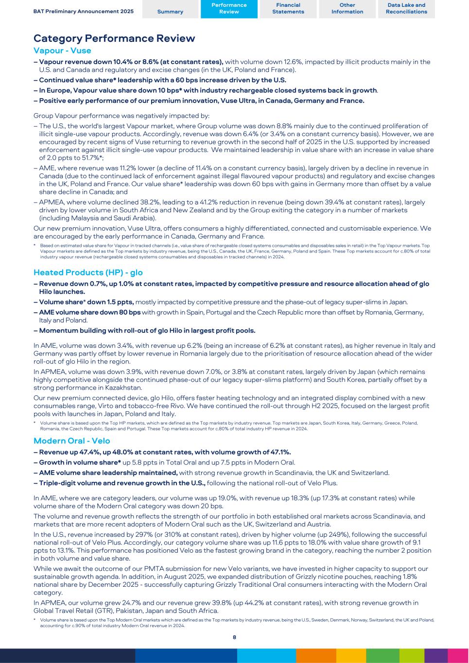 Category Performance Review Vapour - Vuse – Vapour revenue down 10.4% or 8.6% (at constant rates), with volume down 12.6%, impacted by illicit products mainly in the U.S. and Canada and regulatory and excise changes (in the UK, Poland and France). – Continued value share* leadership with a 60 bps increase driven by the U.S. – In Europe, Vapour value share down 10 bps* with industry rechargeable closed systems back in growth. – Positive early performance of our premium innovation, Vuse Ultra, in Canada, Germany and France. Group Vapour performance was negatively impacted by: – The U.S., the world's largest Vapour market, where Group volume was down 8.8% mainly due to the continued proliferation of illicit single-use vapour products. Accordingly, revenue was down 6.4% (or 3.4% on a constant currency basis). However, we are encouraged by recent signs of Vuse returning to revenue growth in the second half of 2025 in the U.S. supported by increased enforcement against illicit single-use vapour products. We maintained leadership in value share with an increase in value share of 2.0 ppts to 51.7%*; – AME, where revenue was 11.2% lower (a decline of 11.4% on a constant currency basis), largely driven by a decline in revenue in Canada (due to the continued lack of enforcement against illegal flavoured vapour products) and regulatory and excise changes in the UK, Poland and France. Our value share* leadership was down 60 bps with gains in Germany more than offset by a value share decline in Canada; and – APMEA, where volume declined 38.2%, leading to a 41.2% reduction in revenue (being down 39.4% at constant rates), largely driven by lower volume in South Africa and New Zealand and by the Group exiting the category in a number of markets (including Malaysia and Saudi Arabia). Our new premium innovation, Vuse Ultra, offers consumers a highly differentiated, connected and customisable experience. We are encouraged by the early performance in Canada, Germany and France. * Based on estimated value share for Vapour in tracked channels (i.e., value share of rechargeable closed systems consumables and disposables sales in retail) in the Top Vapour markets. Top Vapour markets are defined as the Top markets by industry revenue, being the U.S., Canada, the UK, France, Germany, Poland and Spain. These Top markets account for c.80% of total industry vapour revenue (rechargeable closed systems consumables and disposables in tracked channels) in 2024. Heated Products (HP) - glo – Revenue down 0.7%, up 1.0% at constant rates, impacted by competitive pressure and resource allocation ahead of glo Hilo launches. – Volume share* down 1.5 ppts, mostly impacted by competitive pressure and the phase-out of legacy super-slims in Japan. – AME volume share down 80 bps with growth in Spain, Portugal and the Czech Republic more than offset by Romania, Germany, Italy and Poland. – Momentum building with roll-out of glo Hilo in largest profit pools. In AME, volume was down 3.4%, with revenue up 6.2% (being an increase of 6.2% at constant rates), as higher revenue in Italy and Germany was partly offset by lower revenue in Romania largely due to the prioritisation of resource allocation ahead of the wider roll-out of glo Hilo in the region. In APMEA, volume was down 3.9%, with revenue down 7.0%, or 3.8% at constant rates, largely driven by Japan (which remains highly competitive alongside the continued phase-out of our legacy super-slims platform) and South Korea, partially offset by a strong performance in Kazakhstan. Our new premium connected device, glo Hilo, offers faster heating technology and an integrated display combined with a new consumables range, Virto and tobacco-free Rivo. We have continued the roll-out through H2 2025, focused on the largest profit pools with launches in Japan, Poland and Italy. * Volume share is based upon the Top HP markets, which are defined as the Top markets by industry revenue. Top markets are Japan, South Korea, Italy, Germany, Greece, Poland, Romania, the Czech Republic, Spain and Portugal. These Top markets account for c.80% of total industry HP revenue in 2024. Modern Oral - Velo – Revenue up 47.4%, up 48.0% at constant rates, with volume growth of 47.1%. – Growth in volume share* up 5.8 ppts in Total Oral and up 7.5 ppts in Modern Oral. – AME volume share leadership maintained, with strong revenue growth in Scandinavia, the UK and Switzerland. – Triple-digit volume and revenue growth in the U.S., following the national roll-out of Velo Plus. In AME, where we are category leaders, our volume was up 19.0%, with revenue up 18.3% (up 17.3% at constant rates) while volume share of the Modern Oral category was down 20 bps. The volume and revenue growth reflects the strength of our portfolio in both established oral markets across Scandinavia, and markets that are more recent adopters of Modern Oral such as the UK, Switzerland and Austria. In the U.S., revenue increased by 297% (or 310% at constant rates), driven by higher volume (up 249%), following the successful national roll-out of Velo Plus. Accordingly, our category volume share was up 11.6 ppts to 18.0% with value share growth of 9.1 ppts to 13.1%. This performance has positioned Velo as the fastest growing brand in the category, reaching the number 2 position in both volume and value share. While we await the outcome of our PMTA submission for new Velo variants, we have invested in higher capacity to support our sustainable growth agenda. In addition, in August 2025, we expanded distribution of Grizzly nicotine pouches, reaching 1.8% national share by December 2025 - successfully capturing Grizzly Traditional Oral consumers interacting with the Modern Oral category. In APMEA, our volume grew 24.7% and our revenue grew 39.8% (up 44.2% at constant rates), with strong revenue growth in Global Travel Retail (GTR), Pakistan, Japan and South Africa. * Volume share is based upon the Top Modern Oral markets