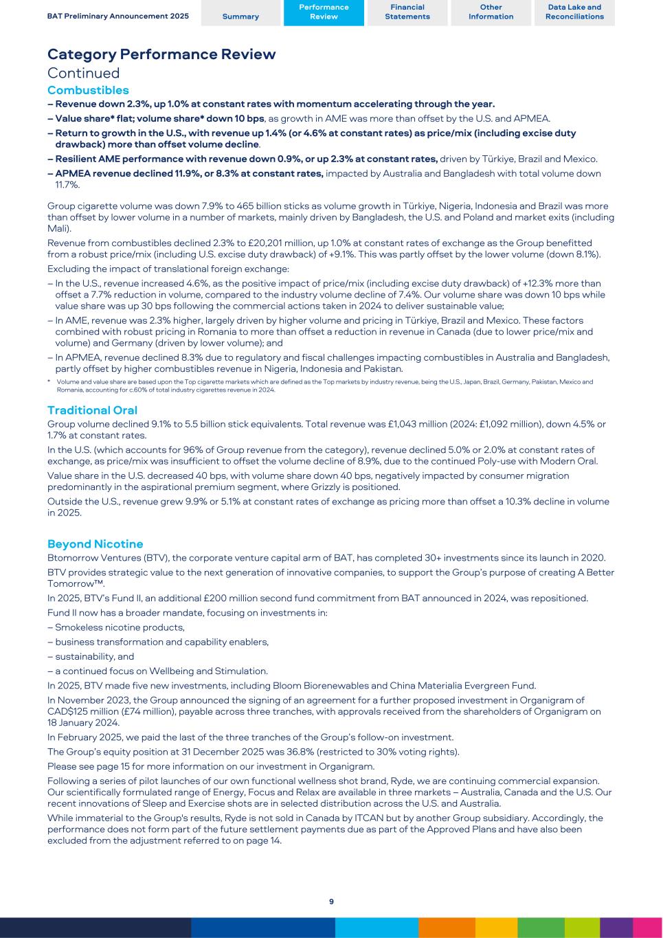 Category Performance Review Continued Combustibles – Revenue down 2.3%, up 1.0% at constant rates with momentum accelerating through the year. – Value share* flat; volume share* down 10 bps, as growth in AME was more than offset by the U.S. and APMEA. – Return to growth in the U.S., with revenue up 1.4% (or 4.6% at constant rates) as price/mix (including excise duty drawback) more than offset volume decline. – Resilient AME performance with revenue down 0.9%, or up 2.3% at constant rates, driven by Türkiye, Brazil and Mexico. – APMEA revenue declined 11.9%, or 8.3% at constant rates, impacted by Australia and Bangladesh with total volume down 11.7%. Group cigarette volume was down 7.9% to 465 billion sticks as volume growth in Türkiye, Nigeria, Indonesia and Brazil was more than offset by lower volume in a number of markets, mainly driven by Bangladesh, the U.S. and Poland and market exits (including Mali). Revenue from combustibles declined 2.3% to £20,201 million, up 1.0% at constant rates of exchange as the Group benefitted from a robust price/mix (including U.S. excise duty drawback) of +9.1%. This was partly offset by the lower volume (down 8.1%). Excluding the impact of translational foreign exchange: – In the U.S., revenue increased 4.6%, as the positive impact of price/mix (including excise duty drawback) of +12.3% more than offset a 7.7% reduction in volume, compared to the industry volume decline of 7.4%. Our volume share was down 10 bps while value share was up 30 bps following the commercial actions taken in 2024 to deliver sustainable value; – In AME, revenue was 2.3% higher, largely driven by higher volume and pricing in Türkiye, Brazil and Mexico. These factors combined with robust pricing in Romania to more than offset a reduction in revenue in Canada (due to lower price/mix and volume) and Germany (driven by lower volume); and – In APMEA, revenue declined 8.3% due to regulatory and fiscal challenges impacting combustibles in Australia and Bangladesh, partly offset by higher combustibles revenue in Nigeria, Indonesia and Pakistan. * Volume and value share are based upon the Top cigarette markets which are defined as the Top markets by industry revenue, being the U.S., Japan, Brazil, Germany, Pakistan, Mexico and Romania, accounting for c.60% of total industry cigarettes revenue in 2024. Traditional Oral Group volume declined 9.1% to 5.5 billion stick equivalents. Total revenue was £1,043 million (2024: £1,092 million), down 4.5% or 1.7% at constant rates. In the U.S. (which accounts for 96% of Group revenue from the category), revenue declined 5.0% or 2.0% at constant rates of exchange, as price/mix was insufficient to offset the volume decline of 8.9%, due to the continued Poly-use with Modern Oral. Value share in the U.S. decreased 40 bps, with volume share down 40 bps, negatively impacted by consumer migration predominantly in the aspirational premium segment, where Grizzly is positioned. Outside the U.S., revenue grew 9.9% or 5.1% at constant rates of exchange as pricing more than offset a 10.3% decline in volume in 2025. Beyond Nicotine Btomorrow Ventures (BTV), the corporate venture capital arm of BAT, has completed 30+ investments since its launch in 2020. BTV provides strategic value to the next generation of innovative companies, to support the Group’s purpose of creating A Better Tomorrow™. In 2025, BTV’s Fund II, an additional £200 million second fund commitment from BAT announced in 2024, was repositioned. Fund II now has a broader mandate, focusing on investments in: – Smokeless nicotine products, – business transformation and capability enablers, – sustainability, and – a continued focus on Wellbeing and Stimulation. In 2025, BTV made five new investments, including Bloom Biorenewables and China Materialia Evergreen Fund. In November 2023, the Group announced the signing of an agreement for a further proposed investment in Organigram of CAD$125 million (£74 million), payable across three tranches, with approvals received from the shareholders of Organigram on 18 January 2024. In February 2025, we paid the last of the three tranches of the Group’s follow-on investment. The Group’s equity position at 31 December 2025 was 36.8% (restricted to 30% voting rights). Please see page 15 for more information on our investment in Organigram. Following a series of pilot launches of our own functional wellness shot brand, Ryde, we are continuing commercial expansion. Our scientifically formulated range of Energy, Focus and Relax are available in three markets – Australia, Canada and the U.S. Our recent innovations of Sleep and Exercise shots are in selected distribution across the U.S. and Australia. While immaterial to the Group's results, Ryde is not sold in Canada by ITCAN but by another Group subsidiary. Accordingly, the performance does not form part of the future settlement payments due as part of the Approved Plans and have also been excluded from the adjustment referred to on page 14. BAT Preliminary Announcement 2025 Summary Performance Review Financial Statements Other Information Data Lake and Reconciliations 9