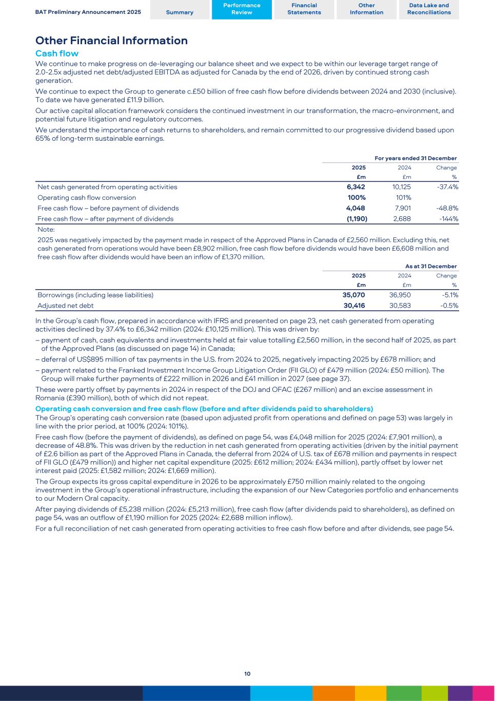 Other Financial Information Cash flow We continue to make progress on de-leveraging our balance sheet and we expect to be within our leverage target range of 2.0-2.5x adjusted net debt/adjusted EBITDA as adjusted for Canada by the end of 2026, driven by continued strong cash generation. We continue to expect the Group to generate c.£50 billion of free cash flow before dividends between 2024 and 2030 (inclusive). To date we have generated £11.9 billion. Our active capital allocation framework considers the continued investment in our transformation, the macro-environment, and potential future litigation and regulatory outcomes. We understand the importance of cash returns to shareholders, and remain committed to our progressive dividend based upon 65% of long-term sustainable earnings. For years ended 31 December 2025 2024 Change £m £m % Net cash generated from operating activities 6,342 10,125 -37.4 % Operating cash flow conversion 100% 101% Free cash flow – before payment of dividends 4,048 7,901 -48.8 % Free cash flow – after payment of dividends (1,190) 2,688 -144 % Note: 2025 was negatively impacted by the payment made in respect of the Approved Plans in Canada of £2,560 million. Excluding this, net cash generated from operations would have been £8,902 million, free cash flow before dividends would have been £6,608 million and free cash flow after dividends would have been an inflow of £1,370 million. As at 31 December 2025 2024 Change £m £m % Borrowings (including lease liabilities) 35,070 36,950 -5.1 % Adjusted net debt 30,416 30,583 -0.5 % In the Group’s cash flow, prepared in accordance with IFRS and presented on page 23, net cash generated from operating activities declined by 37.4% to £6,342 million (2024: £10,125 million). This was driven by: – payment of cash, cash equivalents and investments held at fair value totalling £2,560 million, in the second half of 2025, as part of the Approved Plans (as discussed on page 14) in Canada; – deferral of US$895 million of tax payments in the U.S. from 2024 to 2025, negatively impacting 2025 by £678 million; and – payment related to the Franked Investment Income Group Litigation Order (FII GLO) of £479 million (2024: £50 million). The Group will make further payments of £222 million in 2026 and £41 million in 2027 (see page 37). These were partly offset by payments in 2024 in respect of the DOJ and OFAC (£267 million) and an excise assessment in Romania (£390 million), both of which did not repeat. Operating cash conversion and free cash flow (before and after dividends paid to shareholders) The Group’s operating cash conversion rate (based upon adjusted profit from operations and defined on page 53) was largely in line with the prior period, at 100% (2024: 101%). Free cash flow (before the payment of dividends), as defined on page 54, was £4,048 million for 2025 (2024: £7,901 million), a decrease of 48.8%. This was driven by the reduction in net cash generated from operating activities (driven by the initial payment of £2.6 billion as part of the Approved Plans in Canada, the deferral from 2024 of U.S. tax of £678 million and payments in respect of FII GLO (£479 million)) and higher net capital expenditure (2025: £612 million; 2024: £434 million), partly offset by lower net interest paid (2025: £1,582 million; 2024: £1,669 million). The Group expects its gross capital expenditure in 2026 to be approximately £750 million mainly related to the ongoing investment in the Group’s operational infrastructure, including the expansion of our New Categories portfolio and enhancements to our Modern Oral capacity. After paying dividends of £5,238 million (2024: £5,213 million), free cash flow (after dividends paid to shareholders), as defined on page 54, was an outflow of £1,190 million for 2025 (2024: £2,688 million inflow). For a full reconciliation of net cash generated from operating activities to free cash flow before and after dividends, see page 54. BAT Preliminary Announcement 2025 Summary Performance Review Financial Statements Other Information Data Lake and Reconciliations 10