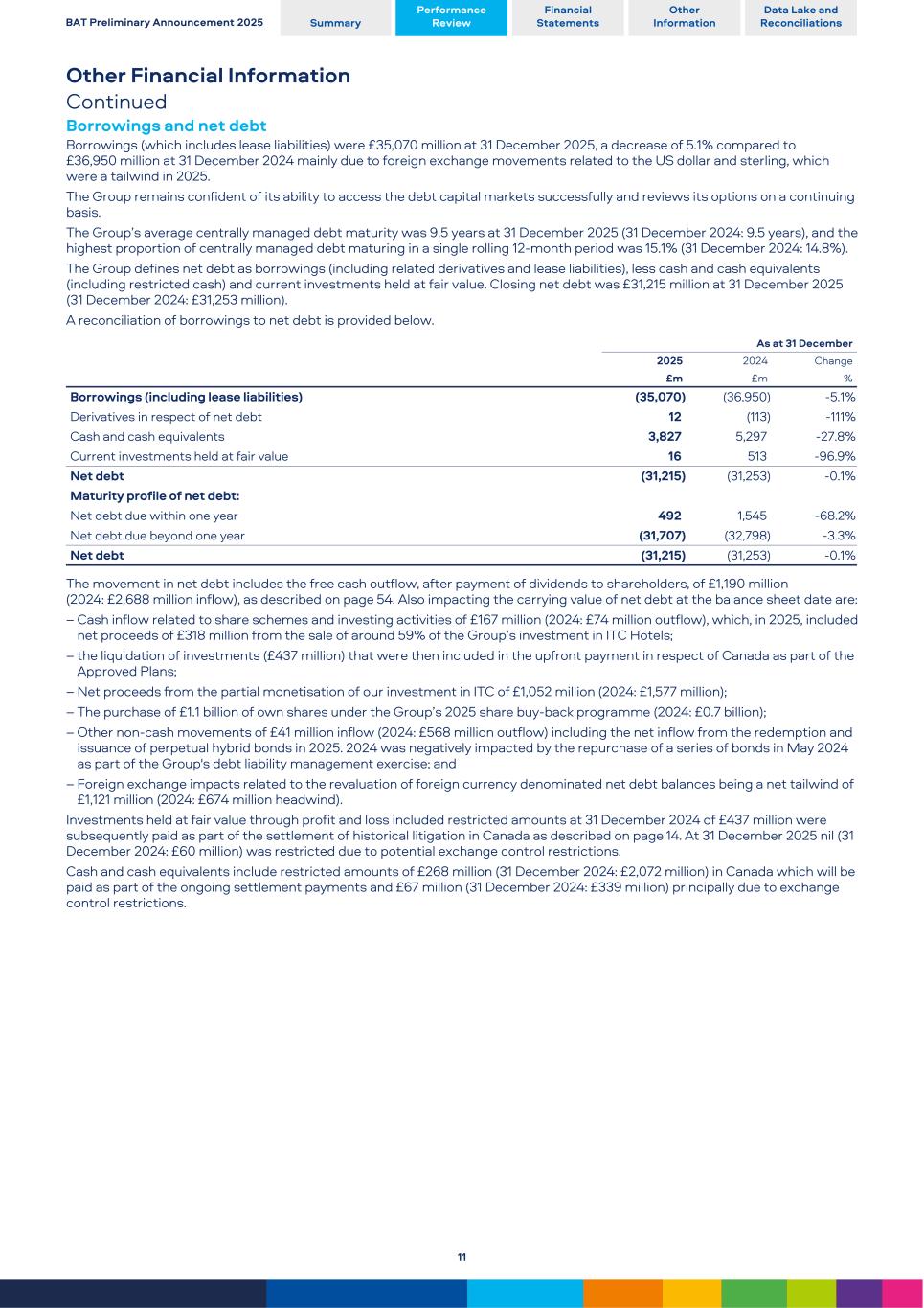 Other Financial Information Continued Borrowings and net debt Borrowings (which includes lease liabilities) were £35,070 million at 31 December 2025, a decrease of 5.1% compared to £36,950 million at 31 December 2024 mainly due to foreign exchange movements related to the US dollar and sterling, which were a tailwind in 2025. The Group remains confident of its ability to access the debt capital markets successfully and reviews its options on a continuing basis. The Group’s average centrally managed debt maturity was 9.5 years at 31 December 2025 (31 December 2024: 9.5 years), and the highest proportion of centrally managed debt maturing in a single rolling 12-month period was 15.1% (31 December 2024: 14.8%). The Group defines net debt as borrowings (including related derivatives and lease liabilities), less cash and cash equivalents (including restricted cash) and current investments held at fair value. Closing net debt was £31,215 million at 31 December 2025 (31 December 2024: £31,253 million). A reconciliation of borrowings to net debt is provided below. As at 31 December 2025 2024 Change £m £m % Borrowings (including lease liabilities) (35,070) (36,950) -5.1 % Derivatives in respect of net debt 12 (113) -111 % Cash and cash equivalents 3,827 5,297 -27.8 % Current investments held at fair value 16 513 -96.9 % Net debt (31,215) (31,253) -0.1 % Maturity profile of net debt: Net debt due within one year 492 1,545 -68.2 % Net debt due beyond one year (31,707) (32,798) -3.3 % Net debt (31,215) (31,253) -0.1 % The movement in net debt includes the free cash outflow, after payment of dividends to shareholders, of £1,190 million (2024: £2,688 million inflow), as described on page 54. Also impacting the carrying value of net debt at the balance sheet date are: – Cash inflow related to share schemes and investing activities of £167 million (2024: £74 million outflow), which, in 2025, included net proceeds of £318 million from the sale of around 59% of the Group’s investment in ITC Hotels; – the liquidation of investments (£437 million) that were then included in the upfront payment in respect of Canada as part of the Approved Plans; – Net proceeds from the partial monetisation of our investment in ITC of £1,052 million (2024: £1,577 million); – The purchase of £1.1 billion of own shares under the Group’s 2025 share buy-back programme (2024: £0.7 billion); – Other non-cash movements of £41 million inflow (2024: £568 million outflow) including the net inflow from the redemption and issuance of perpetual hybrid bonds in 2025. 2024 was negatively impacted by the repurchase of a series of bonds in May 2024 as part of the Group's debt liability management exercise; and – Foreign exchange impacts related to the revaluation of foreign currency denominated net debt balances being a net tailwind of £1,121 million (2024: £674 million headwind). Investments held at fair value through profit and loss included restricted amounts at 31 December 2024 of £437 million were subsequently paid as part of the settlement of historical litigation in Canada as described on page 14. At 31 December 2025 nil (31 December 2024: £60 million) was restricted due to potential exchange control restrictions. Cash and cash equivalents include restricted amounts of £268 million (31 December 2024: £2,072 million) in Canada which will be paid as part of the ongoing settlement payments and £67 million (31 December 2024: £339 million) principally due to exchange control restrictions. BAT Preliminary Announcement 2025 Summary Performance Review Financial Statements Other Information Data Lake and Reconciliations 11