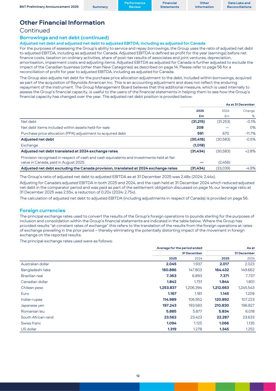 Other Financial Information Continued Borrowings and net debt (continued) Adjusted net debt and adjusted net debt to adjusted EBITDA, including as adjusted for Canada For the purposes of assessing the Group’s ability to service and repay borrowings, the Group uses the ratio of adjusted net debt to adjusted EBITDA, including as adjusted for Canada. Adjusted EBITDA is defined as profit for the year (earnings) before net finance costs, taxation on ordinary activities, share of post-tax results of associates and joint ventures, depreciation, amortisation, impairment costs and adjusting items. Adjusted EBITDA as adjusted for Canada is further adjusted to exclude the impact of the Canadian business (other than New Categories) as described on page 14. Please refer to page 56 for a reconciliation of profit for year to adjusted EBITDA, including as adjusted for Canada. The Group also adjusts net debt for the purchase price allocation adjustment to the debt, included within borrowings, acquired as part of the acquisition of Reynolds American Inc. This is an accounting adjustment and does not reflect the enduring repayment of the instrument. The Group Management Board believes that this additional measure, which is used internally to assess the Group’s financial capacity, is useful to the users of the financial statements in helping them to see how the Group’s financial capacity has changed over the year. The adjusted net debt position is provided below: As at 31 December 2025 2024 Change £m £m % Net debt (31,215) (31,253) -0.1 % Net debt items included within assets held-for-sale 208 — 0 % Purchase price allocation (PPA) adjustment to acquired debt 591 670 -11.7 % Adjusted net debt (30,416) (30,583) -0.5 % Exchange (1,018) Adjusted net debt translated at 2024 exchange rates (31,434) (30,583) +2.8 % Provision recognised in respect of cash and cash equivalents and investments held at fair value in Canada, paid in August 2025. — (2,456) Adjusted net debt excluding the Canada provision, translated at 2024 exchange rates (31,434) (33,039) -4.9 % The Group’s ratio of adjusted net debt to adjusted EBITDA as at 31 December 2025 was 2.48x (2024: 2.44x). Adjusting for Canada's adjusted EBITDA in both 2025 and 2024, and the cash held at 31 December 2024 which reduced adjusted net debt in the comparator period and was paid as part of the settlement obligation discussed on page 14, our leverage ratio at 31 December 2025 was 2.55x, a reduction of 0.20x (2024: 2.75x). The calculation of adjusted net debt to adjusted EBITDA (including adjustments in respect of Canada) is provided on page 56. Foreign currencies The principal exchange rates used to convert the results of the Group’s foreign operations to pounds sterling for the purposes of inclusion and consolidation within the Group’s financial statements are indicated in the table below. Where the Group has provided results “at constant rates of exchange” this refers to the translation of the results from the foreign operations at rates of exchange prevailing in the prior period – thereby eliminating the potentially distorting impact of the movement in foreign exchange on the reported results. The principal exchange rates used were as follows: Average for the period ended As at 31 December 31 December 2025 2024 2025 2024 Australian dollar 2.045 1.937 2.017 2.023 Bangladeshi taka 160.886 147.803 164.432 149.662 Brazilian real 7.363 6.893 7.371 7.737 Canadian dollar 1.842 1.751 1.844 1.801 Chilean peso 1,253.837 1,206.394 1,212.663 1,245.543 Euro 1.167 1.181 1.145 1.209 Indian rupee 114.989 106.952 120.892 107.223 Japanese yen 197.243 193.583 210.830 196.827 Romanian leu 5.885 5.877 5.834 6.018 South African rand 23.562 23.423 22.287 23.633 Swiss franc 1.094 1.125 1.066 1.135 US dollar 1.319 1.278 1.345 1.252 BAT Preliminary Announcement 2025 Summary Performance Review Financial Statements Other Information Data Lake and Reconciliations 12