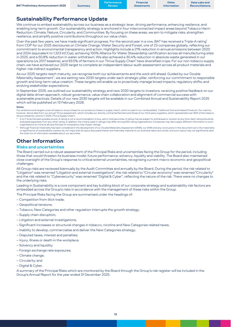 Sustainability Performance Update We continue to embed sustainability across our business as a strategic lever, driving performance, enhancing resilience, and enabling long-term growth. Our sustainability strategy is anchored in four interconnected impact areas beyond Tobacco Harm Reduction: Climate, Nature, Circularity, and Communities. By focusing on these areas, we aim to mitigate risks, strengthen resilience, and amplify positive contributions throughout our value chain. Over the past few years, we have made significant progress. For the second year in a row, BAT has received a Triple-A rating* from CDP for our 2025 disclosures on Climate Change, Water Security and Forest, one of 23 companies globally, reflecting our commitment to environmental transparency and action. Highlights include a 21% reduction in annual emissions between 2020 and 2024 (equivalent to 1,323 ktCO₂e), achieving 100% Alliance for Water Stewardship certification across all manufacturing sites in 2025, and a 50.8% reduction in water withdrawn. We also achieved a 30.4% reduction in absolute waste generated in our operations (vs 2017 baseline), and 93.5% of farmers in our Thrive Supply Chain1 have diversified crops. For our non-tobacco supply chain, we have achieved our 2025 target to complete an independent labour audit assessment across all product materials and higher-risk indirect suppliers. As our 2025 targets reach maturity, we recognise both our achievements and the work still ahead. Guided by our Double Materiality Assessment^, we are setting new 2030 targets under each strategic pillar, reinforcing our commitment to responsible growth and long-term value creation. These targets will enable us to proactively manage broad impacts, regulatory shifts, and evolving stakeholder expectations. In September 2025, we outlined our sustainability strategy and new 2030 targets to investors, receiving positive feedback on our digital data-driven approach, robust governance, value chain collaboration and alignment of commercial success with sustainable practices. Details of our new 2030 targets will be available in our Combined Annual and Sustainability Report 2025 which will be published on 13 February 2026. Notes: Our ambitions and targets cover all tobacco we purchase for our products (‘tobacco supply chain’), which is used in our combustibles, Traditional Oral and Heated Products. Our metrics, however, derive data from our annual Thrive assessment, which includes our directly contracted farmers and those of our third-party suppliers, which represented over 94% of the tobacco we purchased by volume in 2025 (‘Thrive Supply Chain’). * A to F (A as the best possible score). A rating is not a recommendation to buy, sell or hold securities. A rating may be subject to withdrawal or revision at any time. Each rating should be evaluated separately from any other rating. In addition, the criteria used in ratings may differ among ESG rating organisations. Companies may also supply different information to such organisations (or none at all) and this lack of consistency may impact ratings. ^ Although financial materiality has been considered in the development of our Double Materiality Assessment (DMA), our DMA and any conclusions in this document as to the materiality or significance of sustainability matters do not imply that all topics discussed therein are financially material to our business taken as a whole, and such topics may not significantly alter the total mix of information available about our securities. Other Information Risks and uncertainties The Board carried out a robust assessment of the Principal Risks and uncertainties facing the Group for the period, including those that would threaten its business model, future performance, solvency, liquidity and viability. The Board also maintained close oversight of the Group’s response to critical external uncertainties, recognising current macro-economic and geopolitical challenges. All Group risks are reviewed biannually by the Audit Committee and annually by the Board. During the period, the risk related to "Litigation" was renamed "Litigation and external investigations", the risk related to "Circular economy" was renamed "Circularity" and the risk related to “Cybersecurity” was renamed “Digital & Cyber”, reflecting the nature of the risk. There were no changes to the underlying risks. Leading in Sustainability is a core component and key building block of our corporate strategy and sustainability risk factors are embedded across the Group's risks in accordance with the management of these risks within the Group. The Principal Risks facing the Group are summarised under the headings of: – Competition from illicit trade; – Geopolitical tensions; – Tobacco, New Categories and other regulation interrupts the growth strategy; – Supply chain disruption; – Litigation and external investigations; – Significant increases or structural changes in tobacco, nicotine and New Categories related taxes; – Inability to develop, commercialise and deliver the New Categories strategy; – Disputed taxes, interest and penalties; – Injury, illness or death in the workplace; – Solvency and liquidity; – Foreign exchange rate exposures; – Climate change; – Circularity; and – Digital & Cyber. A summary of the Principal Risks which are monitored by the Board through the Group’s risk register will be included in the Group's Annual Report for the year ended 31 December 2025. BAT Preliminary Announcement 2025 Summary Performance Review Financial Statements Other Information Data Lake and Reconciliations 13