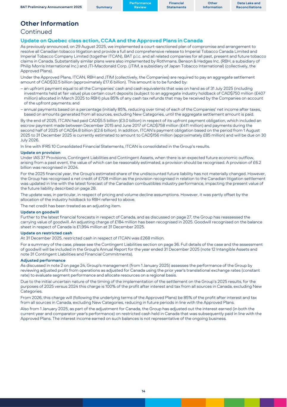 Other Information Continued Update on Quebec class action, CCAA and the Approved Plans in Canada As previously announced, on 29 August 2025, we implemented a court-sanctioned plan of compromise and arrangement to resolve all Canadian tobacco litigation and provide a full and comprehensive release to Imperial Tobacco Canada Limited and Imperial Tobacco Company Limited (together ITCAN), BAT p.l.c. and all related companies for all past, present and future tobacco claims in Canada. Substantially similar plans were also implemented by Rothmans, Benson & Hedges Inc. (RBH, a subsidiary of Philip Morris International Inc.) and JTI-Macdonald Corp. (JTIM, a subsidiary of Japan Tobacco International) (collectively, the Approved Plans). Under the Approved Plans, ITCAN, RBH and JTIM (collectively, the Companies) are required to pay an aggregate settlement amount of CAD$32.5 billion (approximately £17.6 billion). This amount is to be funded by: – an upfront payment equal to all the Companies’ cash and cash equivalents that was on hand as of 31 July 2025 (including investments held at fair value) plus certain court deposits (subject to an aggregate industry holdback of CAD$750 million (£407 million) allocated in March 2025 to RBH) plus 85% of any cash tax refunds that may be received by the Companies on account of the upfront payments; and – annual payments based on a percentage (initially 85%, reducing over time) of each of the Companies’ net income after taxes, based on amounts generated from all sources, excluding New Categories, until the aggregate settlement amount is paid. By the end of 2025, ITCAN had paid CAD$5.5 billion (£3.0 billion) in respect of its upfront payment obligation, which included an escrow payment made between December 2015 and June 2017 of CAD$758 million (£411 million) and payments during the second half of 2025 of CAD$4.8 billion (£2.6 billion). In addition, ITCAN’s payment obligation based on the period from 1 August 2025 to 31 December 2025 is currently estimated to amount to CAD$156 million (approximately £85 million) and will be due on 30 July 2026. In line with IFRS 10 Consolidated Financial Statements, ITCAN is consolidated in the Group’s results. Update on provision Under IAS 37 Provisions, Contingent Liabilities and Contingent Assets, when there is an expected future economic outflow, arising from a past event, the value of which can be reasonably estimated, a provision should be recognised. A provision of £6.2 billion was recognised in 2024. For the 2025 financial year, the Group's estimated share of the undiscounted future liability has not materially changed. However, the Group has recognised a net credit of £708 million as the provision recognised in relation to the Canadian litigation settlement was updated in line with the latest forecast of the Canadian combustibles industry performance, impacting the present value of the future liability described on page 28. The update was, in particular, in respect of pricing and volume decline assumptions. However, it was partly offset by the allocation of the industry holdback to RBH referred to above. The net credit has been treated as an adjusting item. Update on goodwill Further to the latest financial forecasts in respect of Canada, and as discussed on page 27, the Group has reassessed the carrying value of goodwill. An adjusting charge of £184 million has been recognised in 2025. Goodwill recognised on the balance sheet in respect of Canada is £1,994 million at 31 December 2025. Update on restricted cash At 31 December 2025, restricted cash in respect of ITCAN was £268 million. For a summary of the case, please see the Contingent Liabilities section on page 36. Full details of the case and the assessment of goodwill will be included in the Group's Annual Report for the year ended 31 December 2025 (note 12 Intangible Assets and note 31 Contingent Liabilities and Financial Commitments). Adjusted performance As discussed in note 2 on page 24, Group's management (from 1 January 2025) assesses the performance of the Group by reviewing adjusted profit from operations as adjusted for Canada using the prior year's translational exchange rates (constant rate) to evaluate segment performance and allocate resources on a regional basis. Due to the initial uncertain nature of the timing of the implementation of the settlement on the Group’s 2025 results, for the purposes of 2025 versus 2024 this charge is 100% of the profit after interest and tax from all sources in Canada, excluding New Categories. From 2026, this charge will (following the underlying terms of the Approved Plans) be 85% of the profit after interest and tax from all sources in Canada, excluding New Categories, reducing in future periods in line with the Approved Plans. Also from 1 January 2025, as part of the adjustment for Canada, the Group has adjusted out the interest earned (in both the current year and comparator year's performance) on restricted cash held in Canada that was subsequently paid in line with the Approved Plans. The interest income earned on such balances is not representative of the ongoing business. BAT Preliminary Announcement 2025 Summary Performance Review Financial Statements Other Information Data Lake and Reconciliations 14